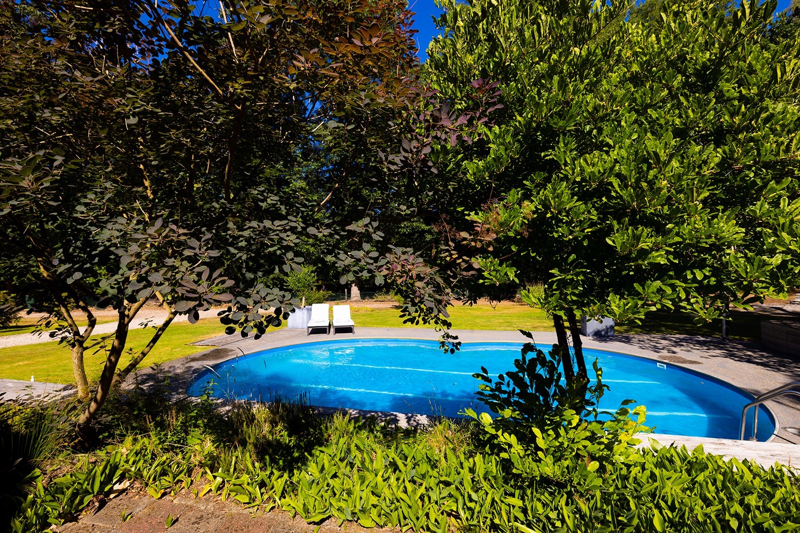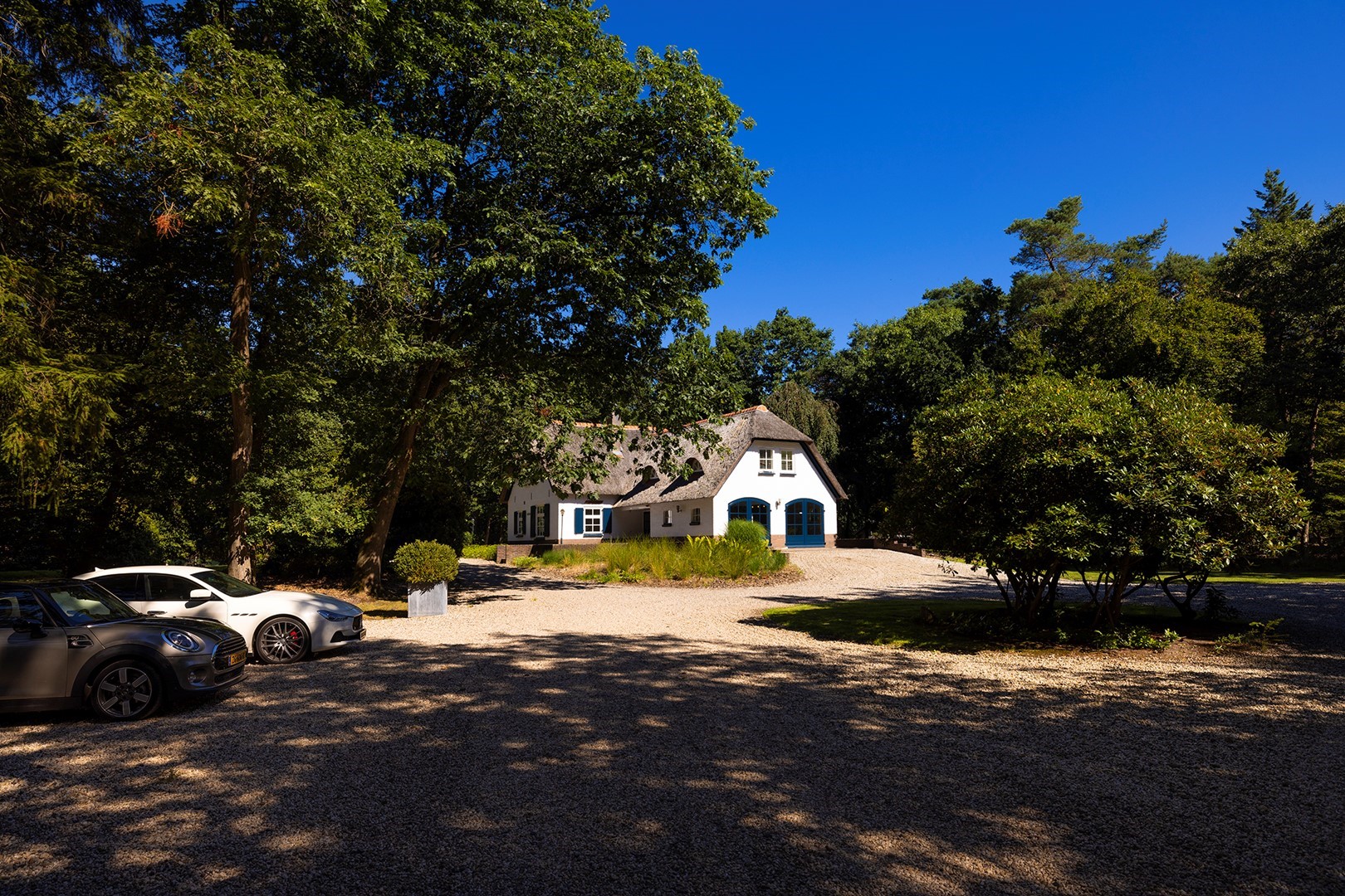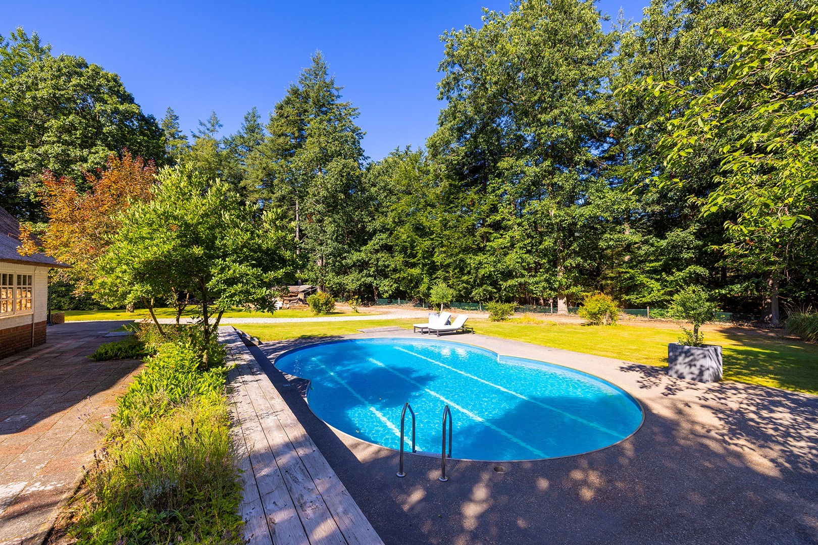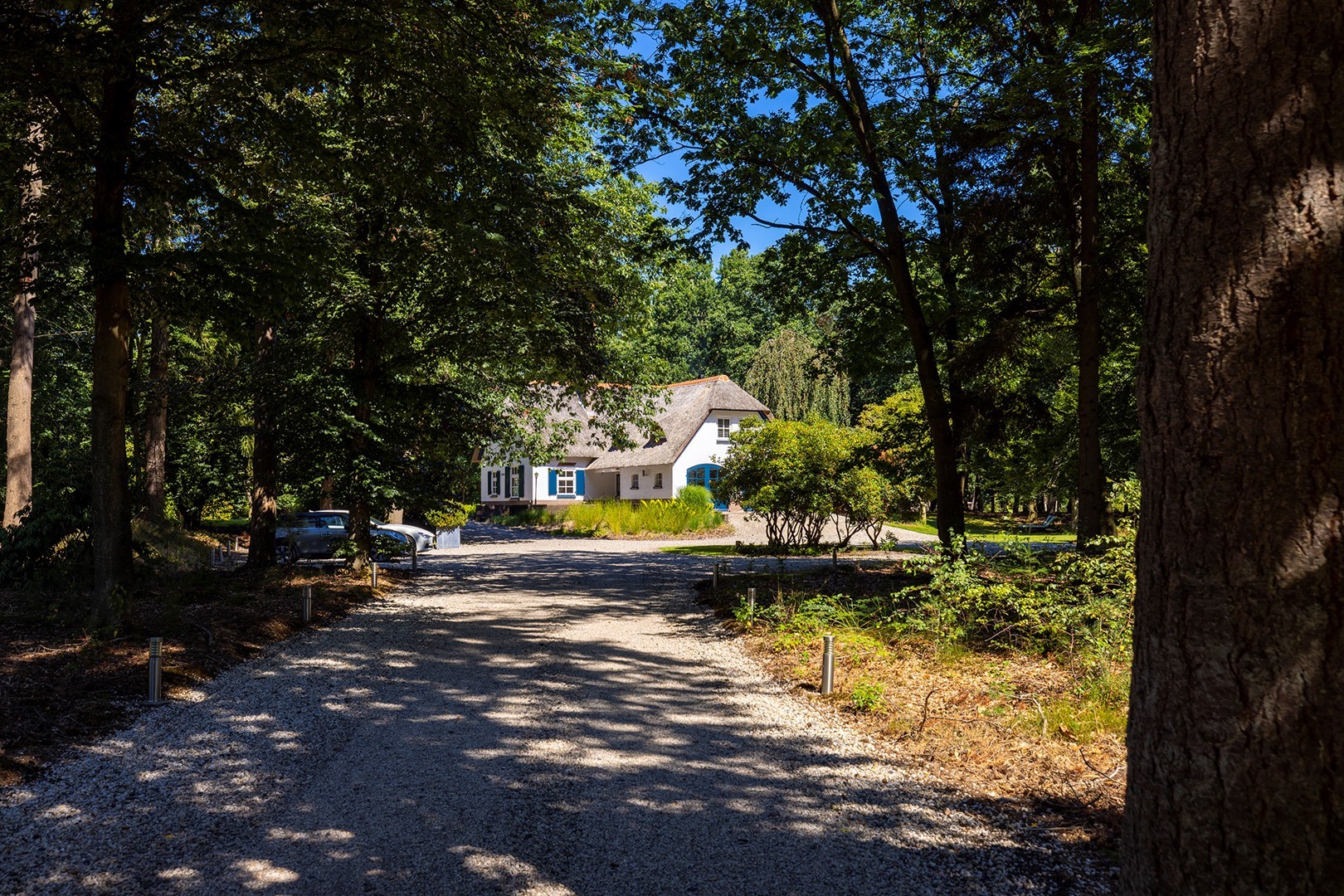 Zodra u door de toegangspoort het terrein oprijdt, ervaart u de enorme ruimte en royale opzet van dit perceel! Meerdere auto’s kunt u hier met gemak parkeren, het pad loopt langs de gehele woning en slingert langs de bomen tot aan de achterzijde van deze wonderschone locatie.