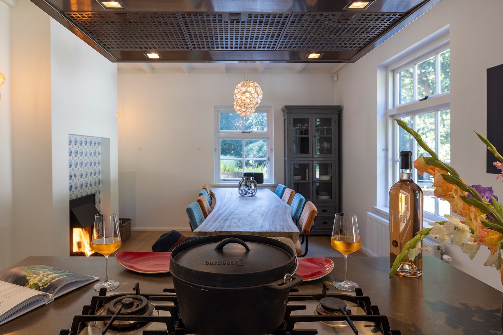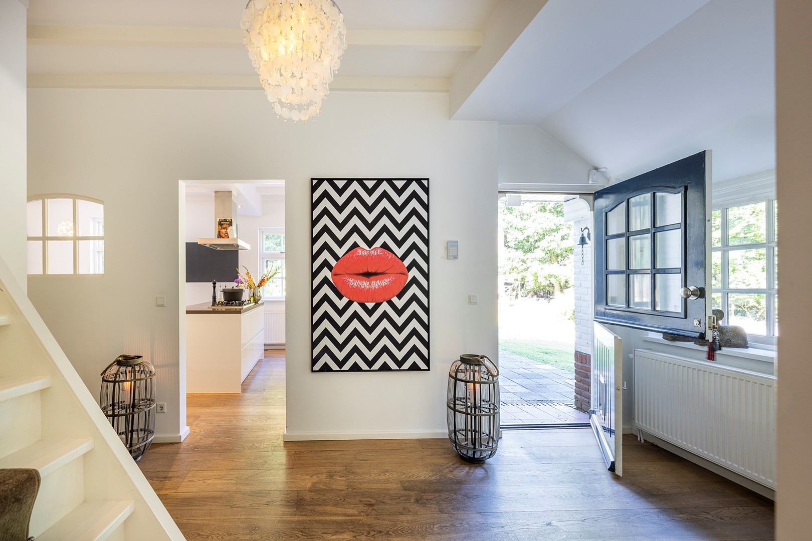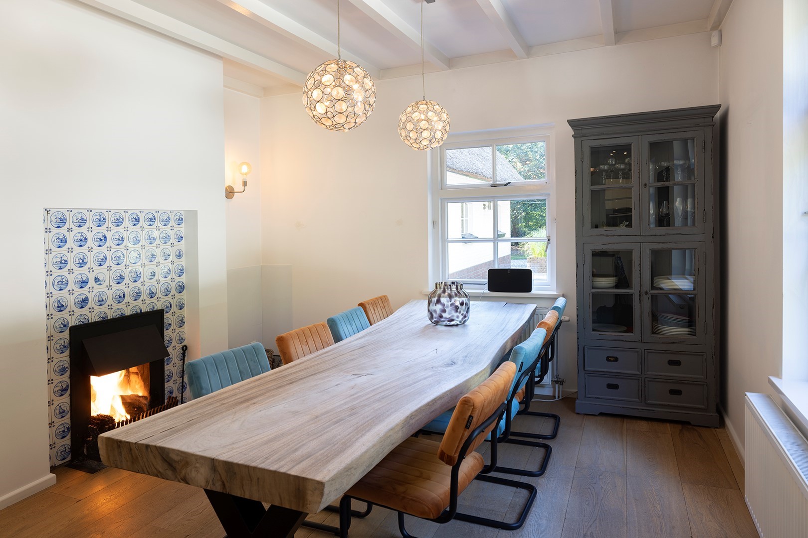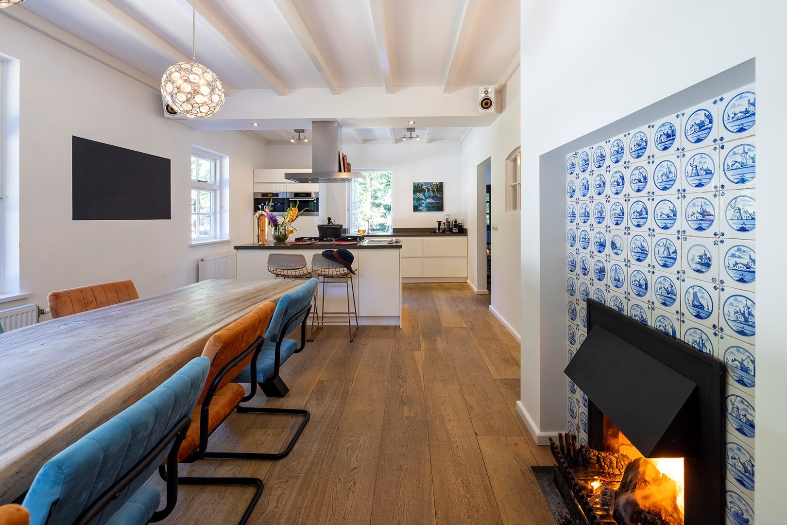 Aangekomen bij de overdekte entree, stapt u door de boerendeur (bestaande uit een boven- en een onderdeur) de woning binnen. Samen met de sfeervolle luiken, de ramen met roedeverdeling, de prachtige plafonds met houten balken, de paneeldeuren en de authentieke stalramen zijn dit de elementen die de historie van de woning weergeven. De houten vloerdelen vormen een prettig contrast met de witte muren. Het ruime toilet met fonteintje is voorzien van een rustige kleurstelling in wit-antraciet. De ruime woonkeuken is een plek waar u wilt samenkomen met uw gezin/familie en/of vrienden! Ook hier de ultieme combinatie van een moderne keuken met kookeiland en een klassieke open haard voorzien van oudhollandse tegeltjes in Delfts blauw. In de keuken is de volgende inbouwapparatuur aanwezig: Borreti 5-pits gasfornuis, vaatwasser, koffiemachine, combi oven-magnetron, vriezer en koelkast.