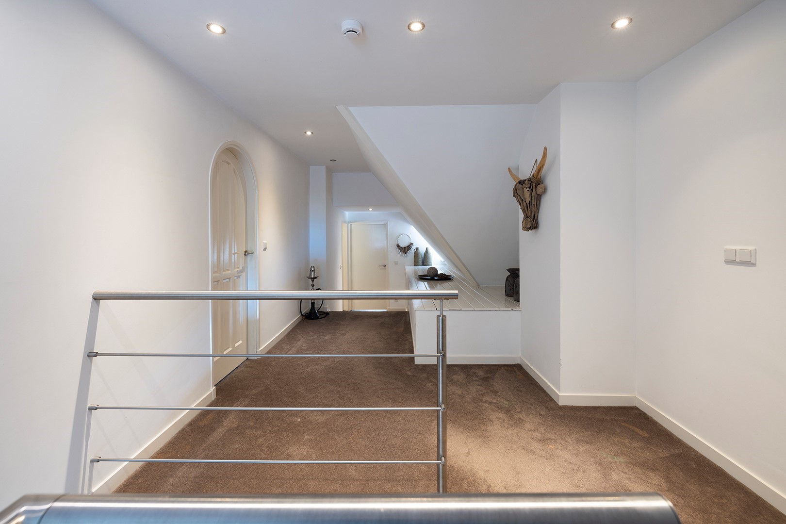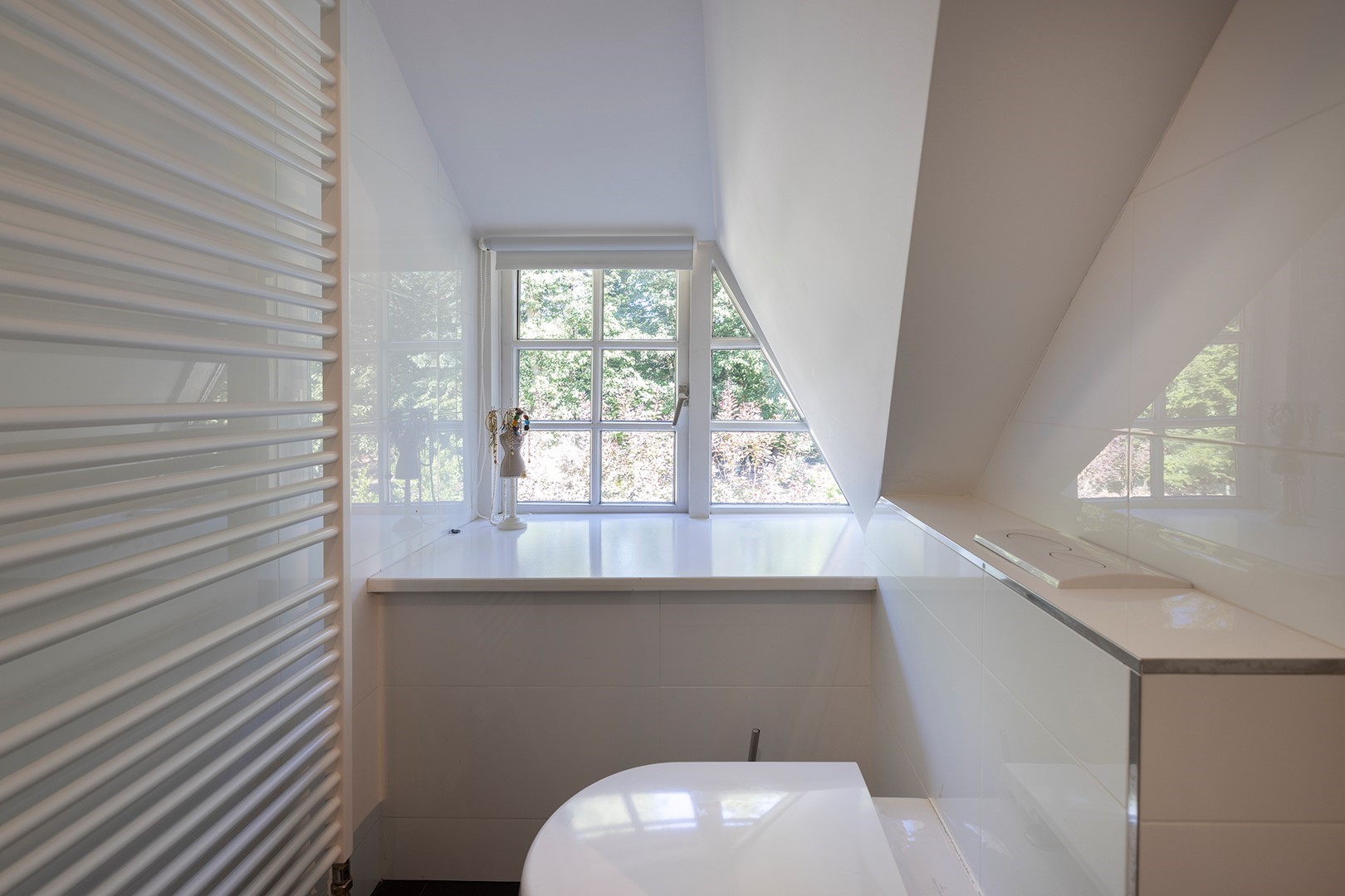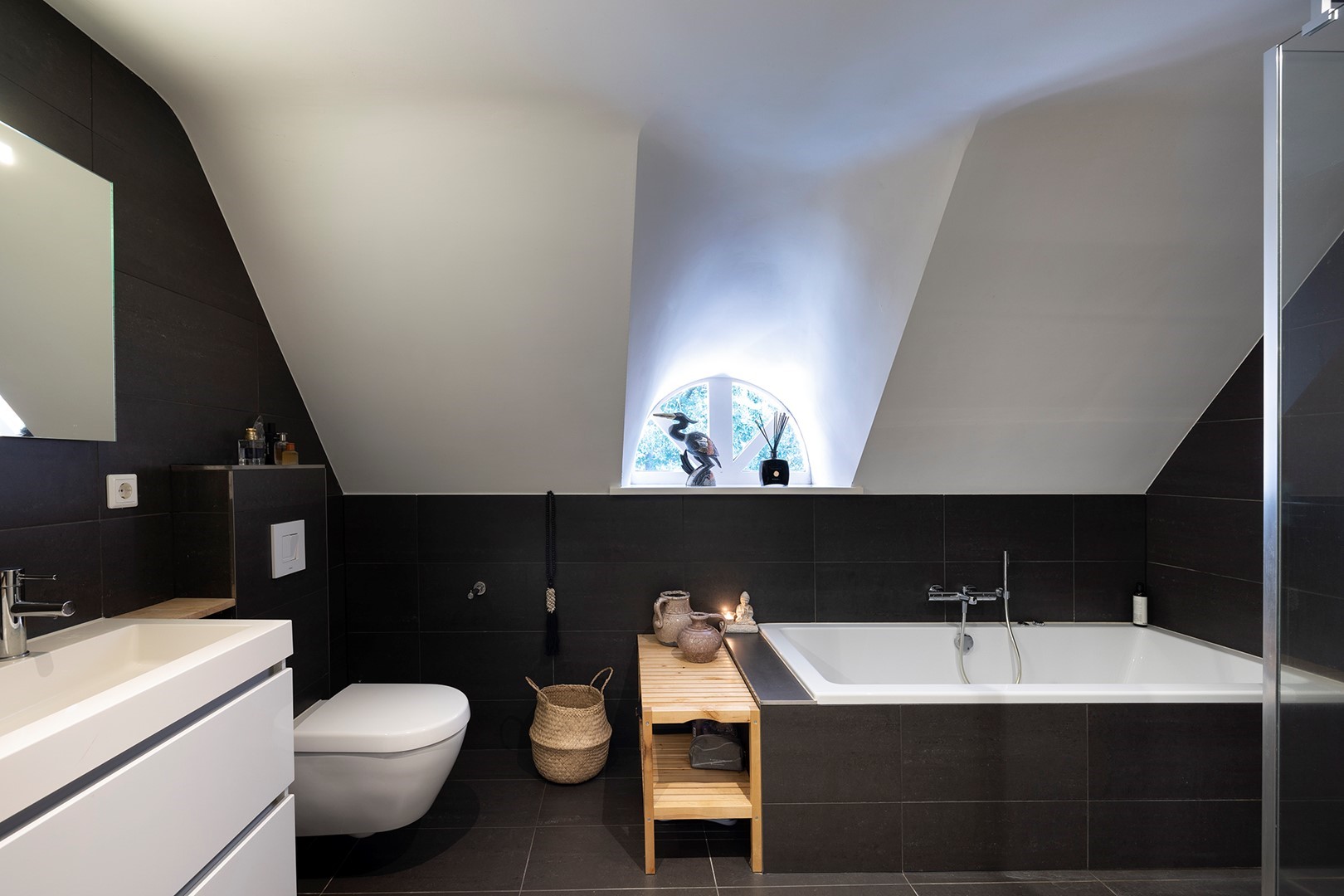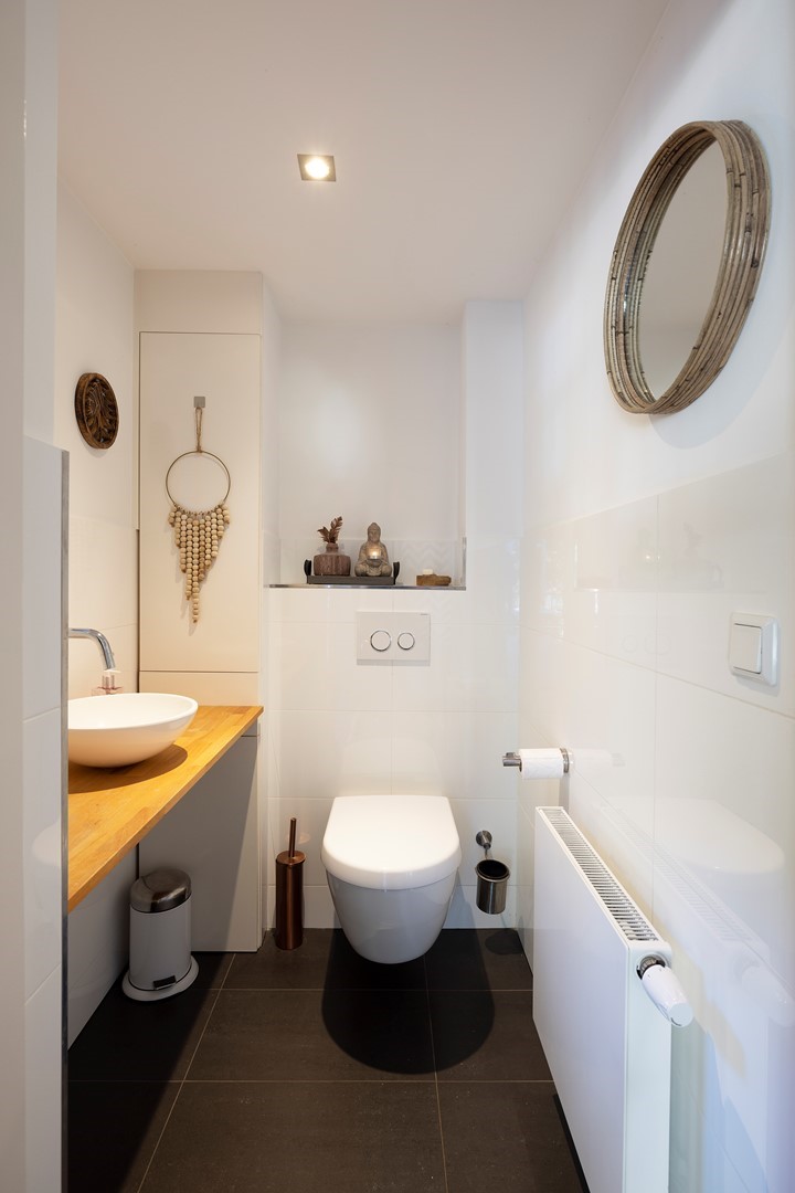 De houten trap biedt toegang tot de eerste verdieping met 3 slaapkamers en 2 badkamers en een ruime overloop met creatieve oplossing voor het creëren van bergruimte. Opvallend zijn de authentieke ronde deuren die ook hier zorgen voor een mooi contrast met de strakke wanden en plafonds met led spots. De eerste kamer bevindt zich aan de voorzijde van de woning. Deze ruimte is multifunctioneel: logeerkamer, wasruimte ( aansluiting voor wasmachine en droger) en kleedkamer door de royale inloopkast. De tweede slaapkamer is aan de achterzijde van de woning met ook hier een waanzinnig uitzicht! Deze zeer ruime kamer heeft een eigen badkamer voorzien van inloopdouche met regendouche en normale douche, wastafel, design radiator en toilet. De badkamer is geheel betegeld in opnieuw de rustige kleurstelling wit-antraciet.