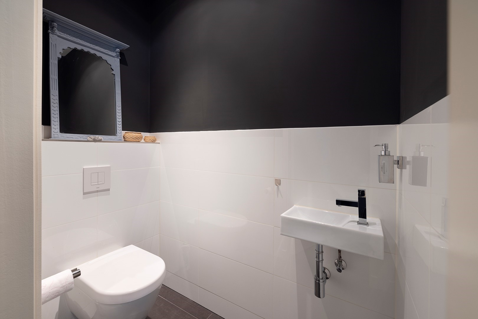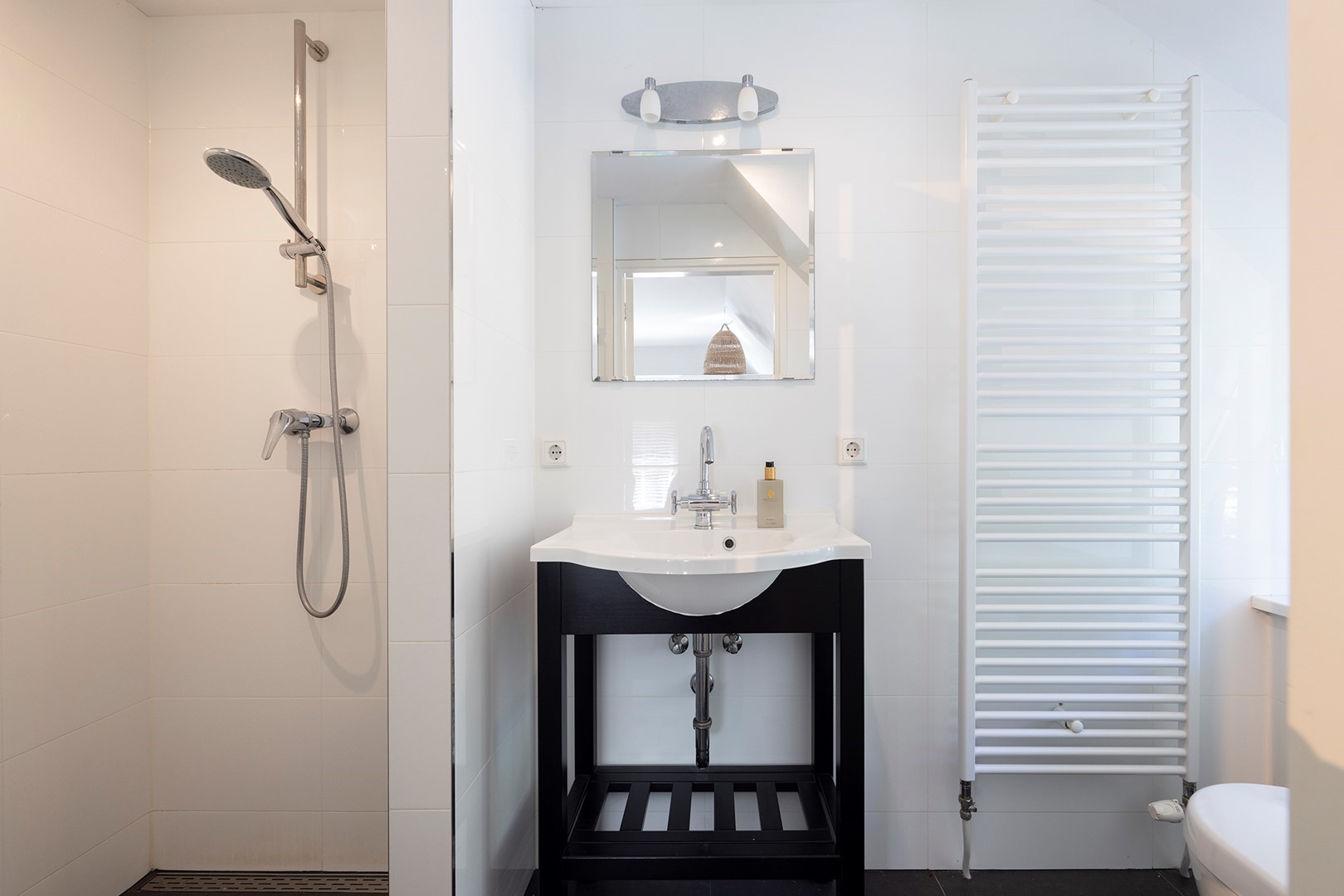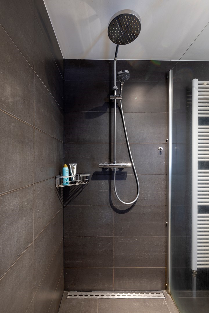 Het kleine hoogteverschil met de badkamer en master bedroom is speels opgelost middels enkele traptreden. De moderne badkamer is geheel betegeld en heeft een badmeubel met dubbele kraan, toilet, design radiator, ruime inloopdouche en bad met whirlpool.