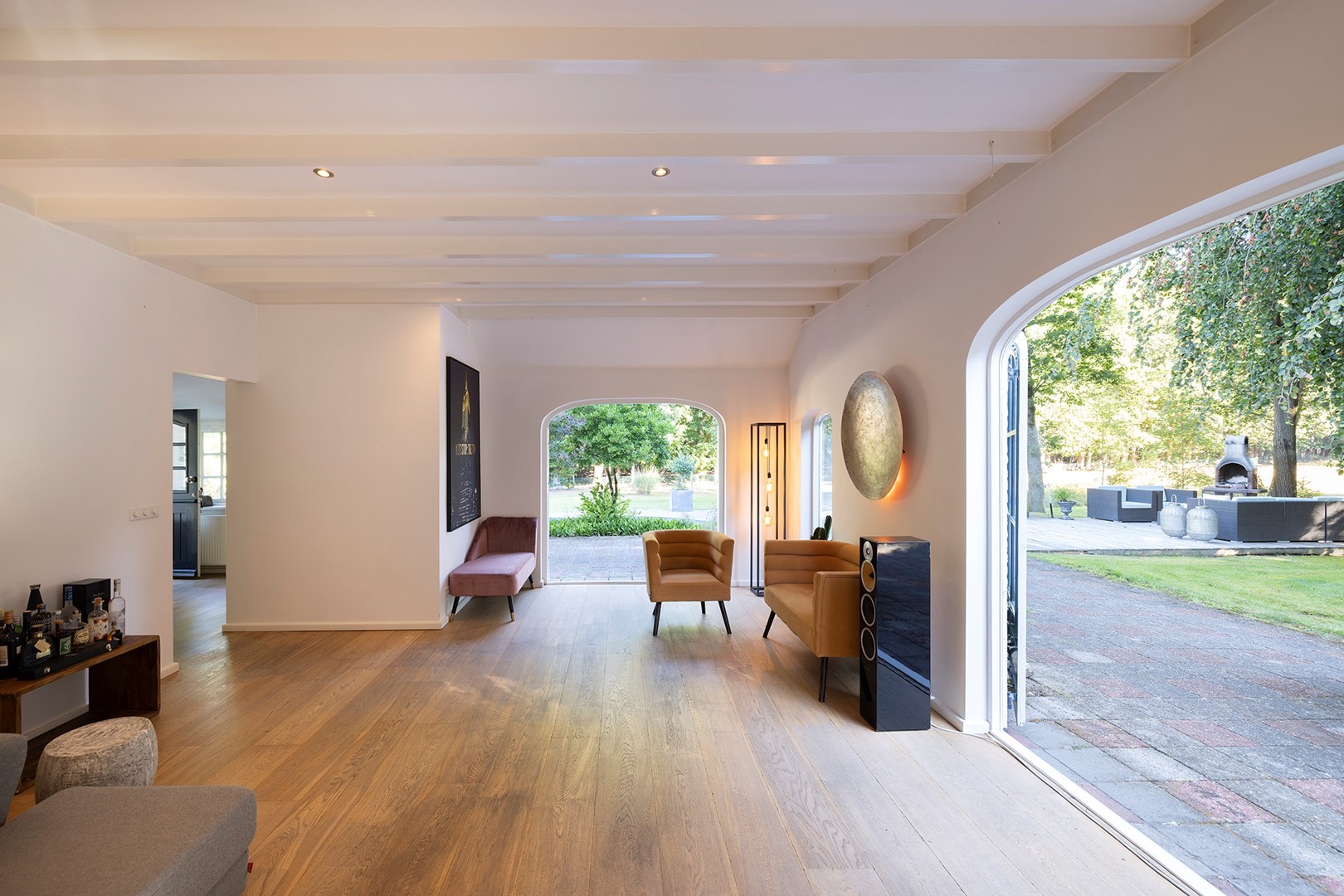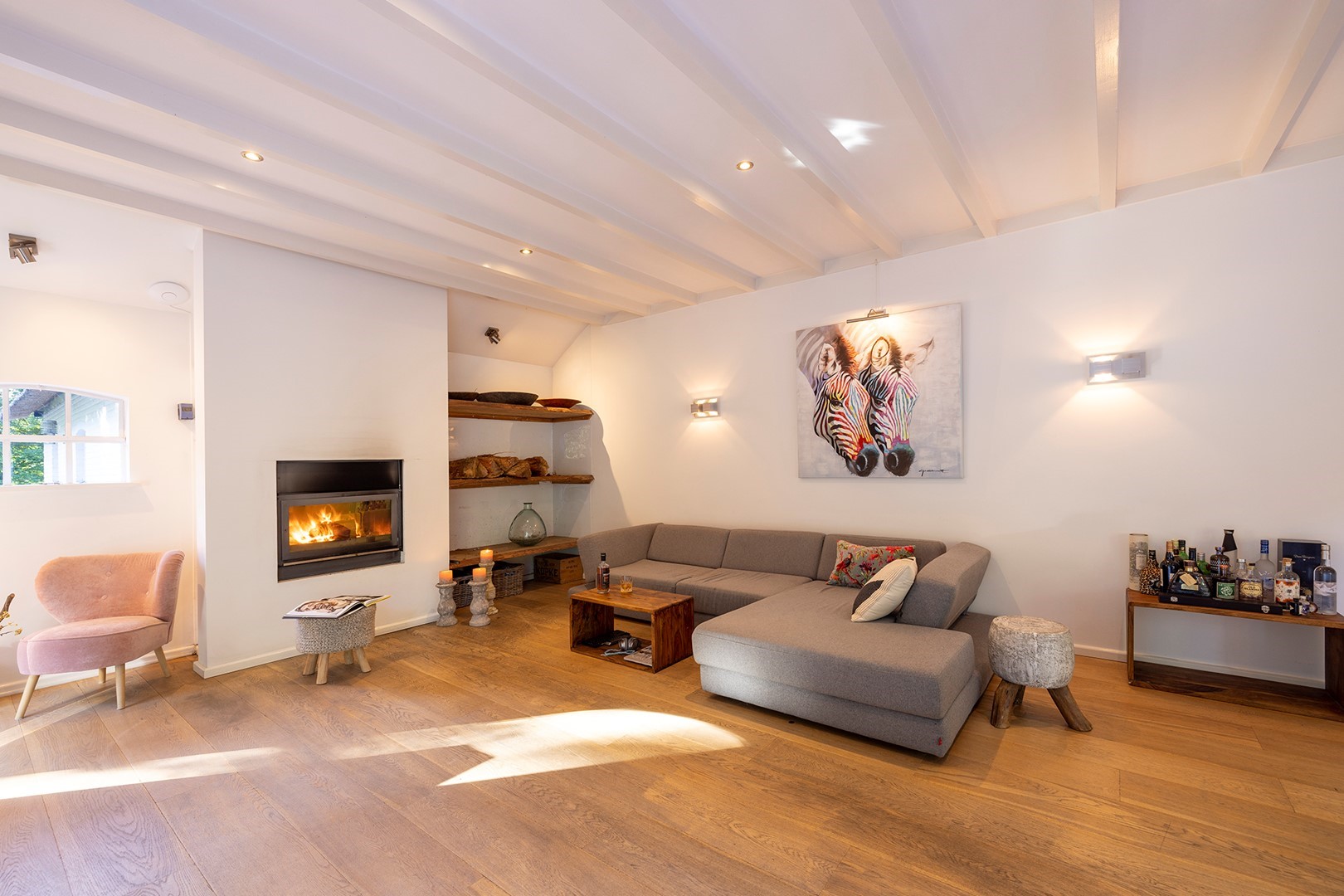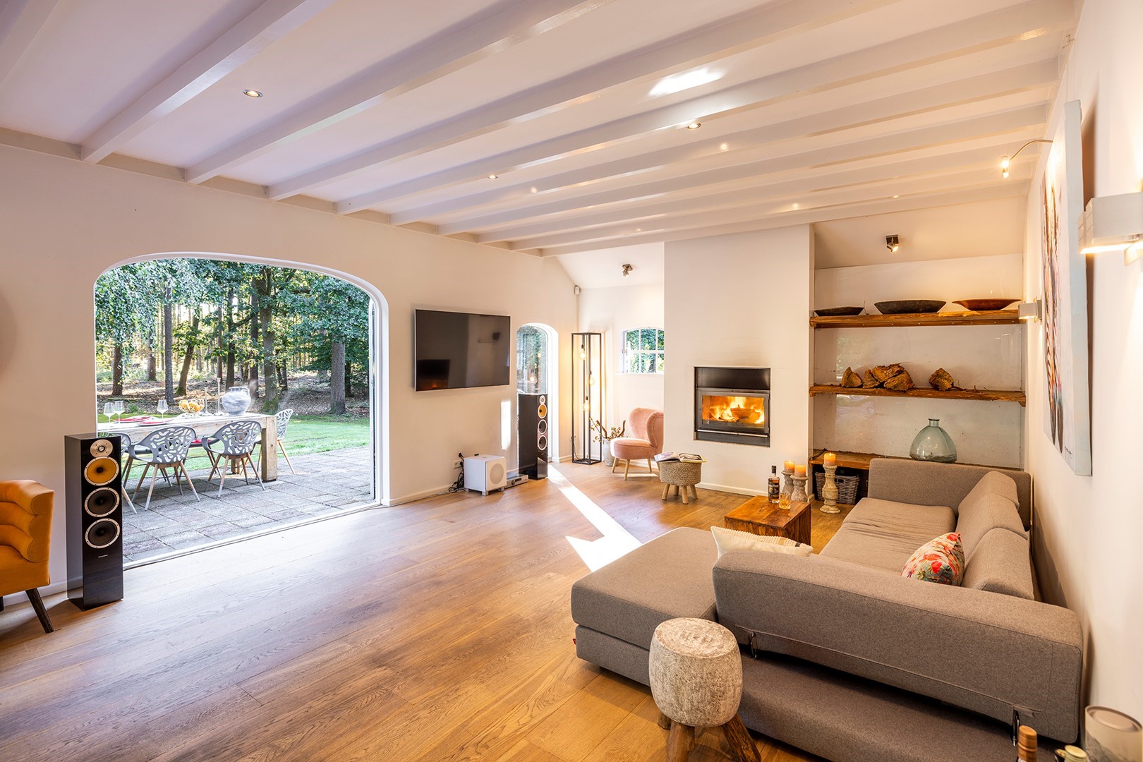 De living met houten balkenplafond is aan de achterzijde van de woning. Om het buitenleven en -gevoel naar binnen te halen, zijn er meerdere openslaande deuren. Ook zijn de voormalige staldeuren geheel voorzien van glas. Door het ruime oppervlakte zijn er meerdere zithoeken gecreëerd. In deze living is vloerverwarming als ook een CV houtkachel.