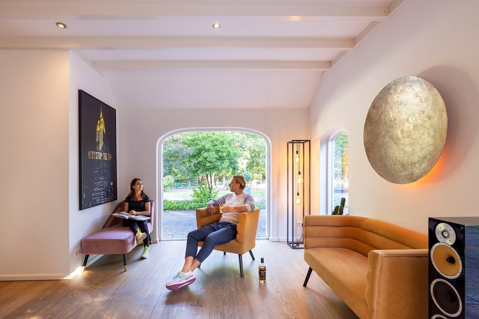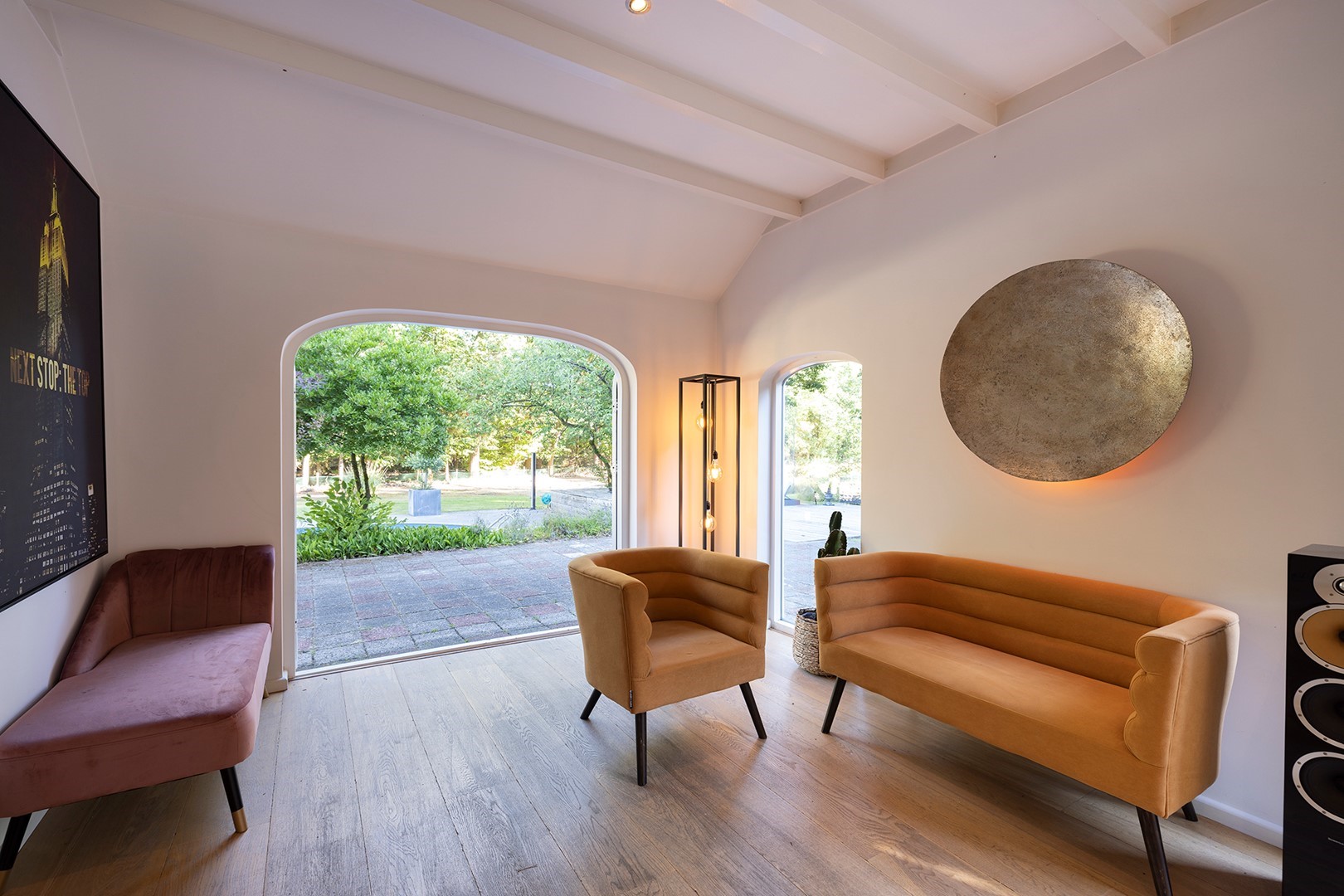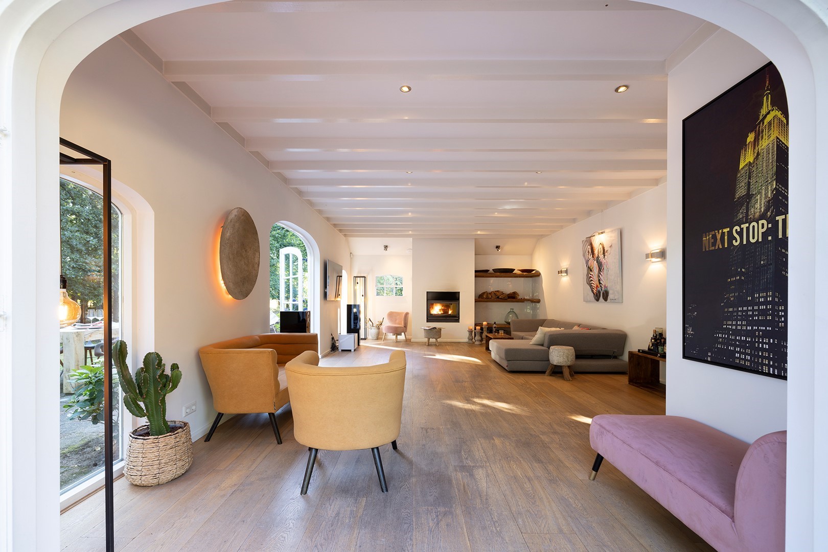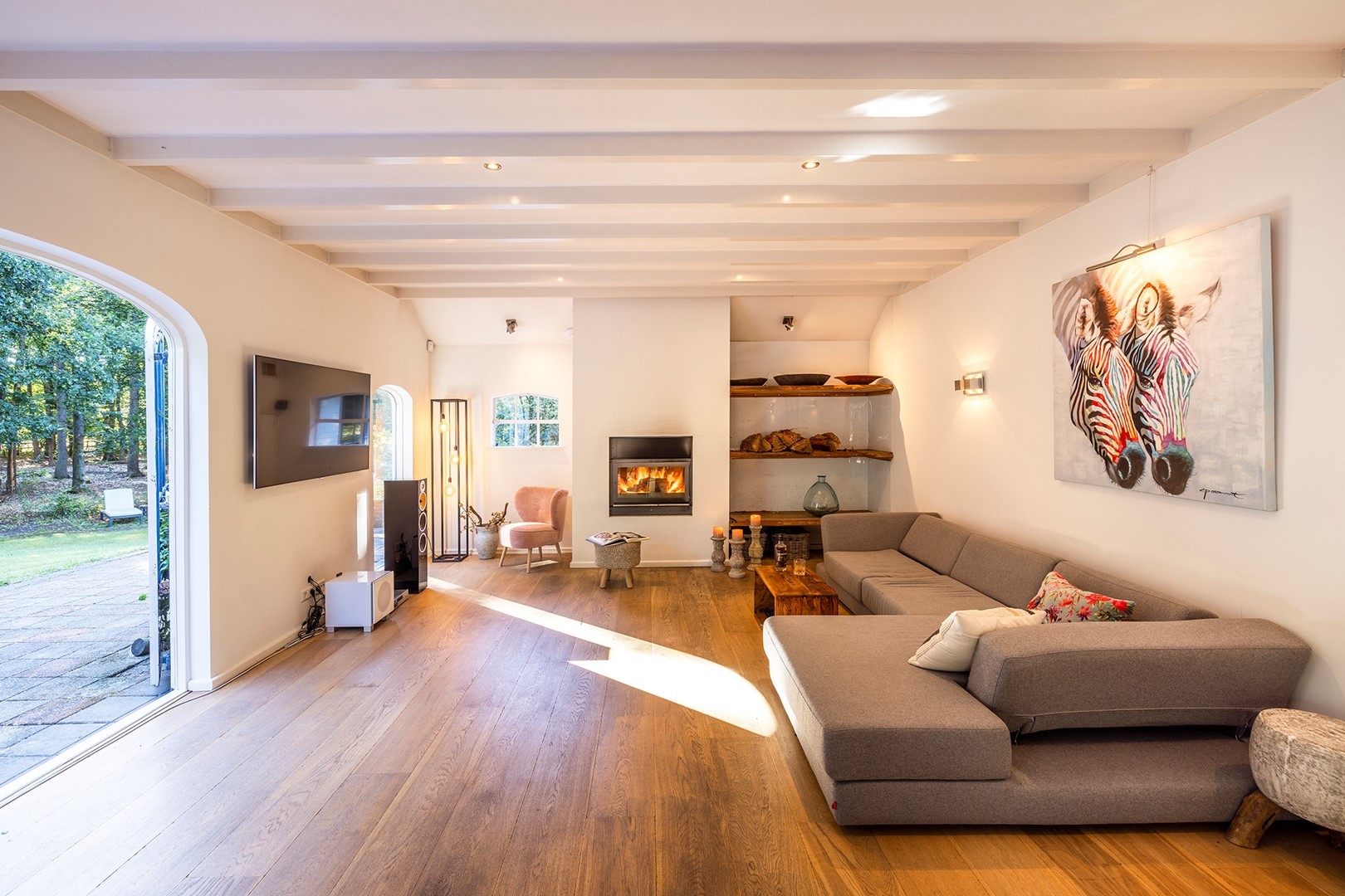 De living met houten balkenplafond is aan de achterzijde van de woning. Om het buitenleven en -gevoel naar binnen te halen, zijn er meerdere openslaande deuren. Ook zijn de voormalige staldeuren geheel voorzien van glas. Door het ruime oppervlakte zijn er meerdere zithoeken gecreëerd. In deze living is vloerverwarming als ook een CV houtkachel.