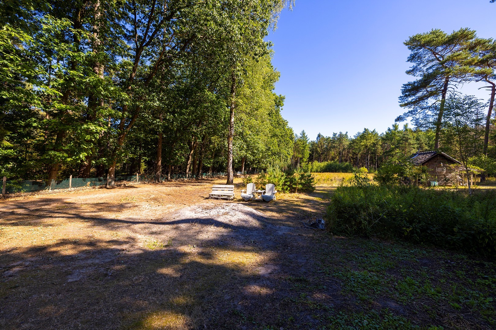 Het gehele perceel is omzoomd door hoge loof- en naaldbomen wat zorgt voor optimale privacy. Rondom de gehele woning is een ruim terras als ook een prachtige gazonpartij wat naadloos overloopt in weide en bos. Op de plek waar nu de weide is, was voorheen een paardenwei voor 2 paarden. De voormalige paardenstal is afgebroken en er is voormelding voor vergunning om een groot bijgebouw te plaatsen met de afmetingen van 132 m2. Verder staat er een houten schuurtje bij de weide en is er nog een opslag voor hout en gereedschap.