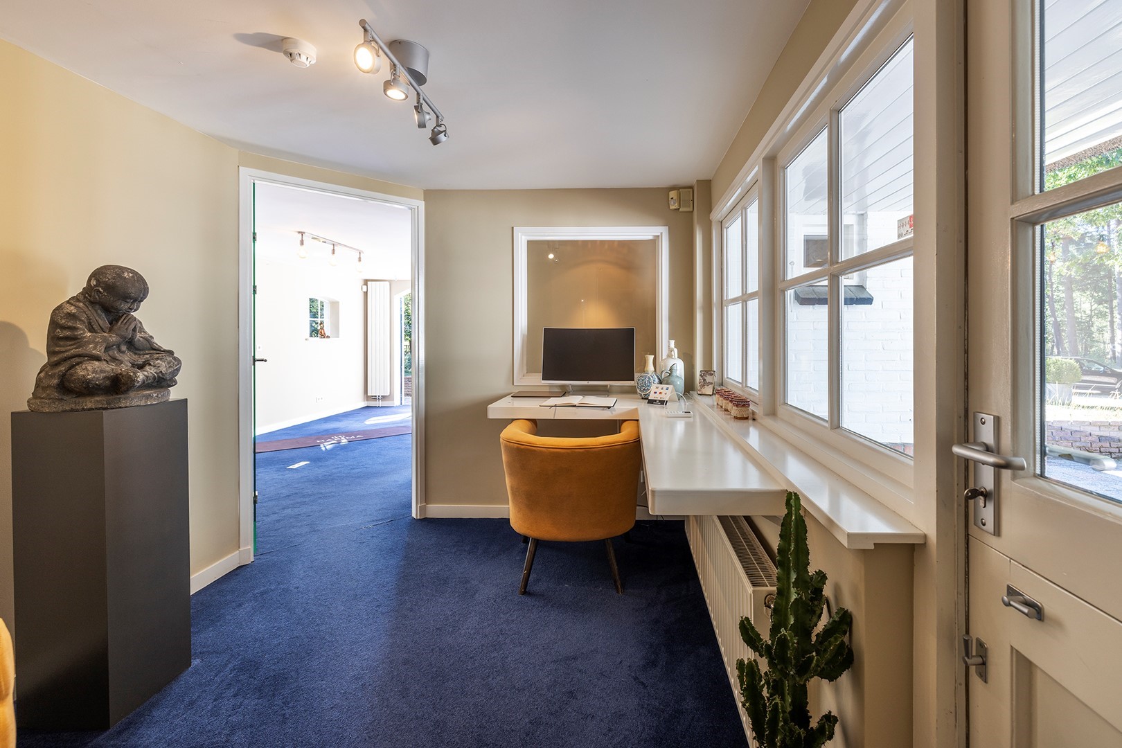 In de gang is toegang tot de diepe kelder die prima geschikt is voor een wijnkelder of bergruimte. Hier staan verder de 2 opslagvaten van de CV. Om de entree licht en ruim te houden, is er een aparte garderobekamer met doorgang naar het kantoor. Het kantoor is ook separaat bereikbaar middels een eigen buitendeur. Bij binnenkomst treft u een keukenblok, voorzien van vaatwasser en koelkast als ook het toilet met fonteintje. Deze ruimte is voorzien van een apart alarm ( hetzelfde systeem als voor de rest van de woning). Voordat u de grote ruimte bereikt, is er nog een fijne werkplek gecreëerd wat d.m.v. een tussendeur afgesloten kan worden. De grote ruimte met 2 dubbele openslaande deuren biedt mogelijkheden voor kantoor, salon, praktijk, atelier maar uiteraard kunt u hier ook een slaapkamer met badkamer creëren waardoor u de woning levensloopbestendig maakt. Dit gehele deel is onderkelderd en geïsoleerd en is met een vaste trap bereikbaar. Momenteel wordt deze ruimte als werkplek gebruikt. Achter de schuifwanden is veel opbergruimte. Ook is er een zeer royaal werkblad met daaronder ook nog extra opbergruimte. Verder bevindt zich hier de technische ruimte voor o.a. internet/alarm en back up stroomvoorziening.