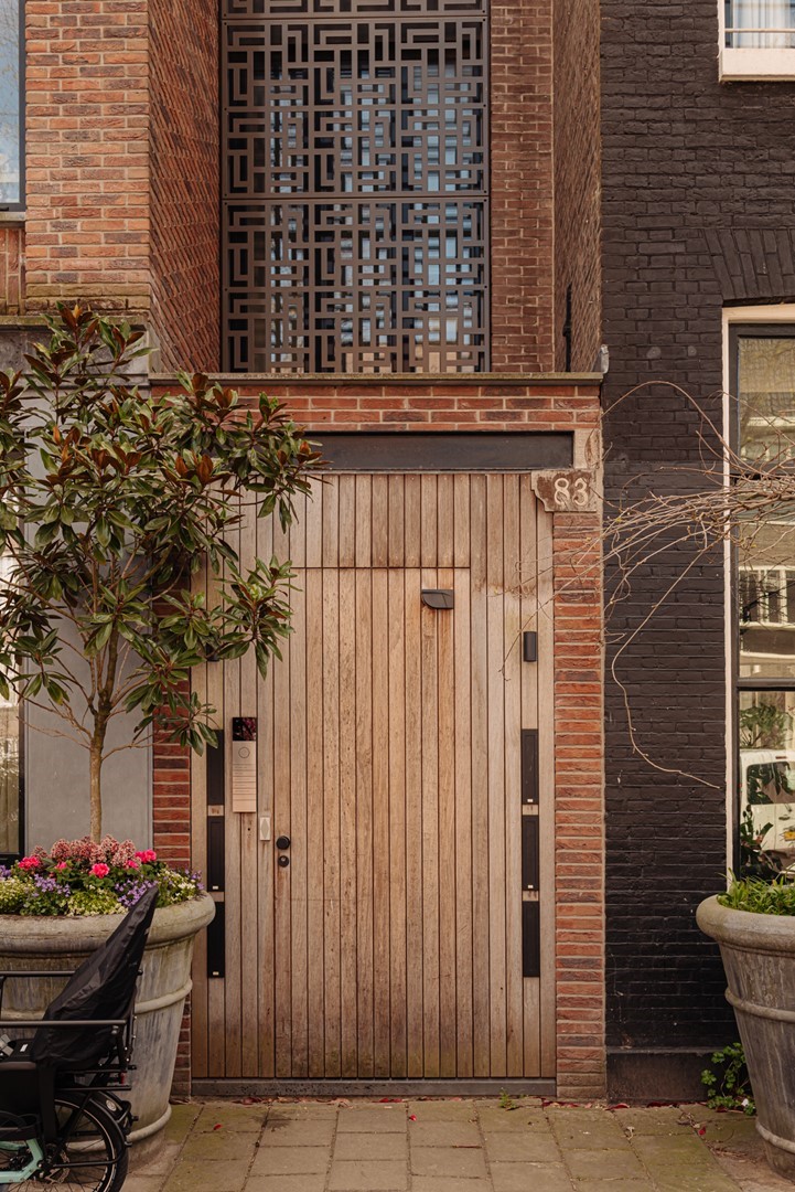 Entry is on the first floor, where a generous living level of approximately 100 m² unfolds. At the front, five large windows span the full width of the façade, flooding the space with light and offering a vibrant view of the lively Lindengracht. At the rear, French doors open onto the south-facing terrace of approximately 14 m² — complete with outdoor kitchen and built-in lounge seating. A sheltered and sunny outdoor space in the heart of the city.