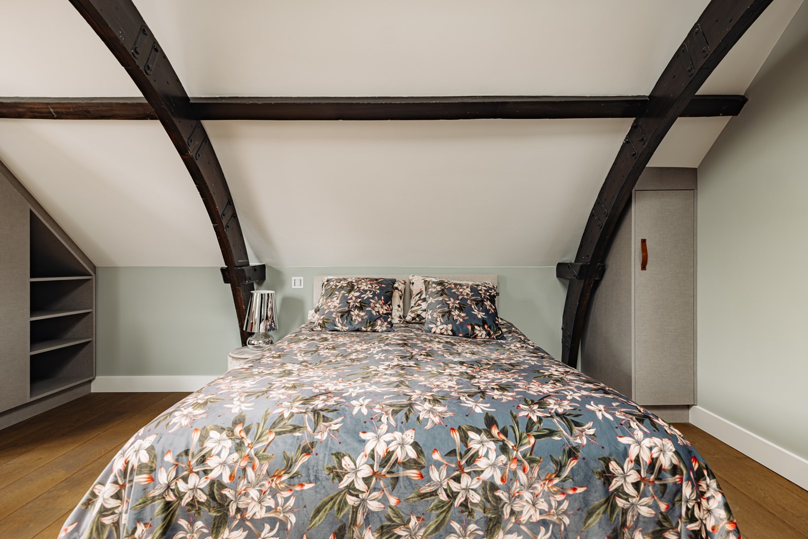 De tweede verdieping – gelegen onder de kap – ademt historie dankzij de zichtbare, halfronde dakspanten. Hier zijn drie slaapkamers, twee badkamers, een apart toilet en een separate wasruimte te vinden. Een zorgvuldig uitgebalanceerd slaapniveau waar hedendaags comfort en authentieke charme samenkomen.