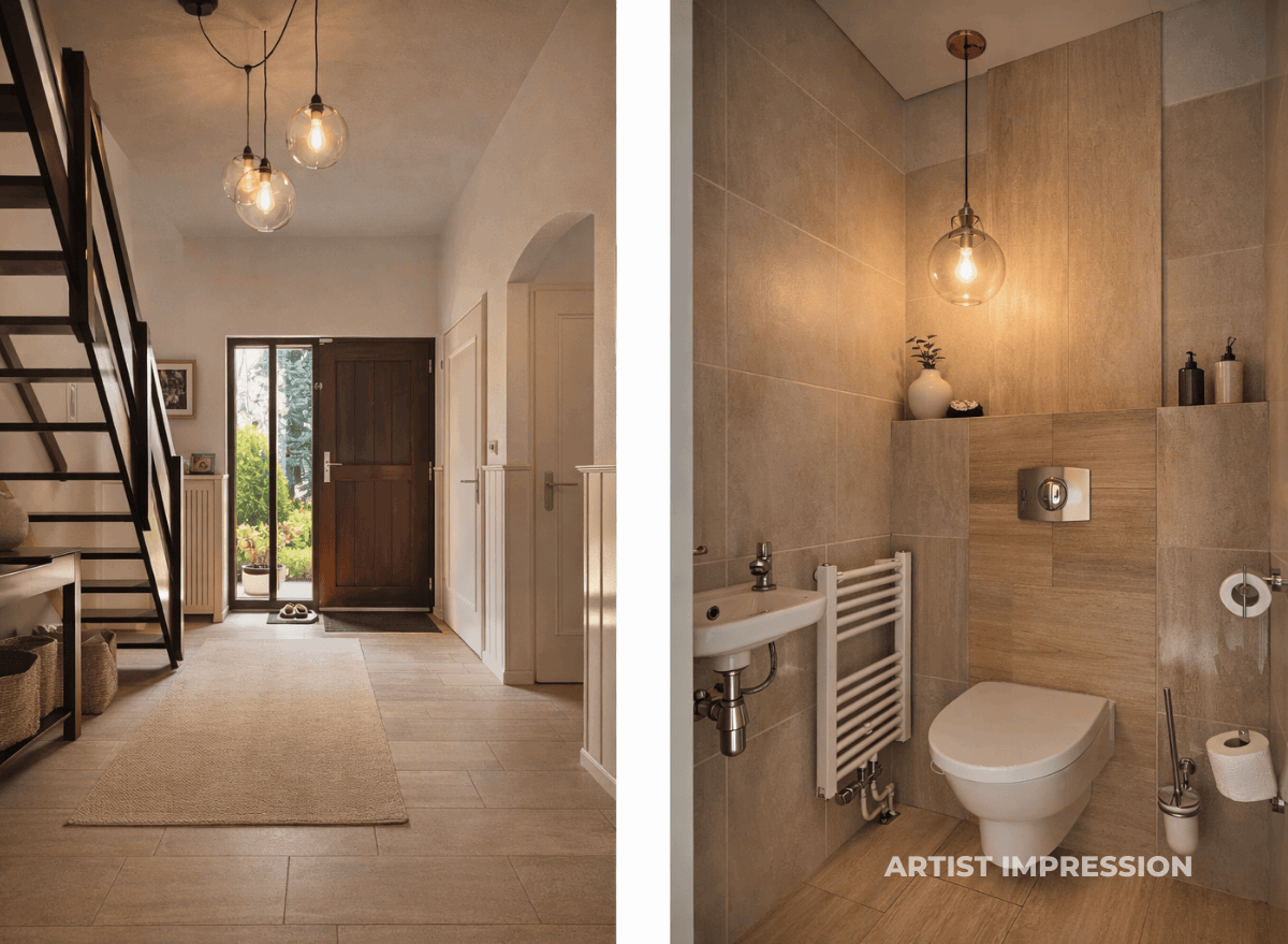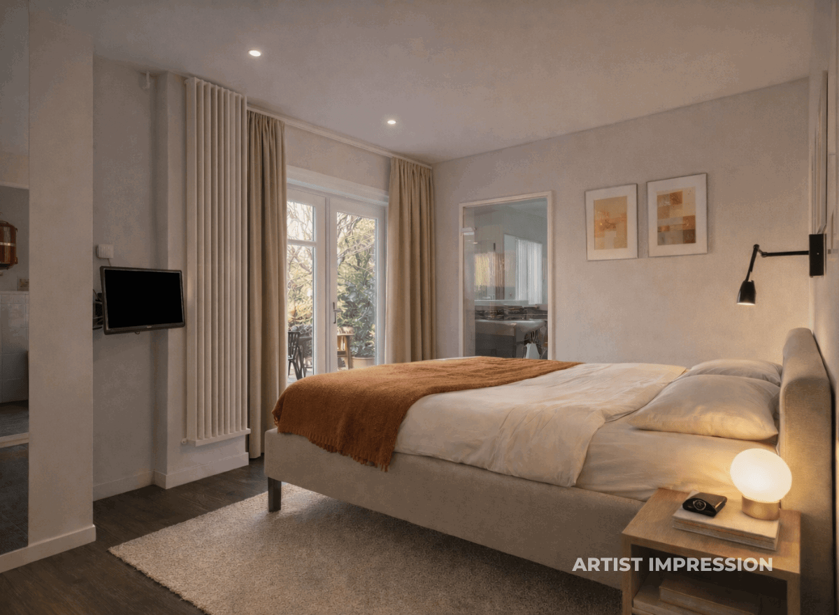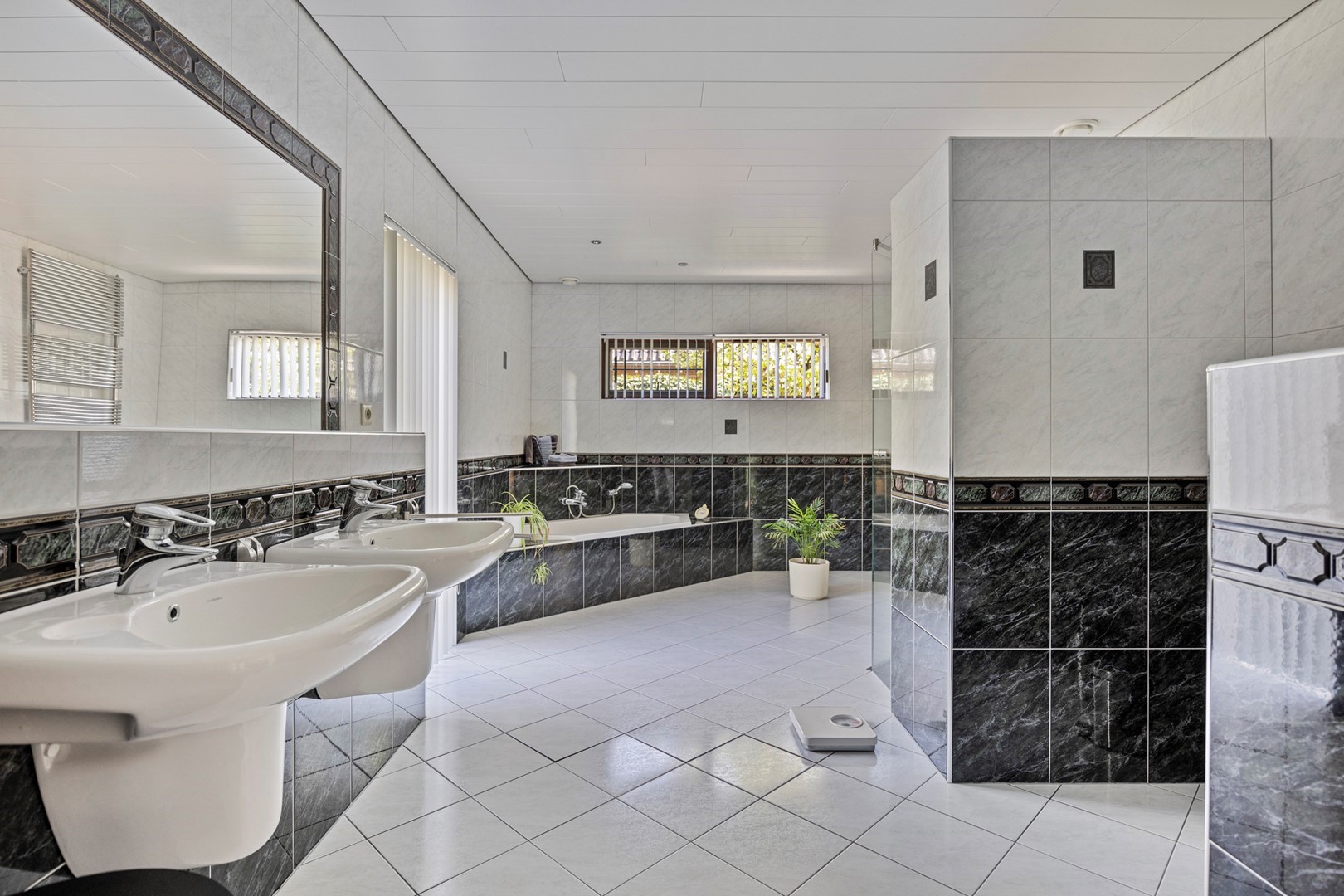 De royale slaapkamer op de begane grond biedt directe toegang tot een complete badkamer met ligbad, separate douche, dubbele wastafel en extra toilet. Op de eerste verdieping bevinden zich drie goed bemeten slaapkamers en een tweede badkamer. Op de overloop is daarnaast een praktische berging aanwezig met de aansluitingen voor wasmachine en droger en de cv-installatie.