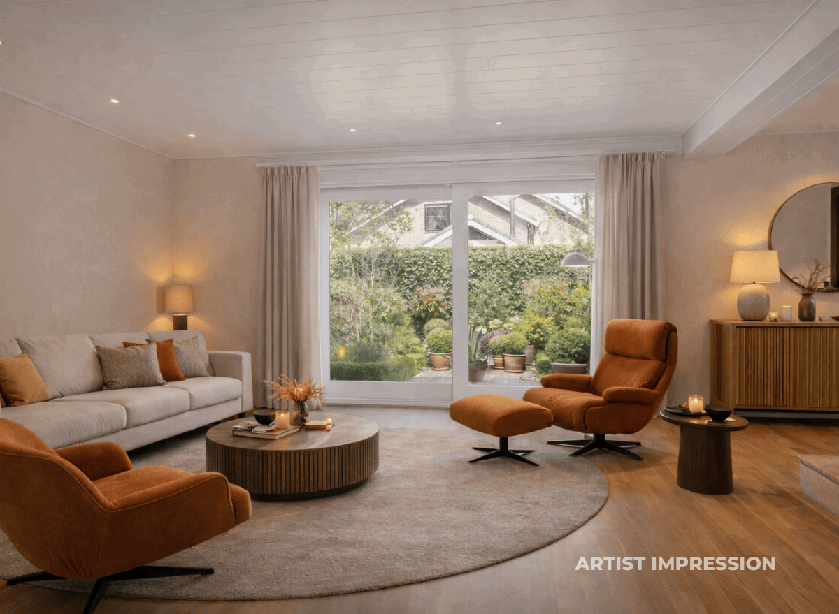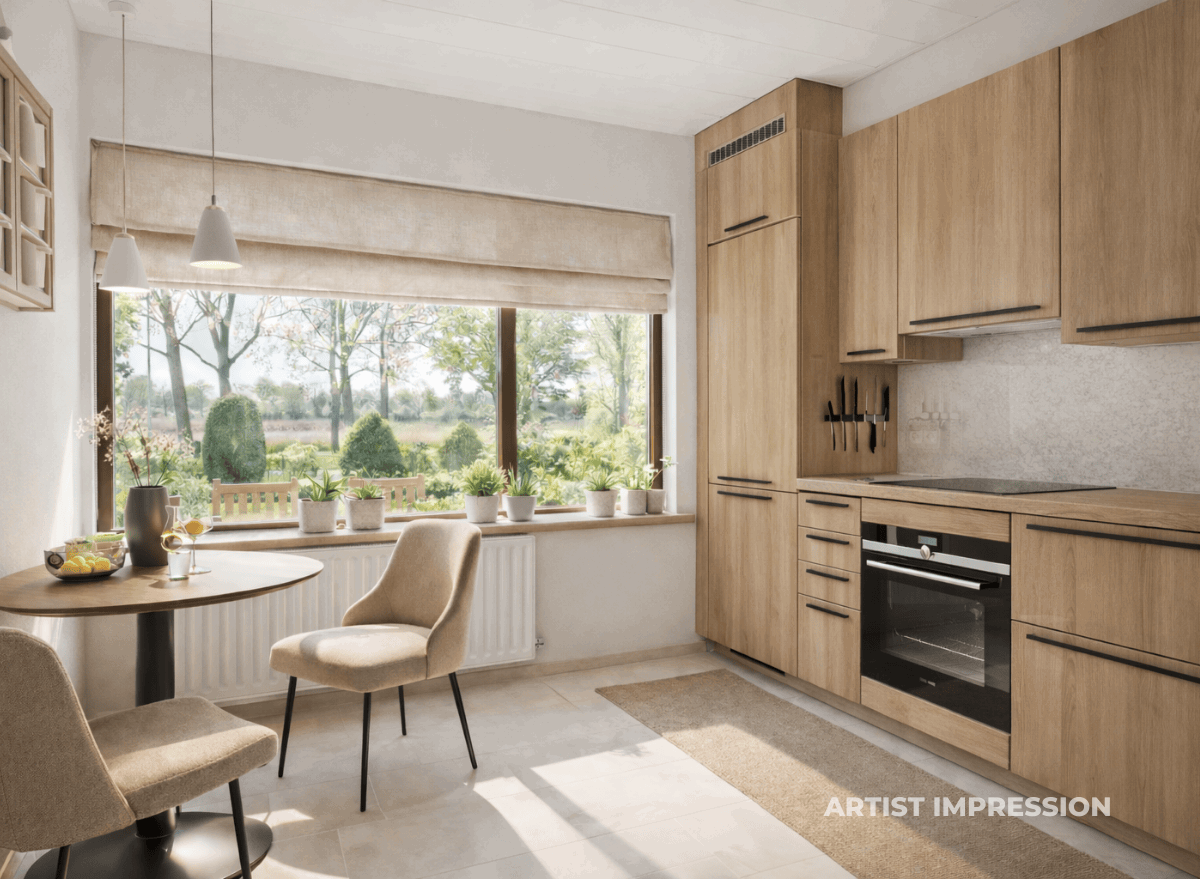 Via de ruime en statige hal zijn de garderobe, het toilet, de trapopgang en de toegangen tot zowel de slaapkamer als het woongedeelte bereikbaar. De woon- en eetkamer kennen een speelse indeling en staan in open verbinding met de halfopen keuken. Deze keuken, geplaatst in 2015, is voorzien van diverse inbouwapparatuur, waaronder een inductiekookplaat (2022), oven (2022), vaatwasser (2023), afzuigkap en koelkast.