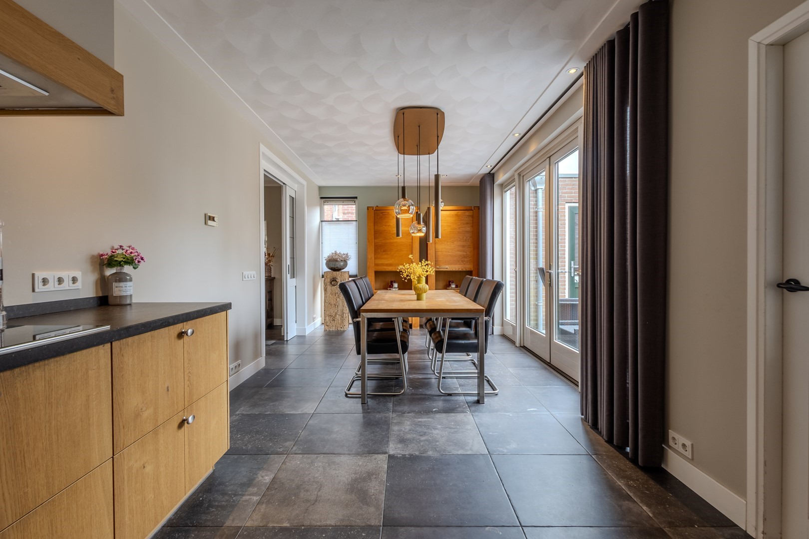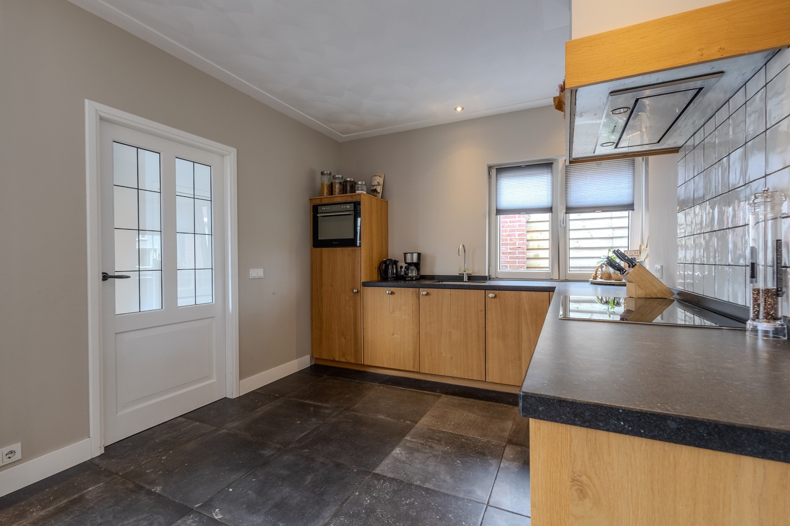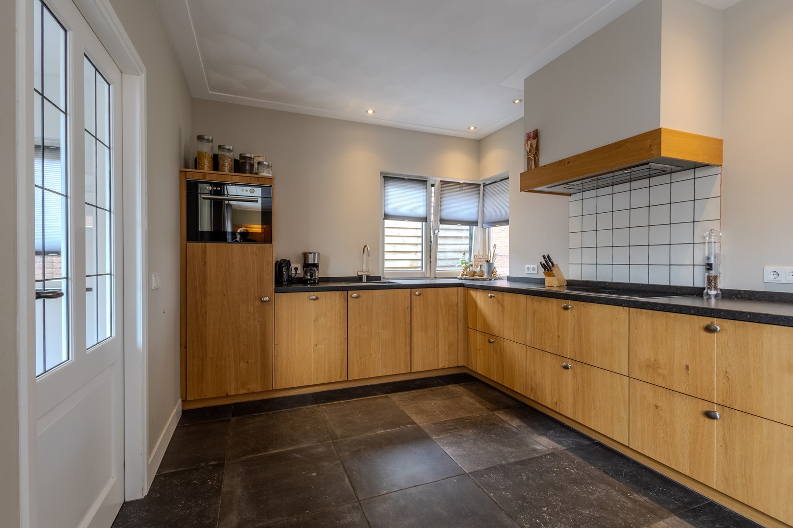 De keuken is uitgevoerd in een praktische L-opstelling met houten fronten en een stijlvol donker natuurstenenwerkblad. De keuken is uitgerust met moderne inbouwapparatuur: een 5-pits inductiekookplaat, combi-oven, vaatwasser en koelkast. Vanuit de keuken bereikt u de bijkeuken met ingebouwde kastenwand, aansluitingen voor de wasapparatuur, een separaat toilet en toegang tot de achtertuin.