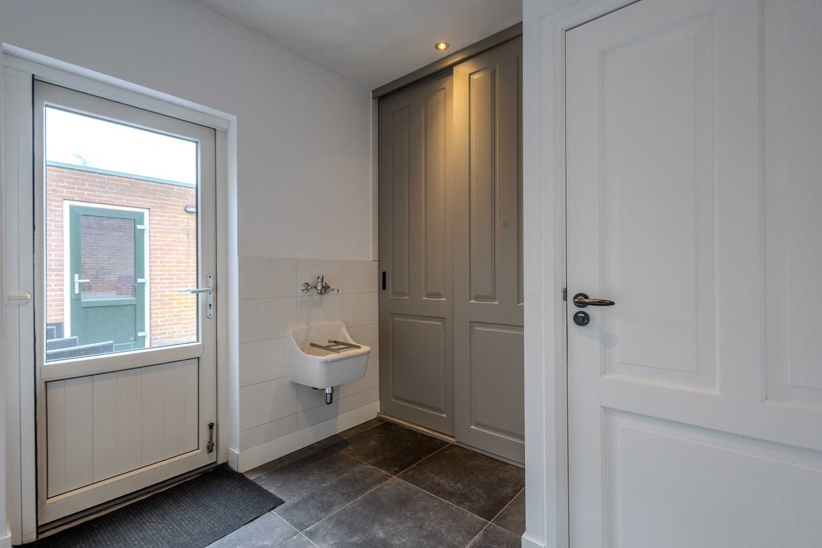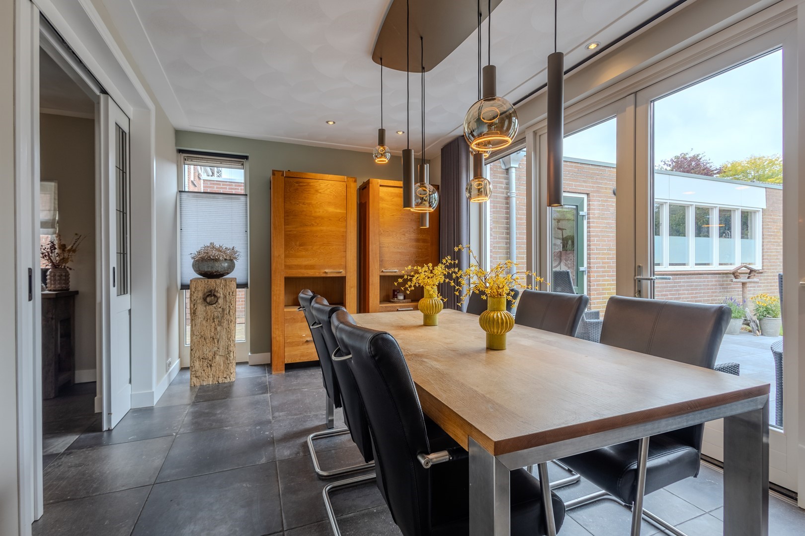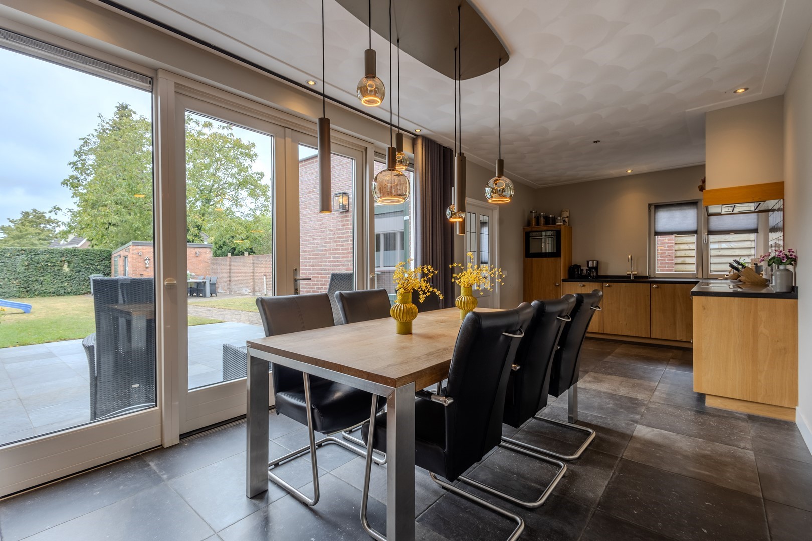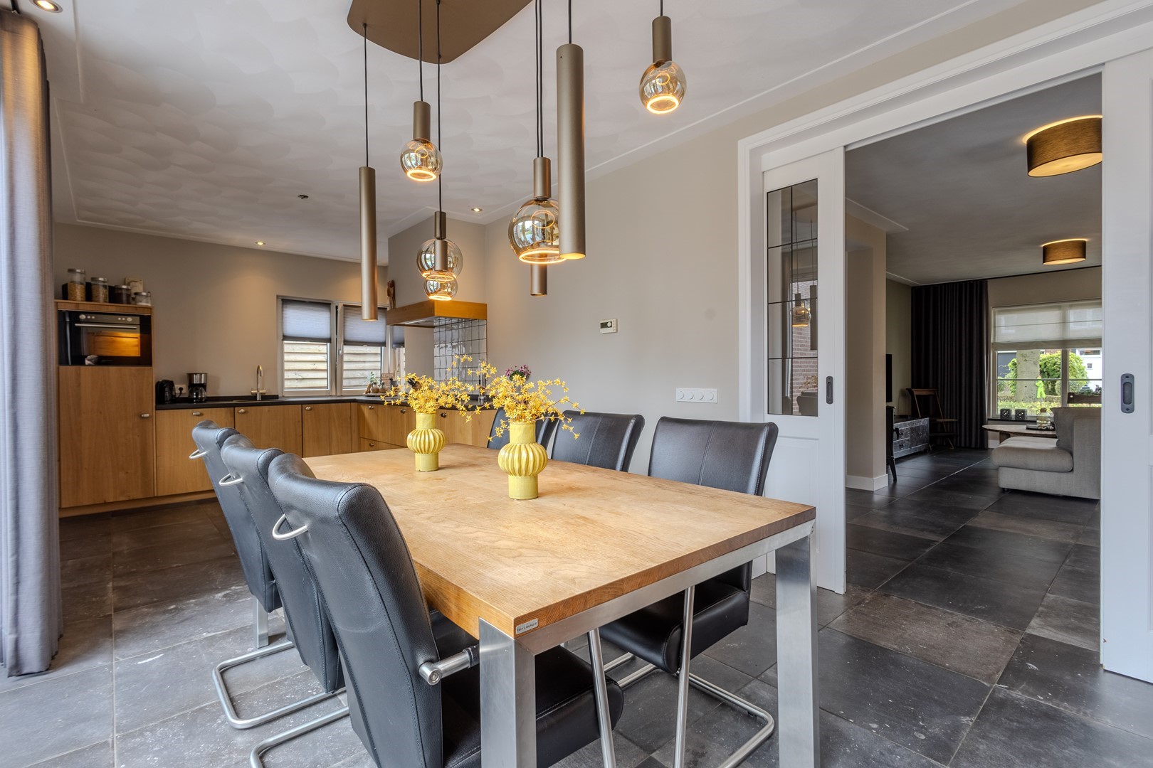 De keuken is uitgevoerd in een praktische L-opstelling met houten fronten en een stijlvol donker natuurstenenwerkblad. De keuken is uitgerust met moderne inbouwapparatuur: een 5-pits inductiekookplaat, combi-oven, vaatwasser en koelkast. Vanuit de keuken bereikt u de bijkeuken met ingebouwde kastenwand, aansluitingen voor de wasapparatuur, een separaat toilet en toegang tot de achtertuin.