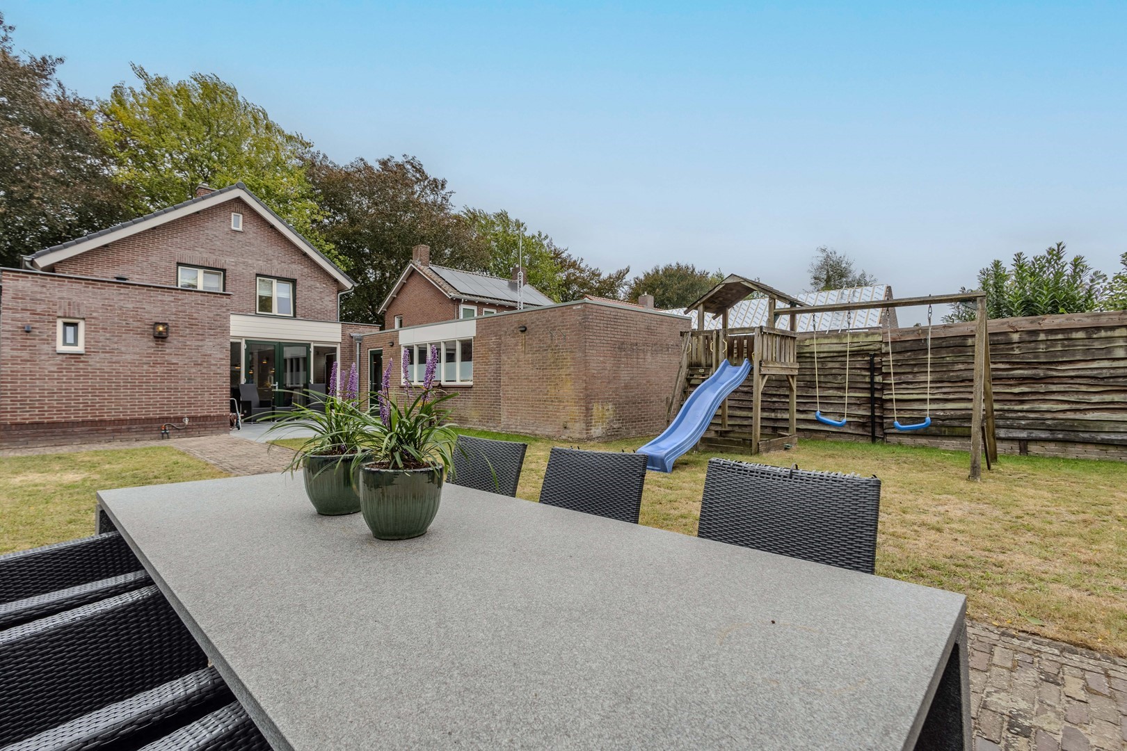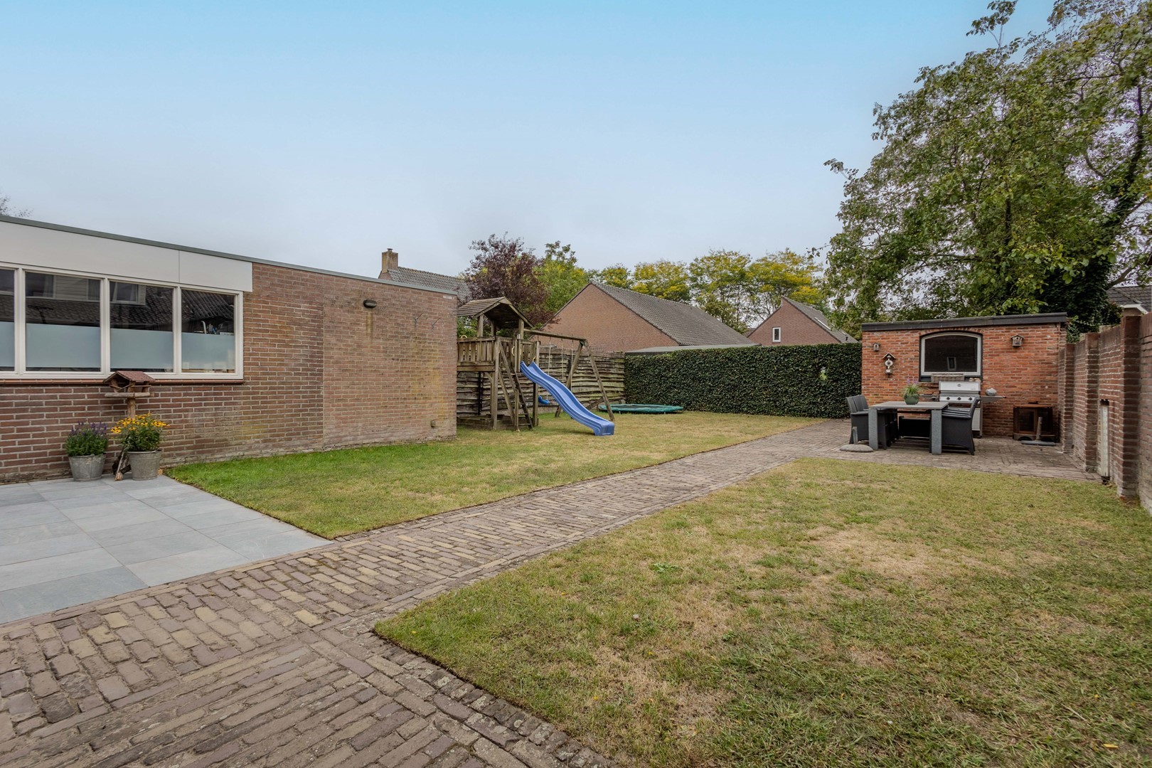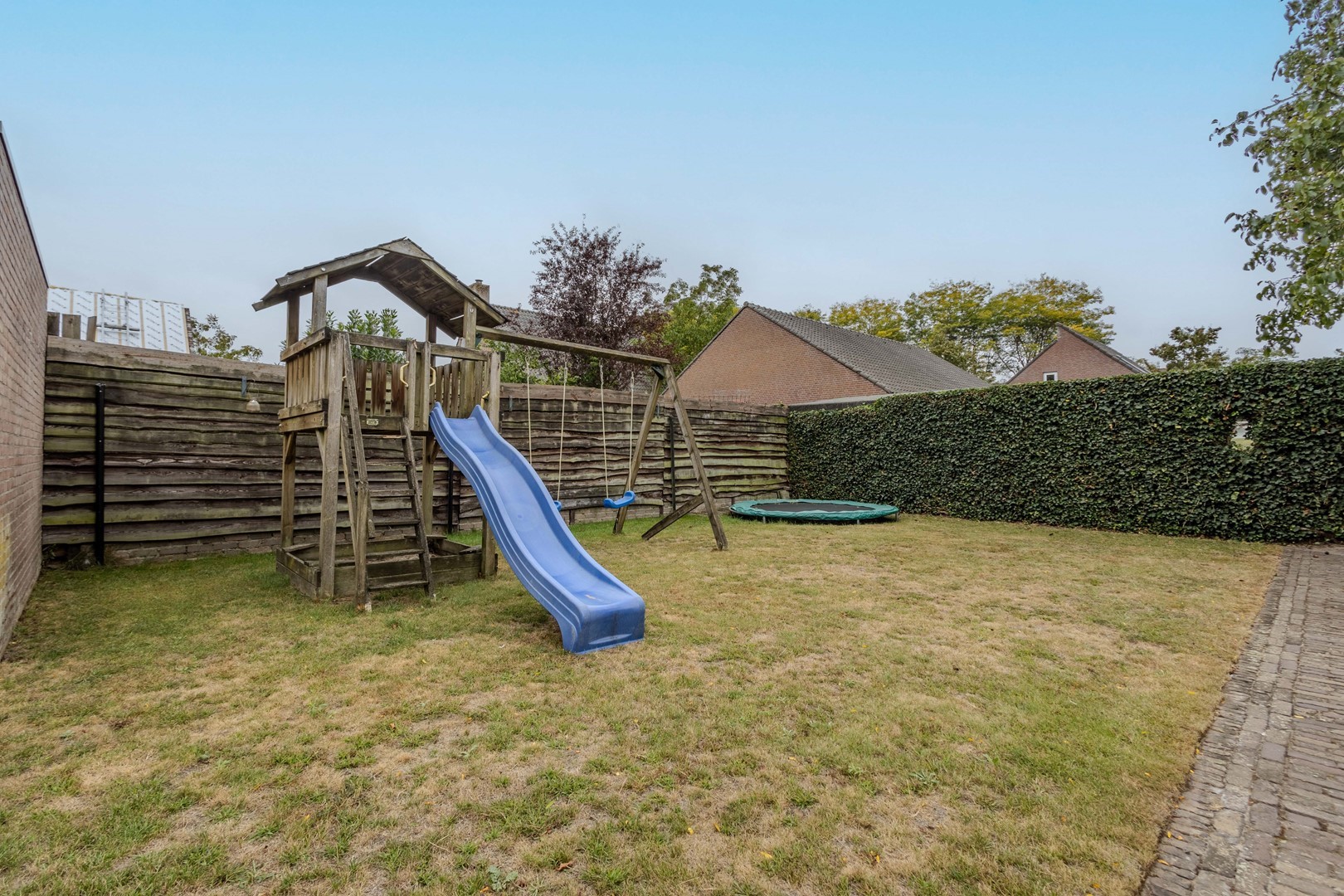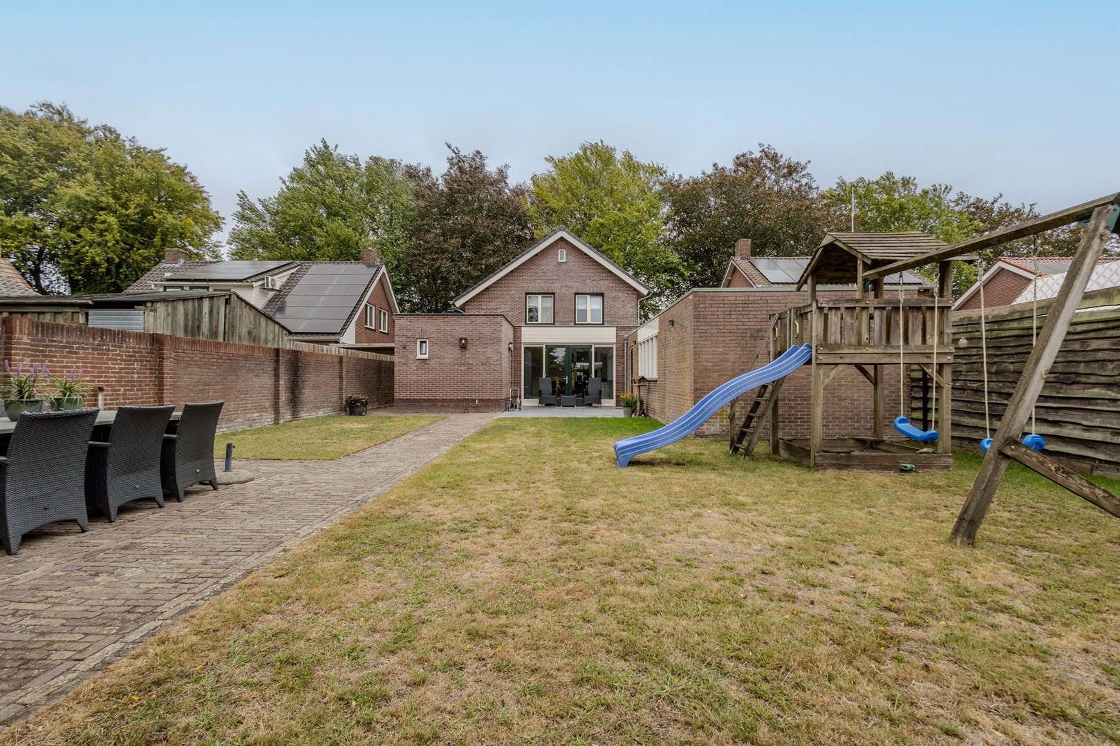 De achtertuin is een heerlijke plek om te genieten van het buitenleven. Dankzij de royale afmetingen is er ruimte voor meerdere zitplekken, variërend van een zonnig terras tot een beschut hoekje voor lange zomeravonden met vrienden en familie. Het grote gazon biedt volop mogelijkheden voor kinderen om te spelen, compleet met speeltoestel. De tuin wordt omsloten door groen en een robuuste muren erfafscheiding, waardoor u kunt rekenen op optimale privacy. Een fijne plek waar ontspanning, gezelligheid en praktisch gebruik samenkomen. Via de rechterzijde van de woning is de achterom te bereiken.