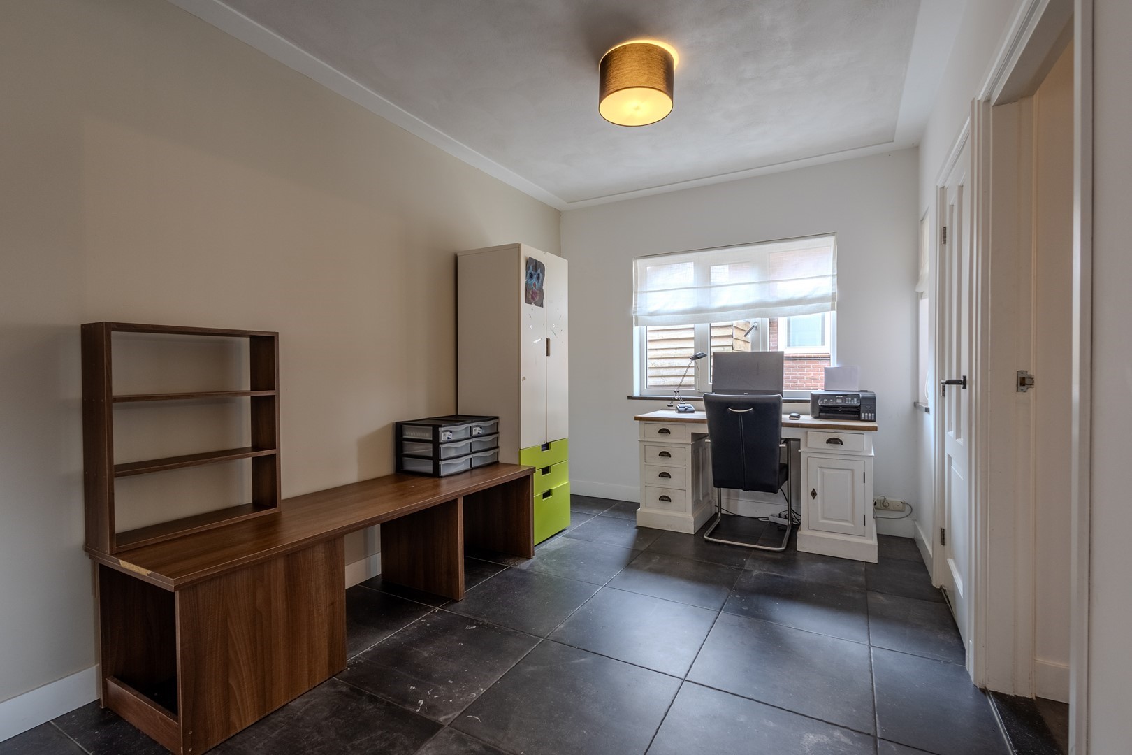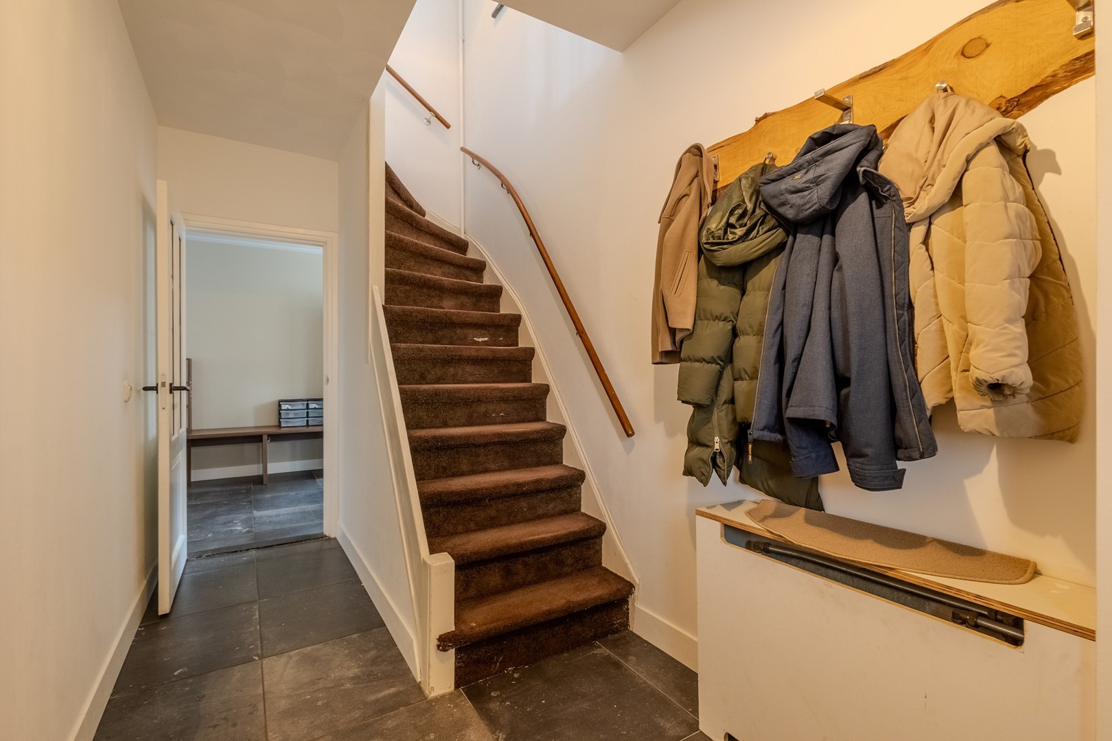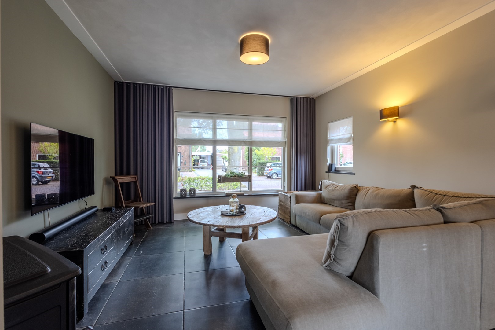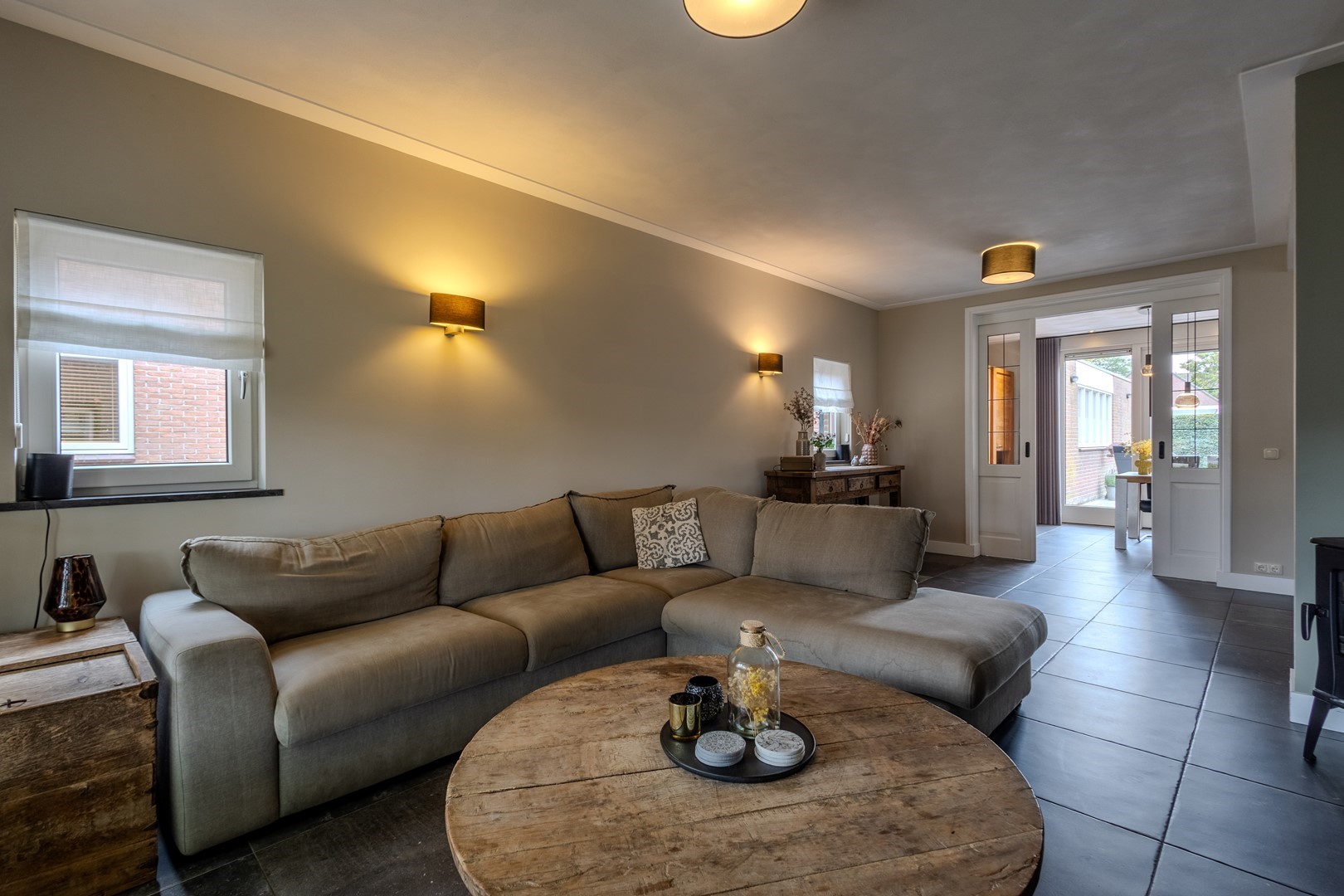 De entree biedt toegang tot de trapopgang en de vernieuwde meterkast. Vanuit hier bereikt u de royale woonkamer met tegelvloer en vloerverwarming, strak stucwerk en een sfeervolle houtkachel (2022). Leuk pluspunt is het verbindingsruimte waar momenteel een werkruimte is gerealiseerd. Onder de trap bevindt zich de provisiekelder, ideaal voor het opslaan van voorraad en extra bergruimte. Dankzij de diverse grote raampartijen met glas-in-lood wordt het leefgedeelte aan alle kanten overspoeld met natuurlijk licht. De woonkamer staat in directe verbinding met de woonkeuken door middel van klassieke en-suitedeuren.