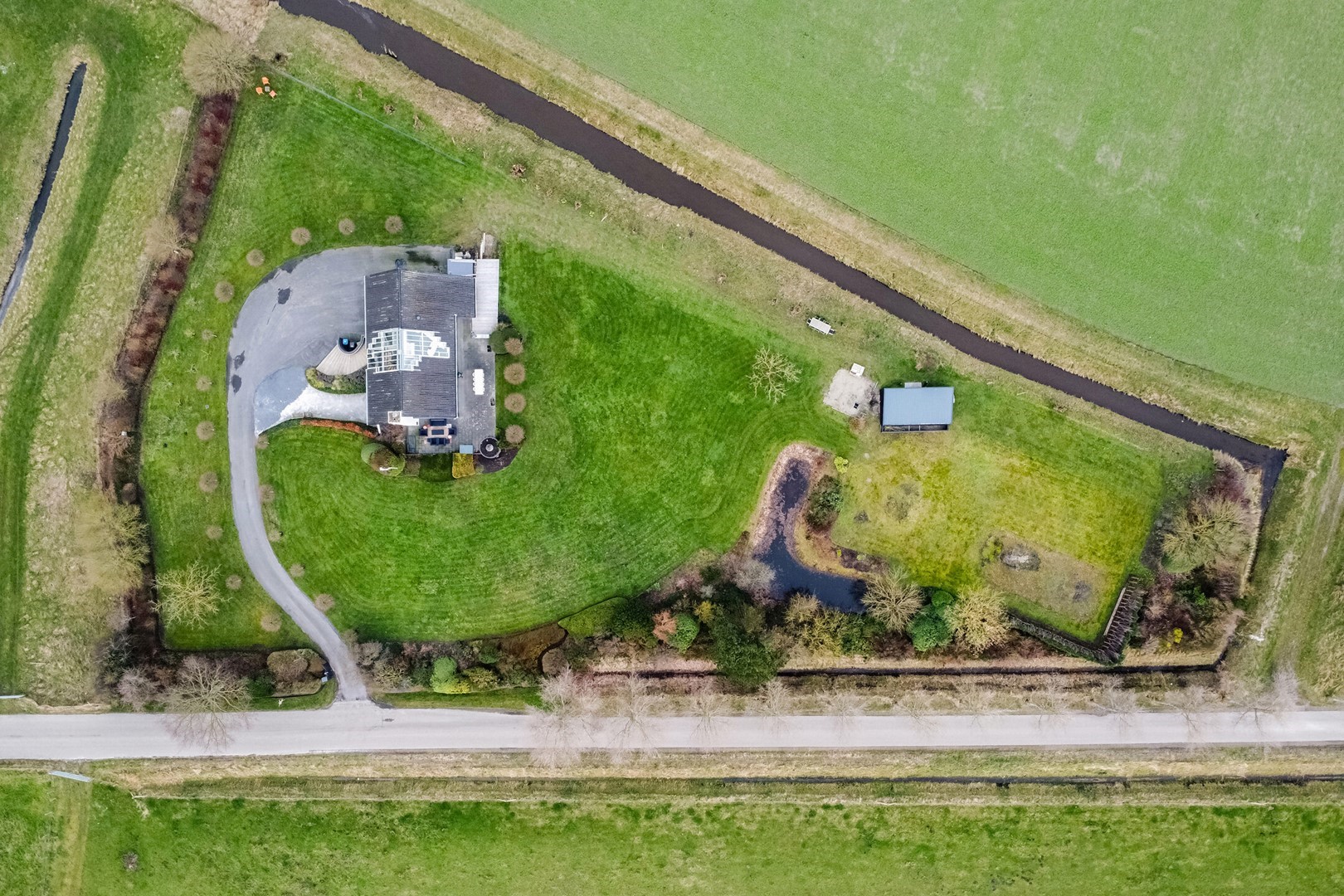 Het royale perceel van 6.380 m² is fraai aangelegd en biedt volledige privacy. Rondom de villa zijn ruime bestrating en meerdere buitenzitplaatsen aanwezig, direct toegankelijk via de schuifpuien. Het perceel biedt ruimschoots ruimte voor de aanleg van een privétennisbaan of groot buitenzwembad. Op eigen terrein is een laadpaal aanwezig. De ruime vrijstaande schuur van 32 m² (nieuw in 2025) biedt extra bergruimte. De royale oprijlaan biedt parkeergelegenheid voor maar liefst acht auto’s.