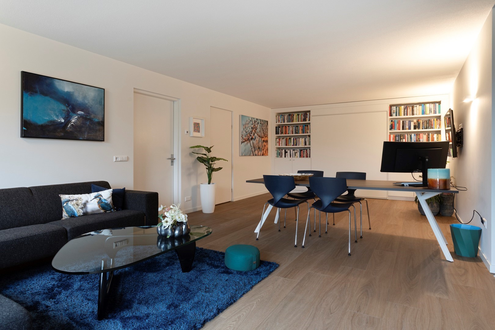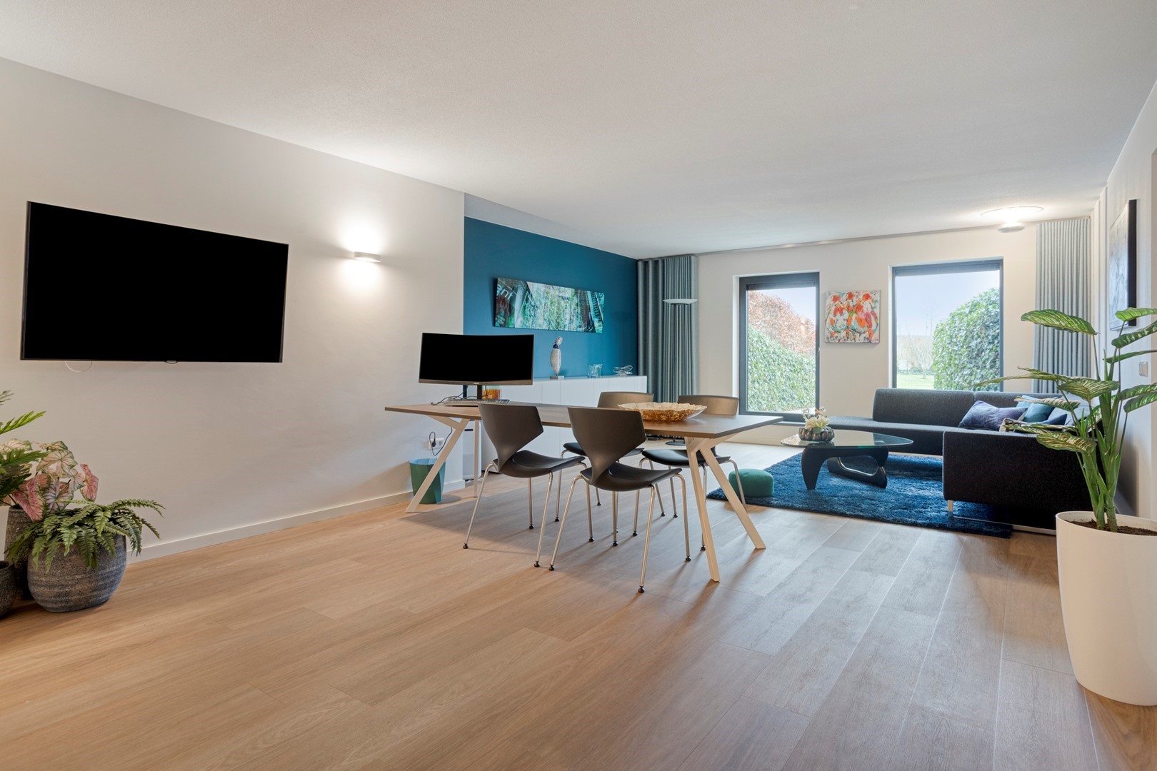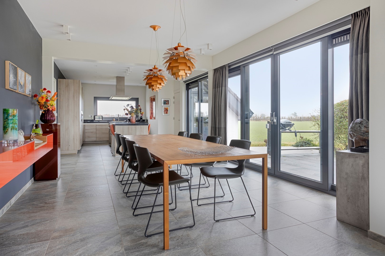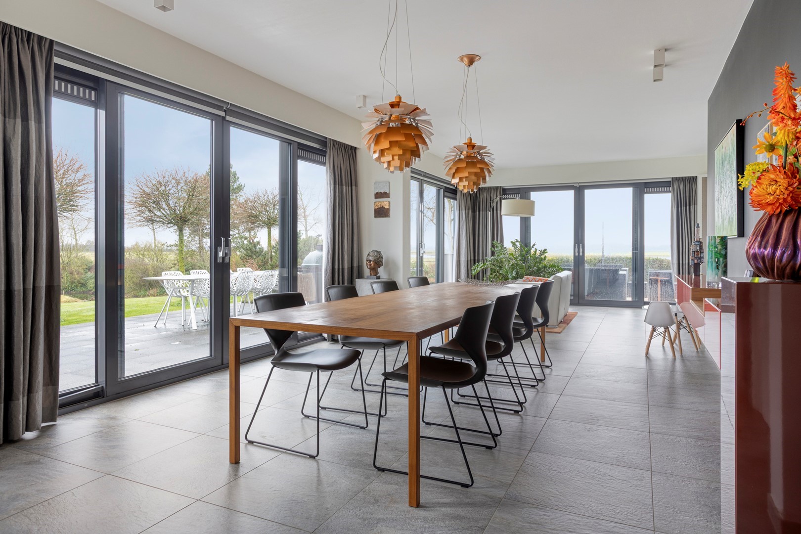 De ruime entreehal met natuurstenen vloer, vloerverwarming en een sculptuur van een vrijdragende wenteltrap in staal en hout verwelkomt u direct met architectonische grandeur. De woonkamer en open keuken vormen een naadloos geheel, volledig omgeven door vloer-tot-plafond schuifpuien met HR+ glas die het Zeeuwse landschap naar binnen halen. De op maat gemaakte kastenwand in licht hout integreert een breed panoramisch gashaardstel én een volledig weggewerkte televisie, design en functie in één geheel. De eetkamer biedt ruimte voor royaal tafelen voor tien personen.