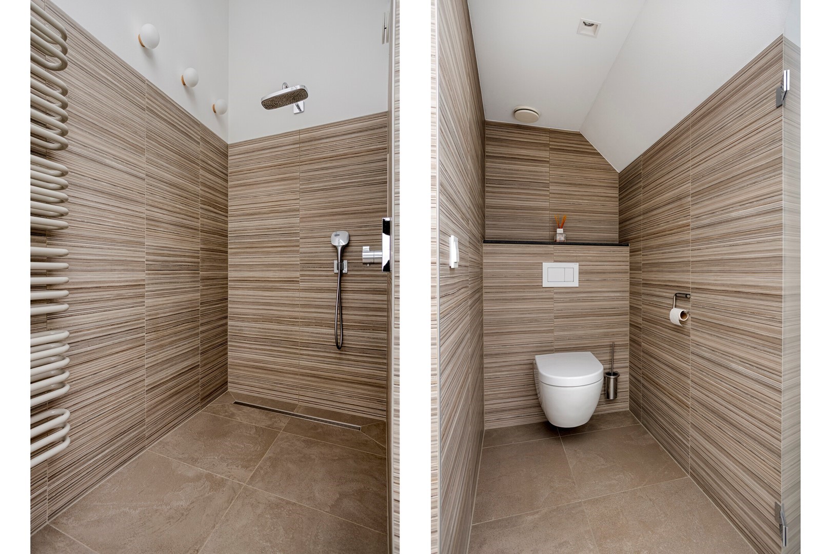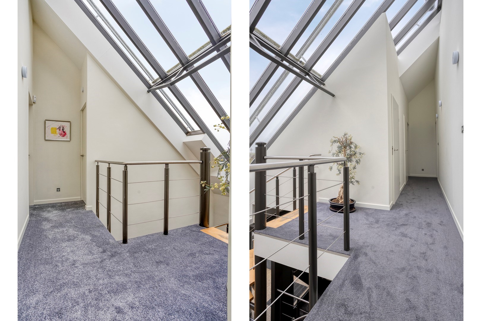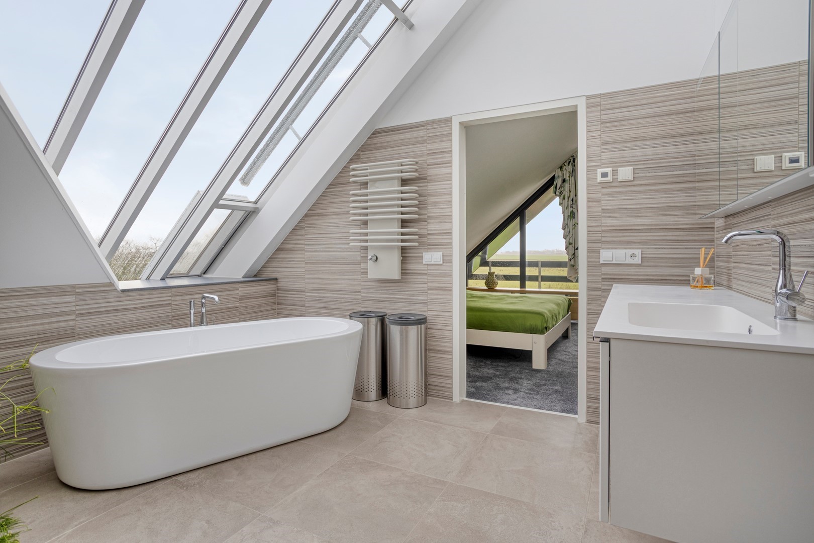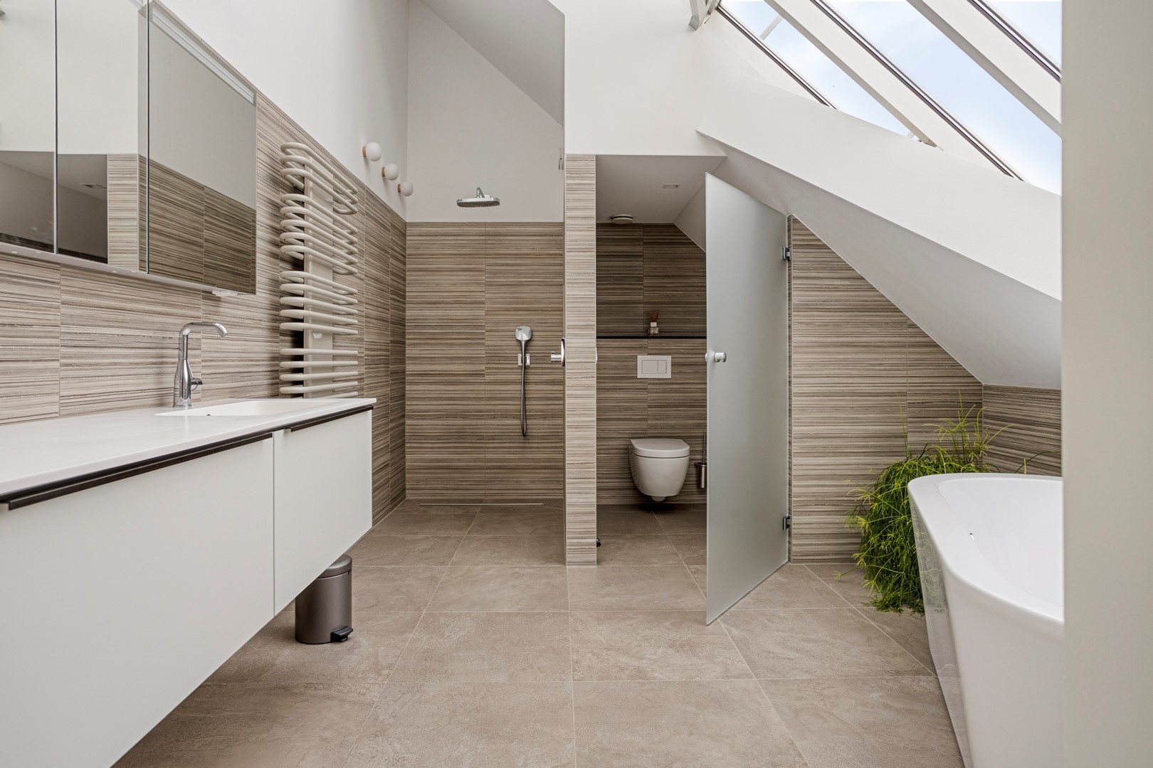 De spectaculaire overloop met glazen lichtstraat geeft de verdieping een bijzondere kwaliteit: volop daglicht en een panoramisch gevoel. Hier bevinden zich drie ruime slaapkamers, twee volledig betegelde badkamers en een grote walk-in closet. De hoofdbadkamer is volledig bekleed met subtiel gestreepte beige tegels en voorzien van een inloopdouche met regendouche, vrijstaand ligbad, designradiator en toilet. De tweede badkamer ontvangt daglicht via de lichtstraat, een zeldzaam luxueus detail. Vanuit de masterbedroom en/of walk-in closet is er toegang tot het balkon met vrij uitzicht. De walk-in closet is door zijn afmetingen bovendien eenvoudig om te vormen tot een vijfde slaapkamer.