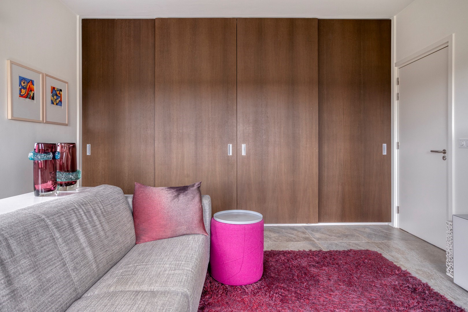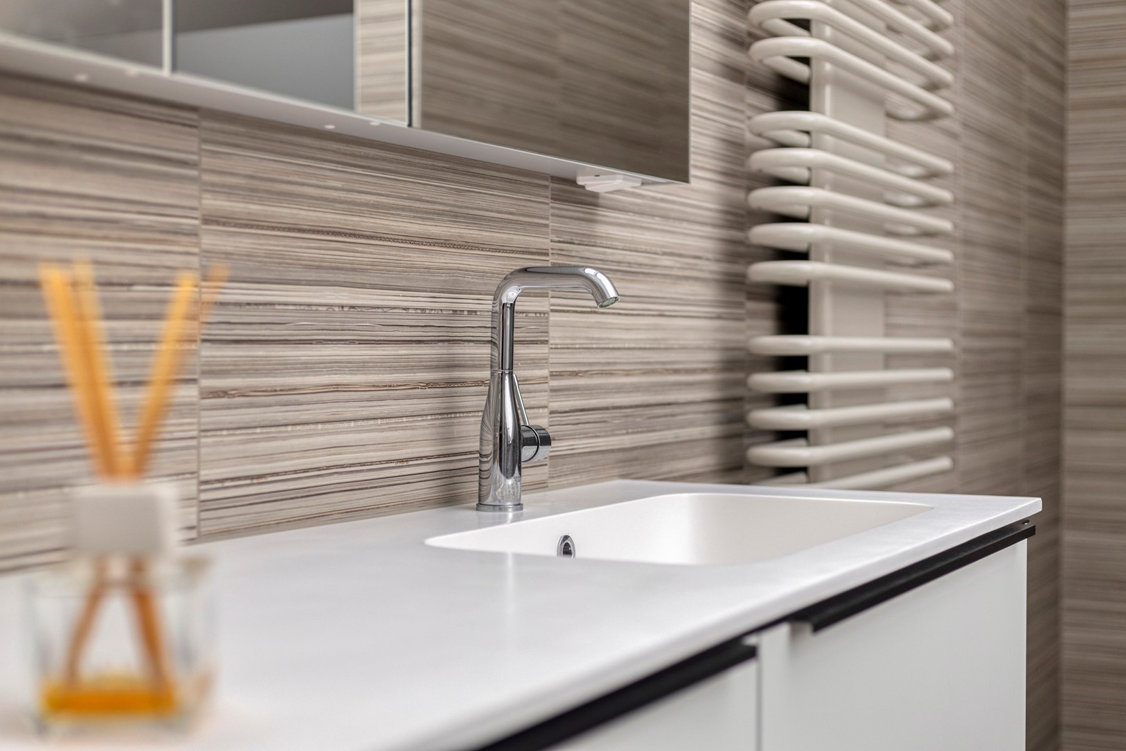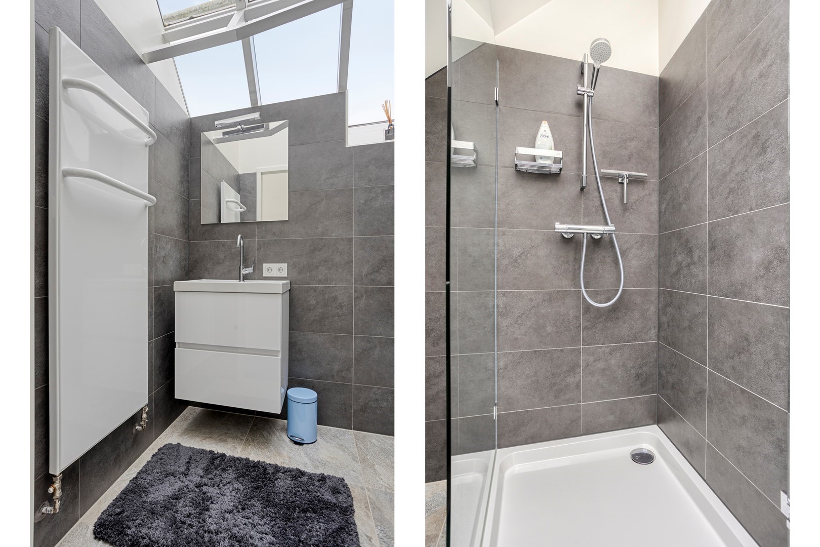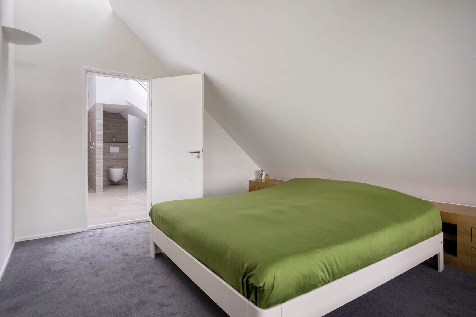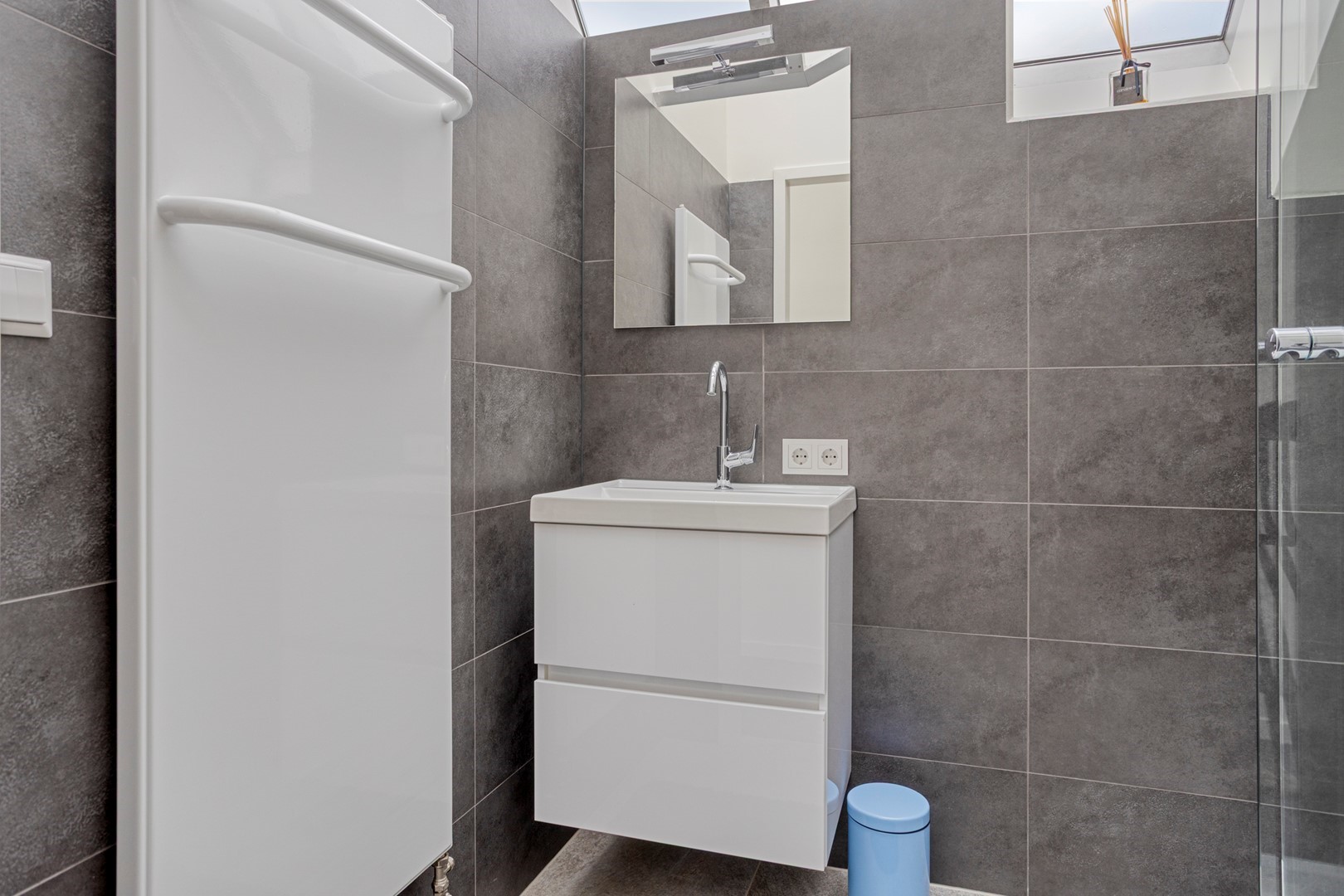 De spectaculaire overloop met glazen lichtstraat geeft de verdieping een bijzondere kwaliteit: volop daglicht en een panoramisch gevoel. Hier bevinden zich drie ruime slaapkamers, twee volledig betegelde badkamers en een grote walk-in closet. De hoofdbadkamer is volledig bekleed met subtiel gestreepte beige tegels en voorzien van een inloopdouche met regendouche, vrijstaand ligbad, designradiator en toilet. De tweede badkamer ontvangt daglicht via de lichtstraat, een zeldzaam luxueus detail. Vanuit de masterbedroom en/of walk-in closet is er toegang tot het balkon met vrij uitzicht. De walk-in closet is door zijn afmetingen bovendien eenvoudig om te vormen tot een vijfde slaapkamer.