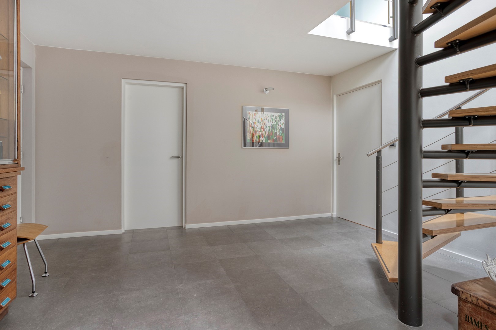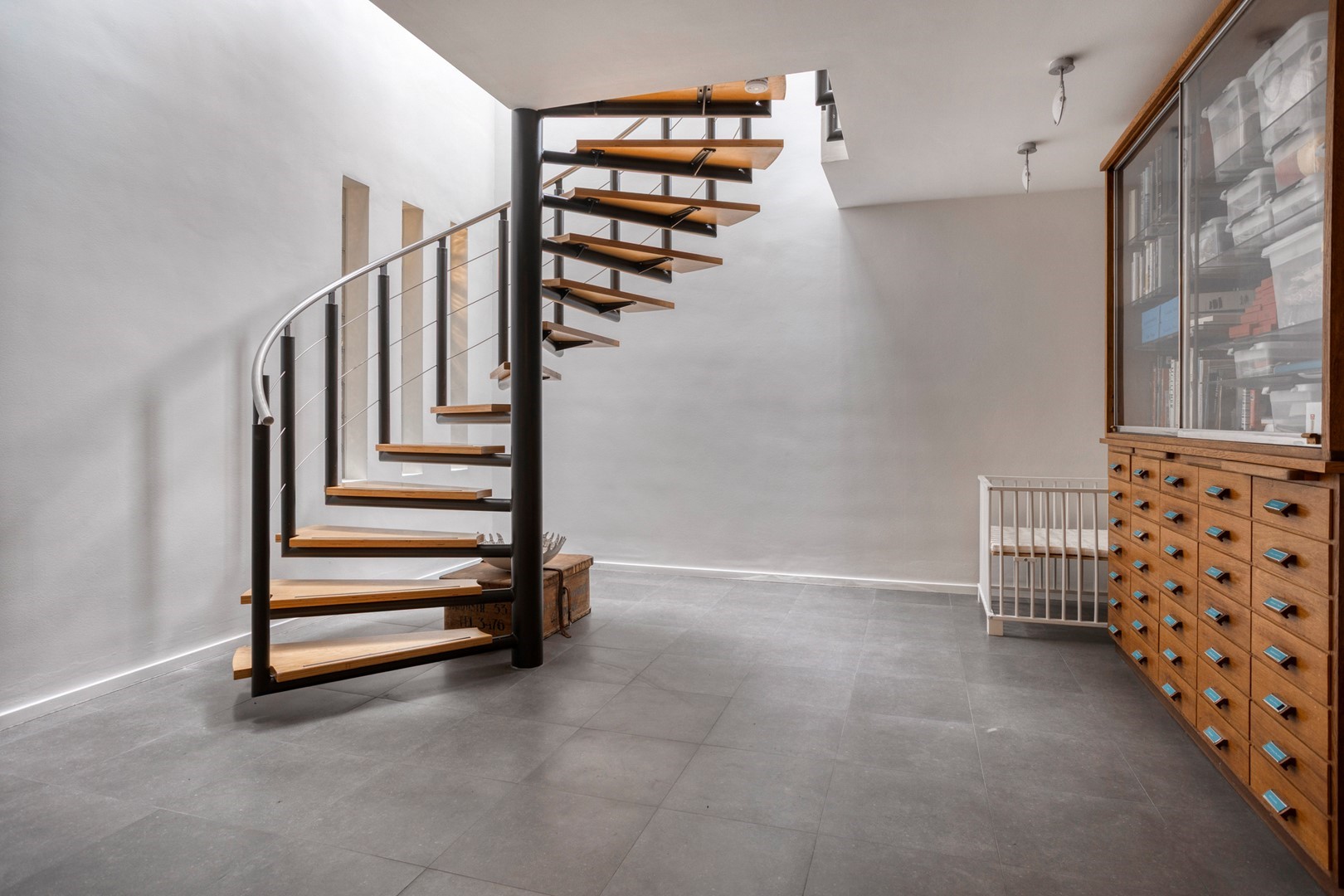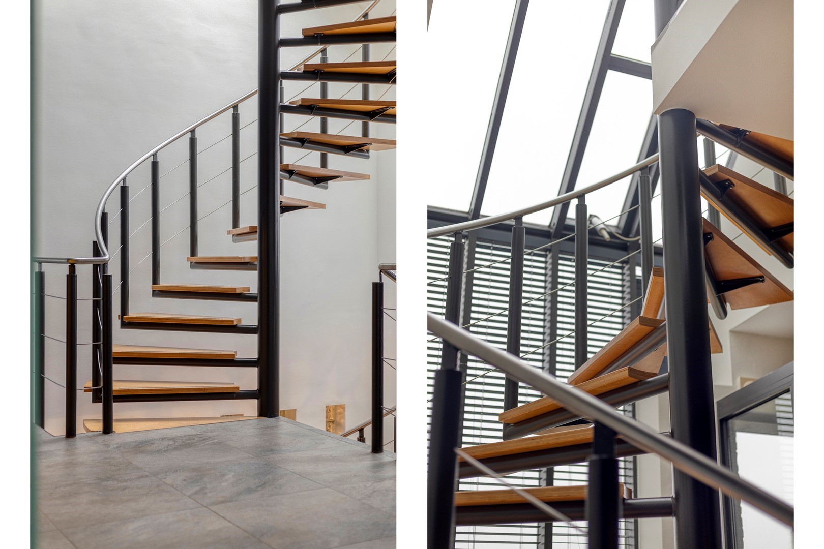 - vrijdragende wenteltrap in staal en hout;