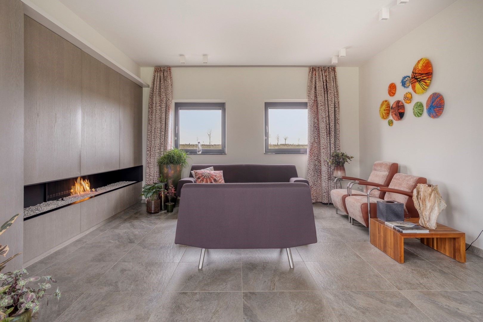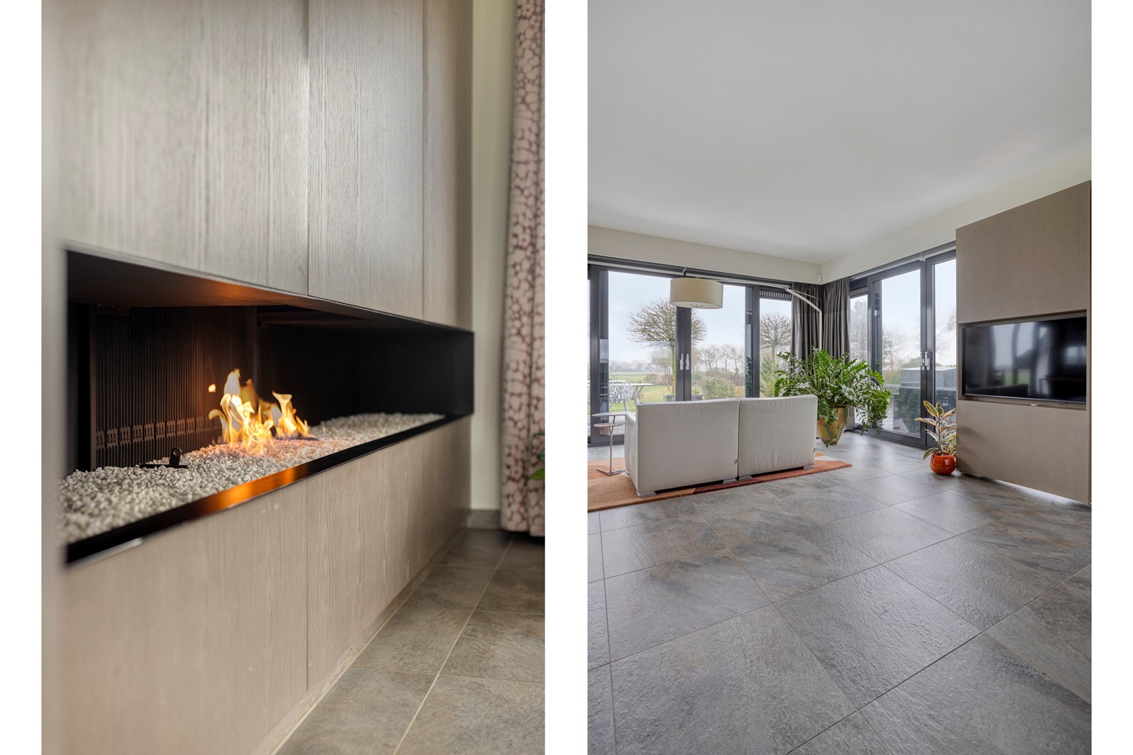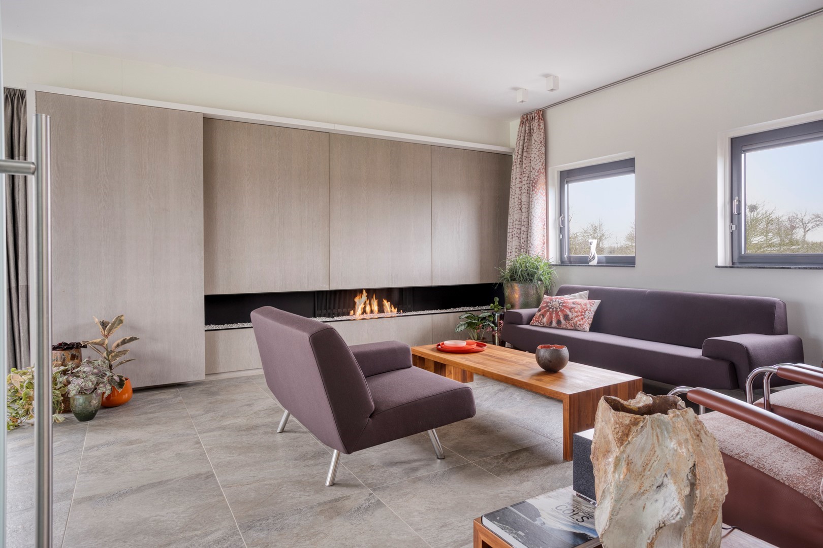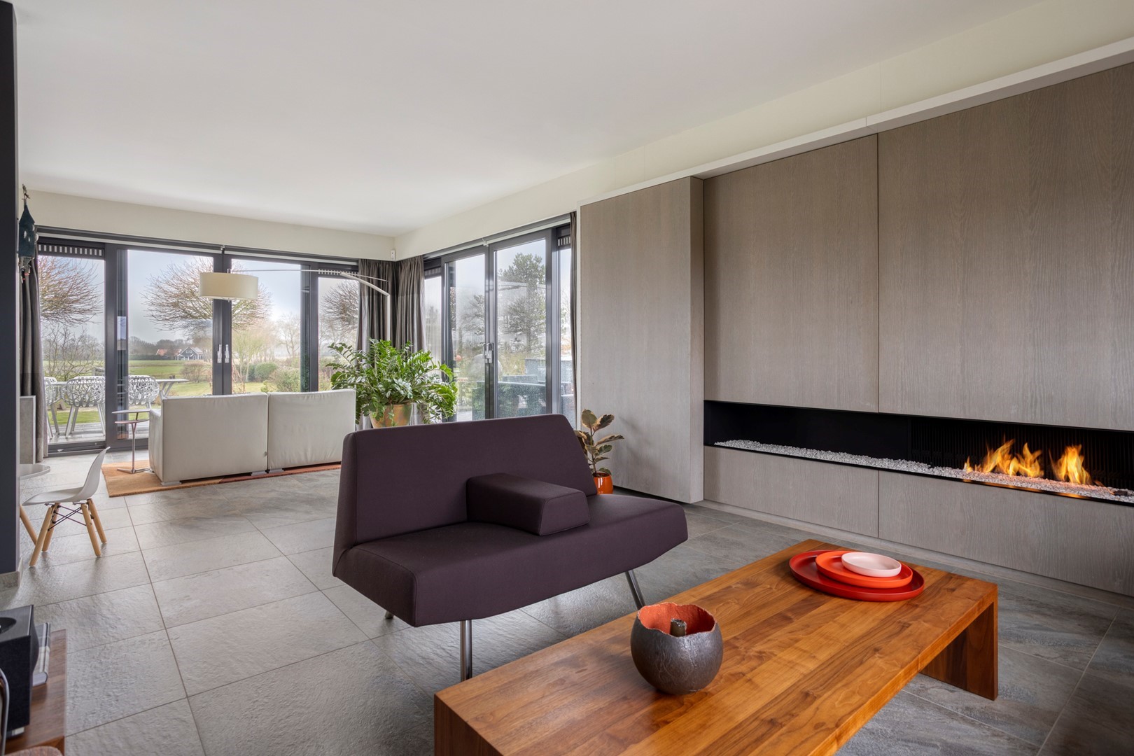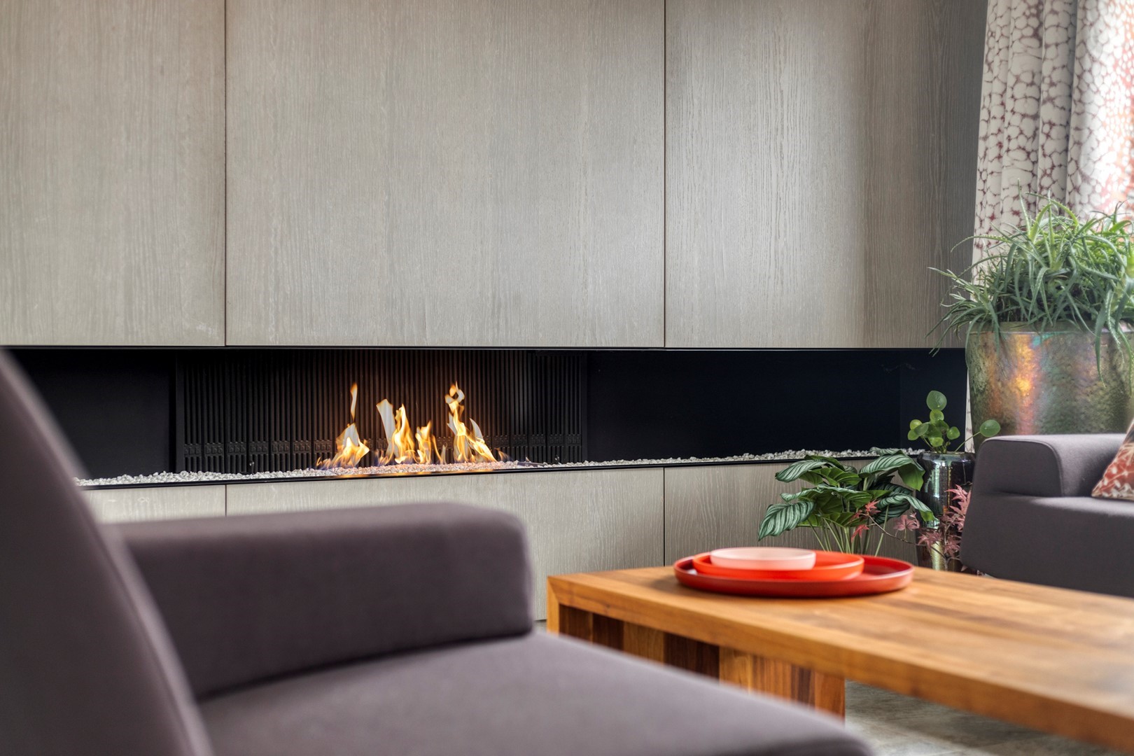 - op maat kastenwand met geïntegreerd panoramisch gashaardstel;