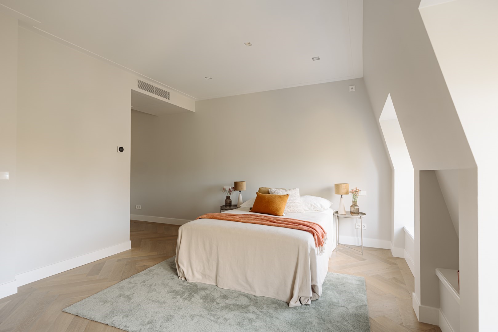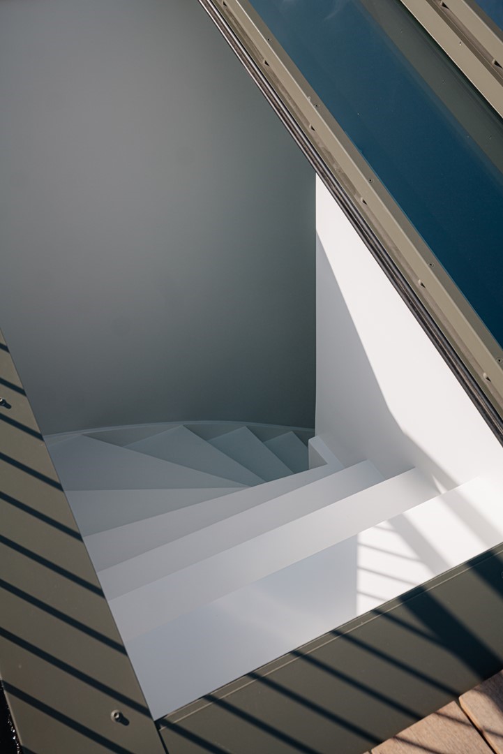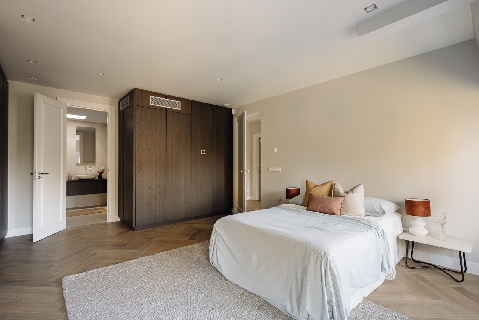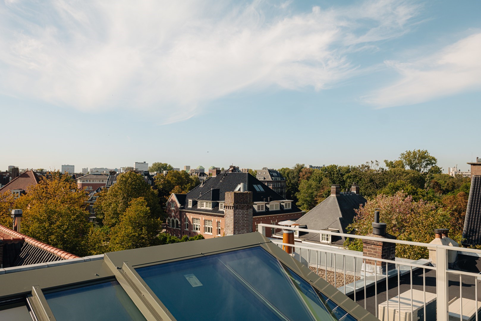 Aan de straatzijde liggen twee slaapkamers, stil en besloten. De hoofdslaapkamer is ruim, met ingebouwde kasten over de volle breedte. Naastliggend bevindt zich de badkamer: ingetogen, met inloopdouche, vrijstaand bad en een dubbele wastafel in kalksteen. Alles is perfect afgewerkt, met ingetogen luxe en praktische indeling. Vanuit de hal loopt een vaste trap omhoog, onder een glazen lichtkap. Boven wacht het dakterras: ruim, beschut en met uitzicht over de lommerrijke wijk. Hier voel je de hoogte van het bovenhuis, het ritme van de stad op afstand. Het is stil, zonnig en onverwacht privé. Een plek die net zo goed ‘buiten’ is als onderdeel van de woning. Terug naar binnen valt op hoe vanzelfsprekend alles aanvoelt. De lift, die je vanuit de stad tot in de woning brengt. De routing, die klopt. De materiaalkeuze, die rust geeft. Dit is geen compromis, maar een overtuiging. Wonen in Volmaaktheid, in het hart van Oud-Zuid.