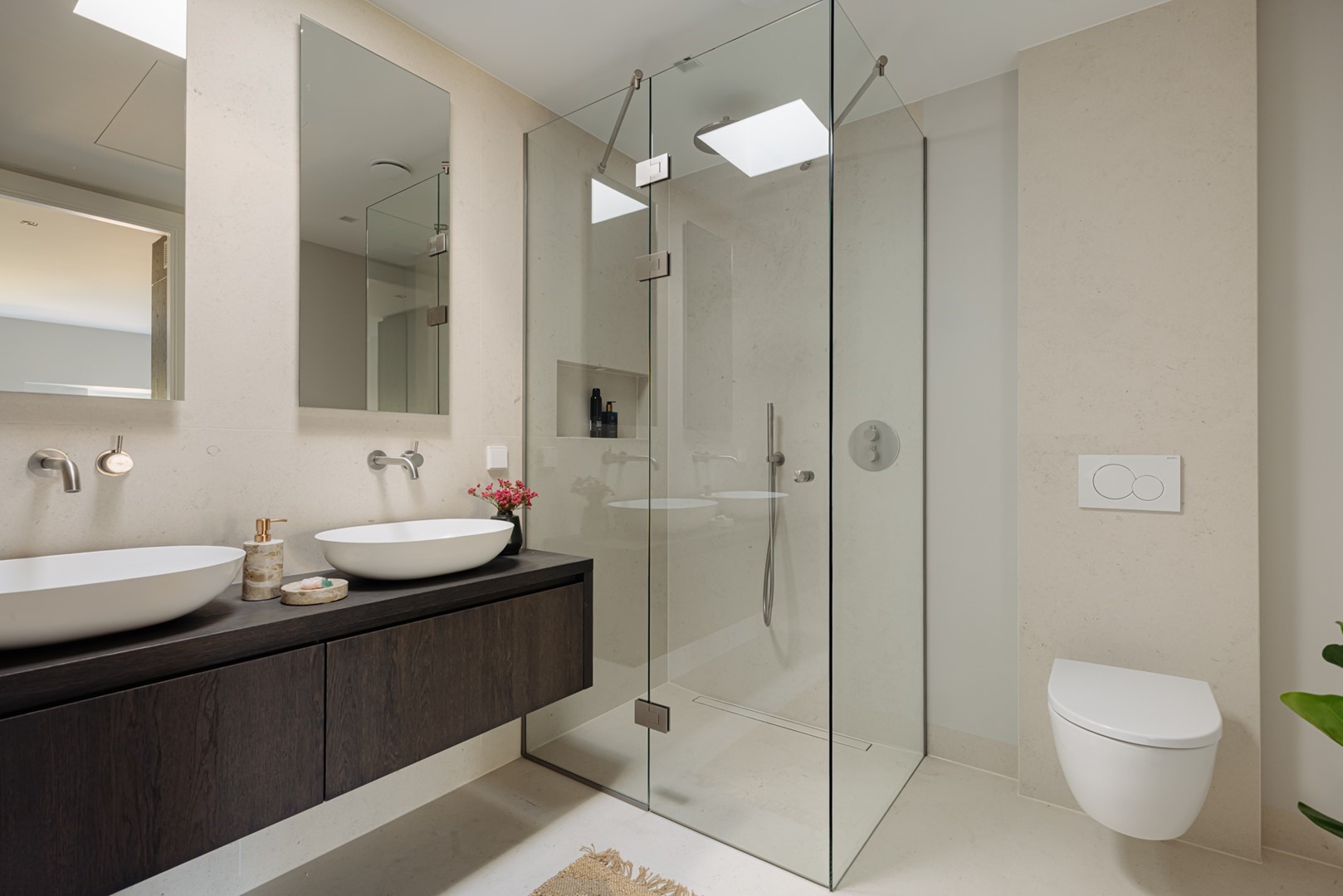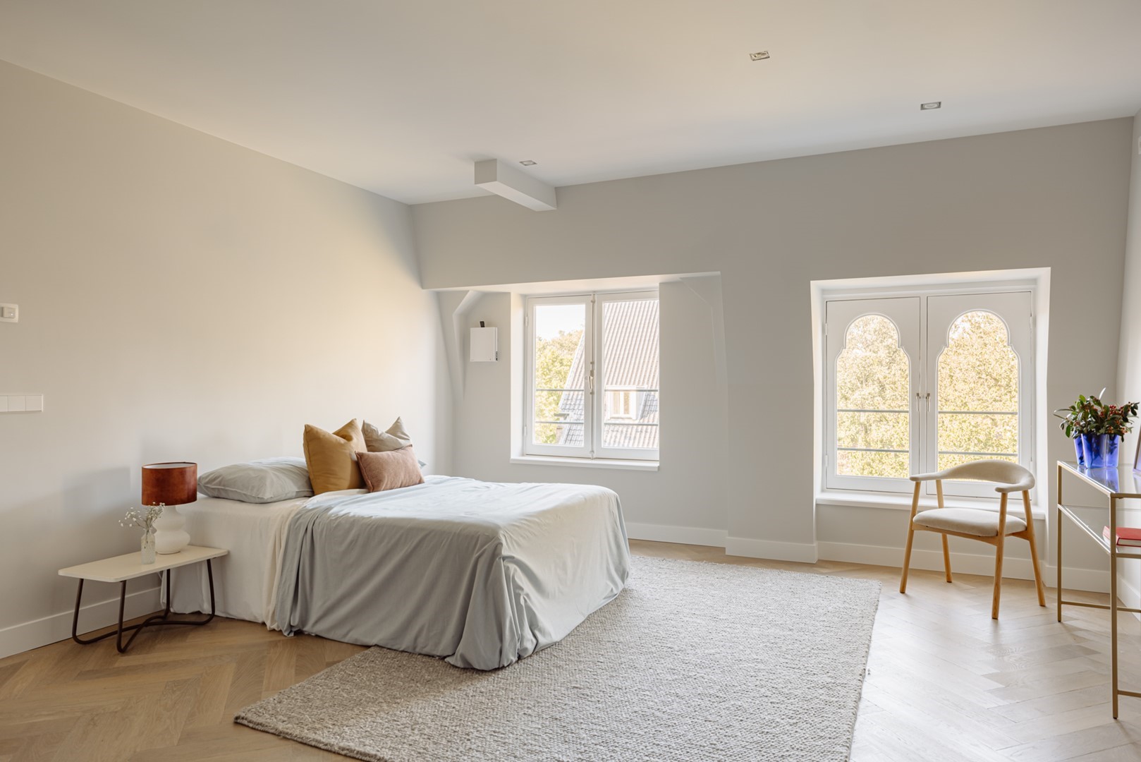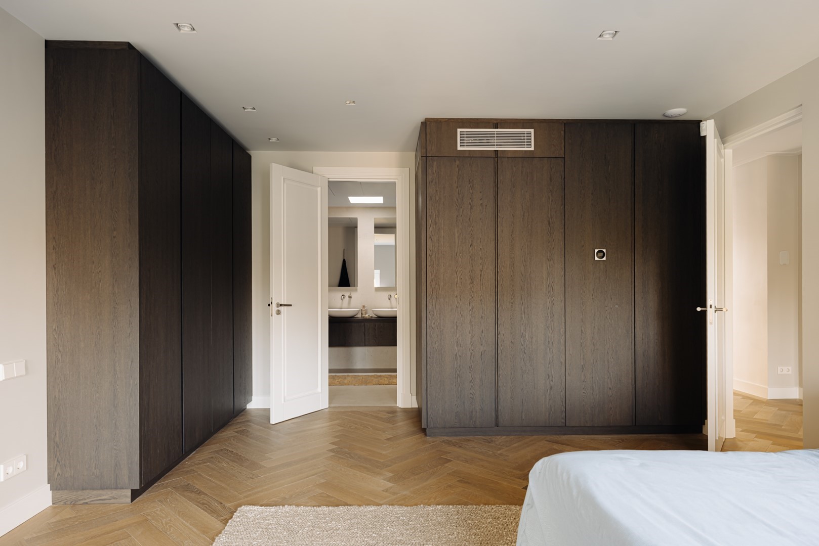 Aan de straatzijde liggen twee slaapkamers, stil en besloten. De hoofdslaapkamer is ruim, met ingebouwde kasten over de volle breedte. Naastliggend bevindt zich de badkamer: ingetogen, met inloopdouche, vrijstaand bad en een dubbele wastafel in kalksteen. Alles is perfect afgewerkt, met ingetogen luxe en praktische indeling. Vanuit de hal loopt een vaste trap omhoog, onder een glazen lichtkap. Boven wacht het dakterras: ruim, beschut en met uitzicht over de lommerrijke wijk. Hier voel je de hoogte van het bovenhuis, het ritme van de stad op afstand. Het is stil, zonnig en onverwacht privé. Een plek die net zo goed ‘buiten’ is als onderdeel van de woning. Terug naar binnen valt op hoe vanzelfsprekend alles aanvoelt. De lift, die je vanuit de stad tot in de woning brengt. De routing, die klopt. De materiaalkeuze, die rust geeft. Dit is geen compromis, maar een overtuiging. Wonen in Volmaaktheid, in het hart van Oud-Zuid.