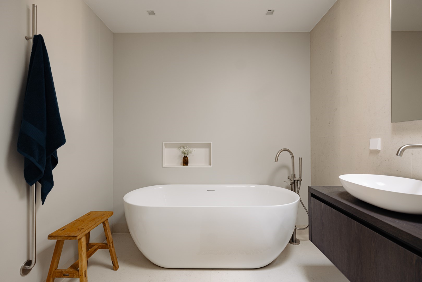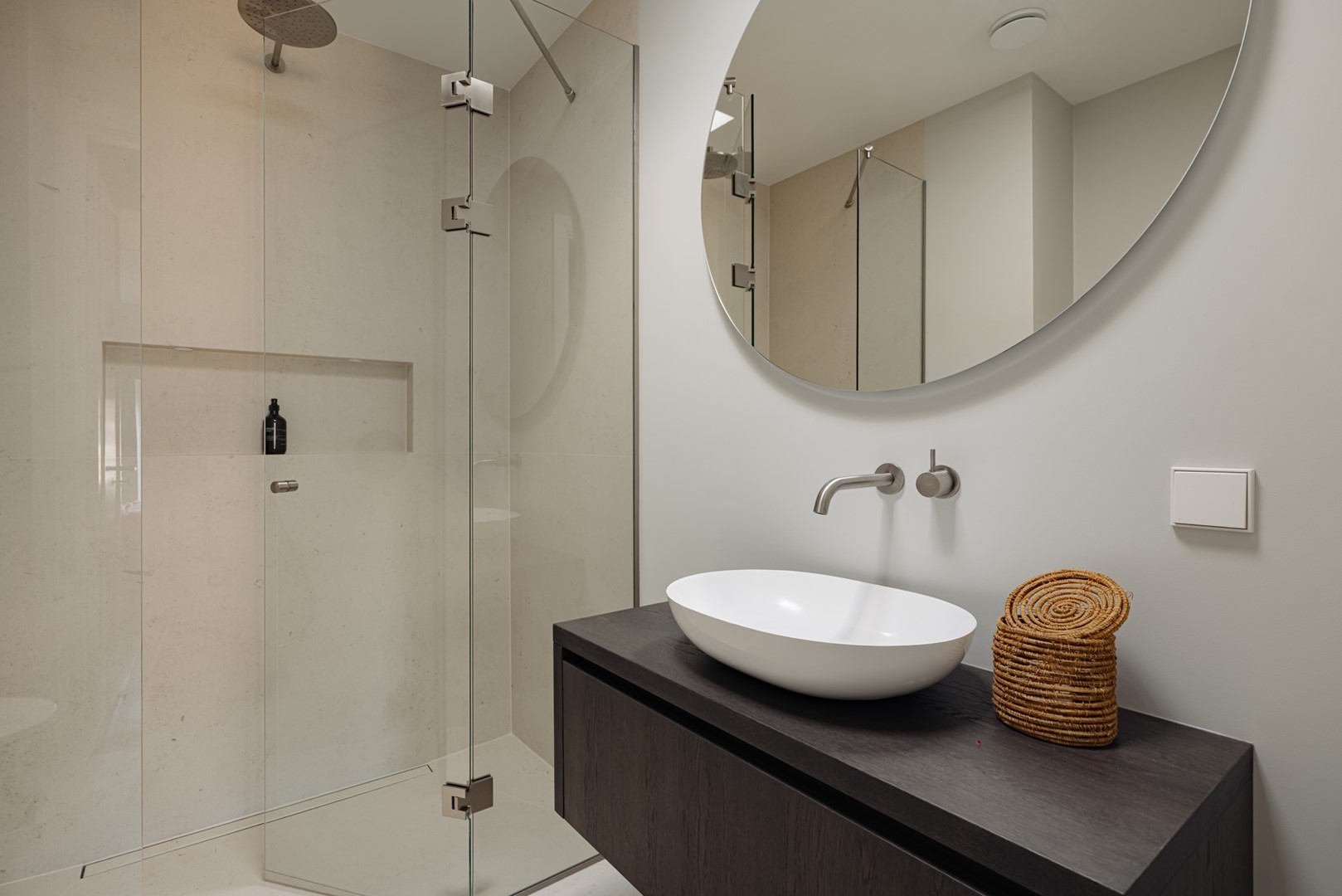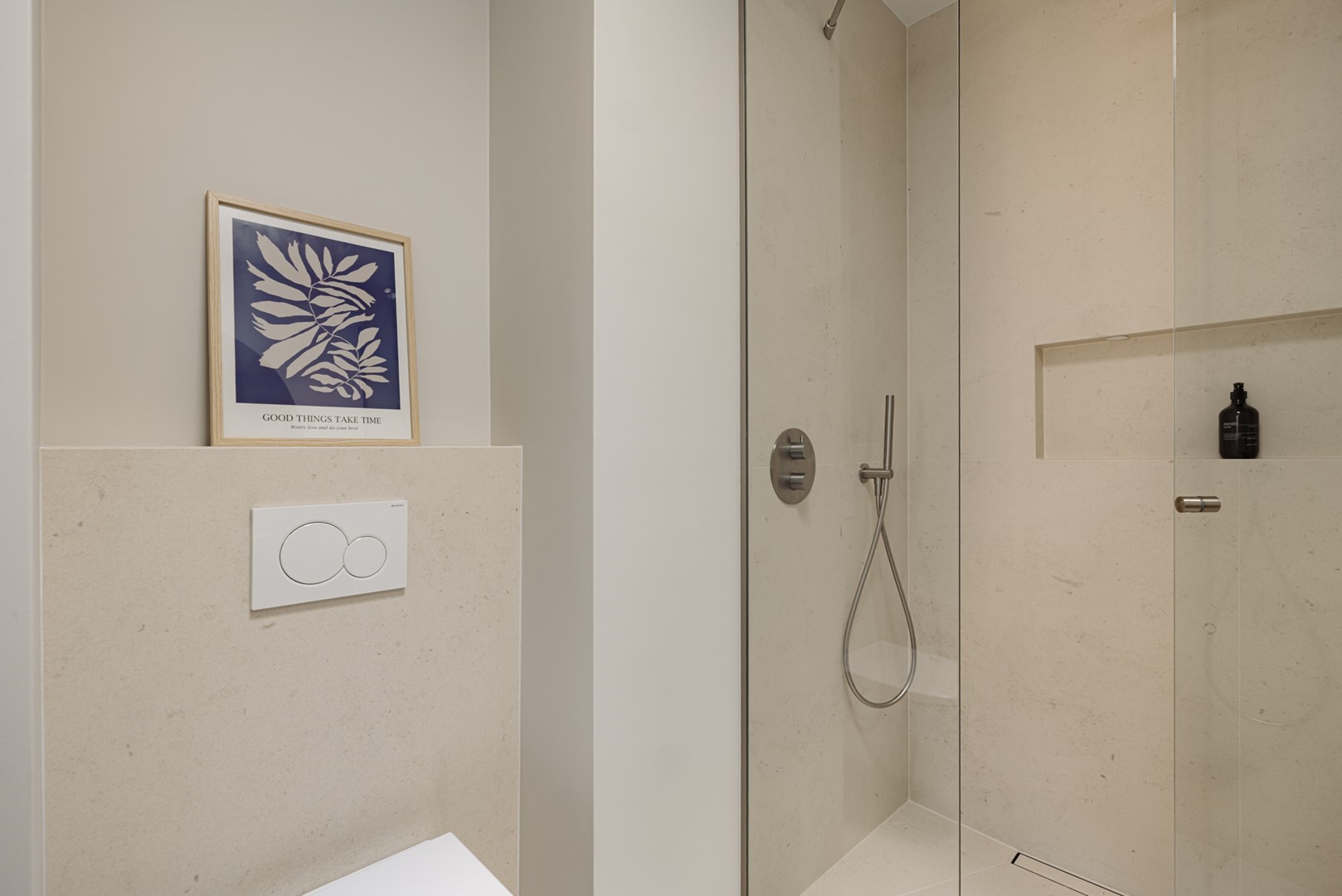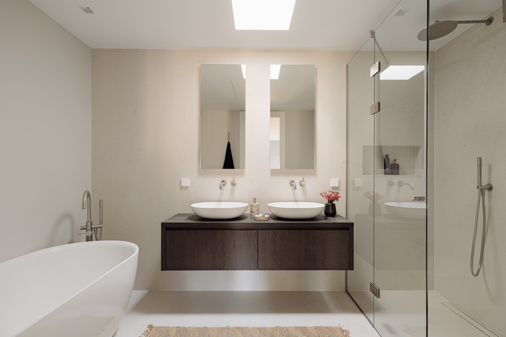 Aan de straatzijde liggen twee slaapkamers, stil en besloten. De hoofdslaapkamer is ruim, met ingebouwde kasten over de volle breedte. Naastliggend bevindt zich de badkamer: ingetogen, met inloopdouche, vrijstaand bad en een dubbele wastafel in kalksteen. Alles is perfect afgewerkt, met ingetogen luxe en praktische indeling. Vanuit de hal loopt een vaste trap omhoog, onder een glazen lichtkap. Boven wacht het dakterras: ruim, beschut en met uitzicht over de lommerrijke wijk. Hier voel je de hoogte van het bovenhuis, het ritme van de stad op afstand. Het is stil, zonnig en onverwacht privé. Een plek die net zo goed ‘buiten’ is als onderdeel van de woning. Terug naar binnen valt op hoe vanzelfsprekend alles aanvoelt. De lift, die je vanuit de stad tot in de woning brengt. De routing, die klopt. De materiaalkeuze, die rust geeft. Dit is geen compromis, maar een overtuiging. Wonen in Volmaaktheid, in het hart van Oud-Zuid.