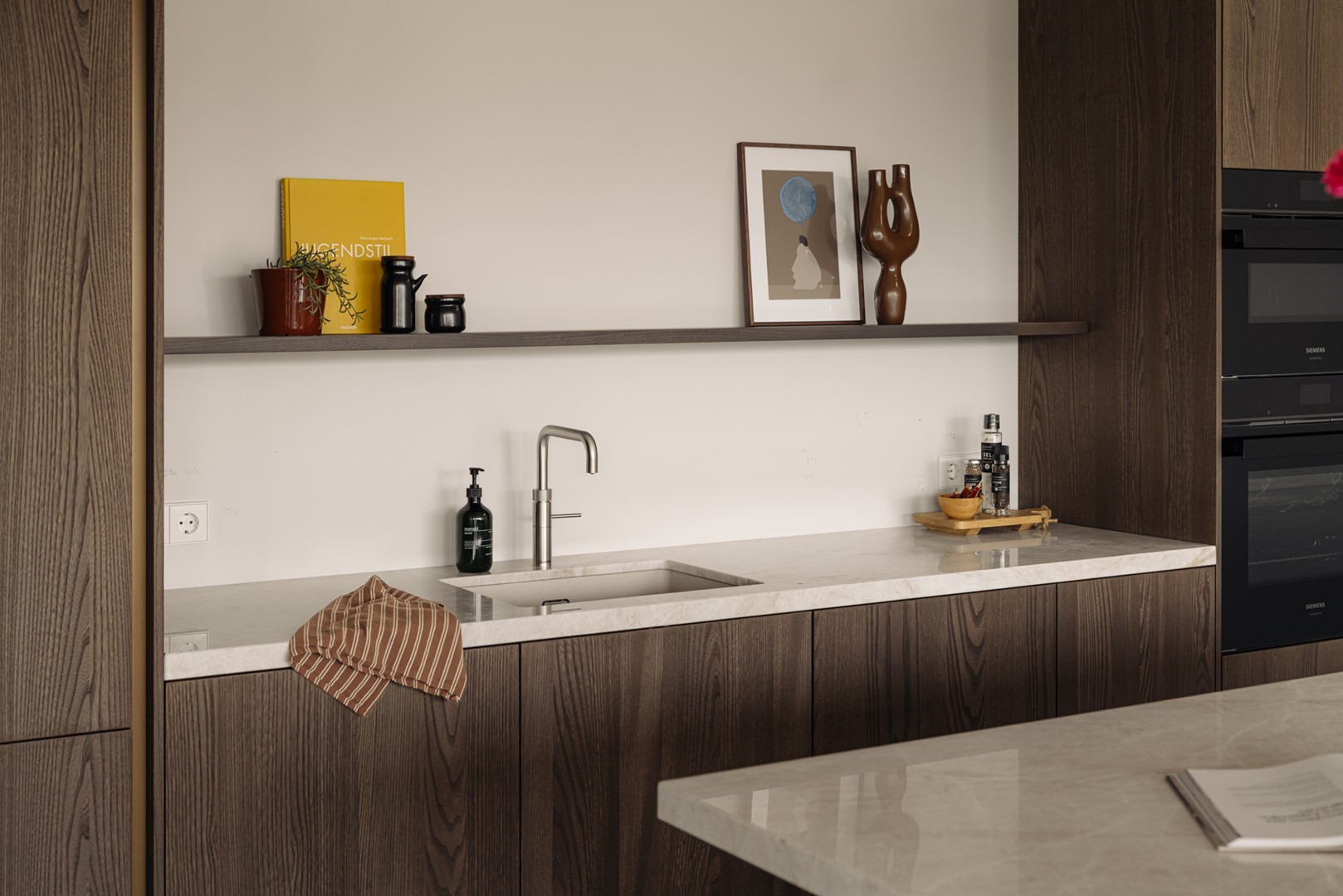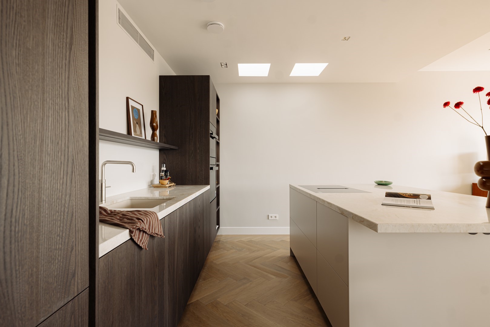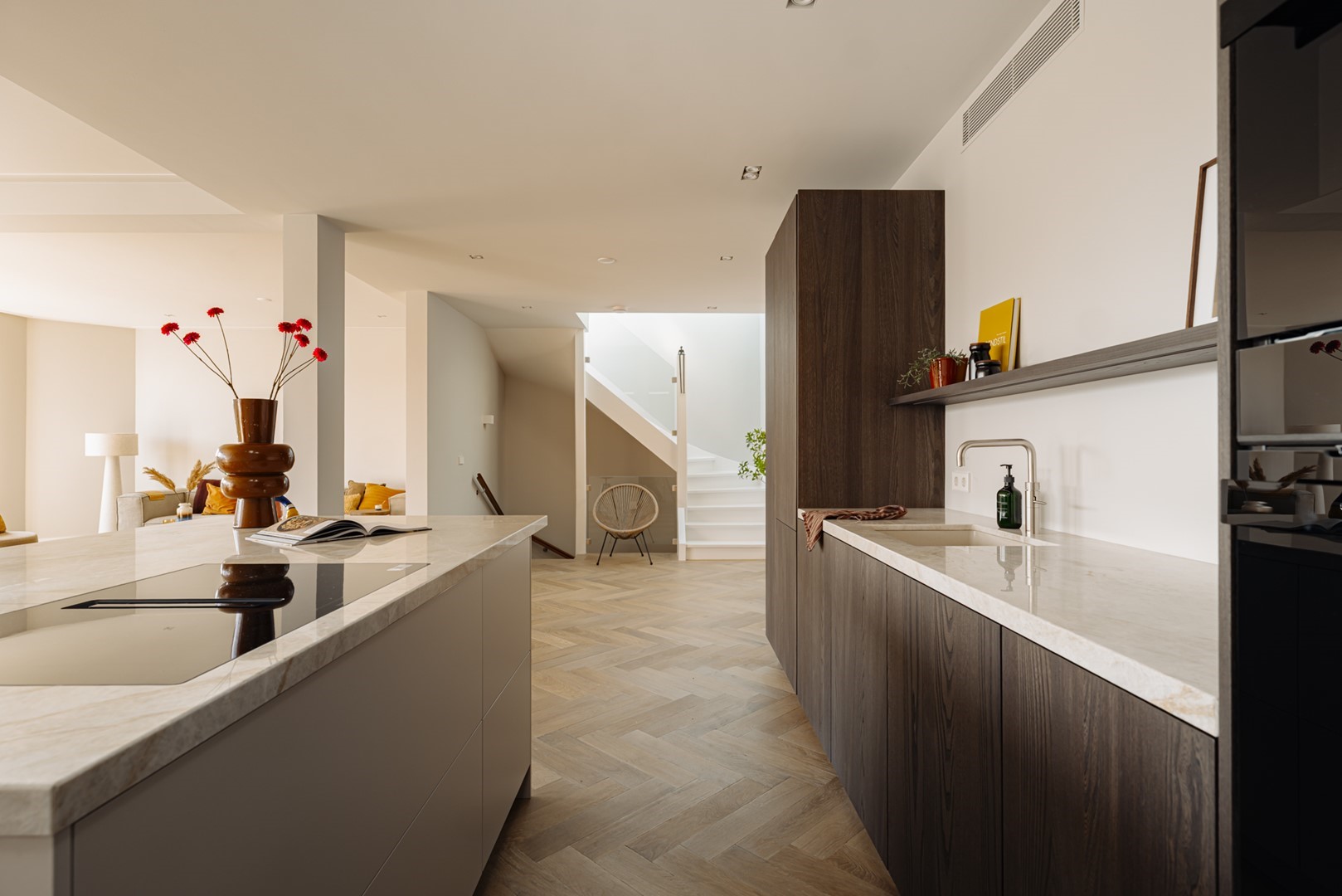 We beginnen beneden, aan de Oranje Nassaulaan. Een statige bordestrap leidt naar de gemeenschappelijke entree, waar het licht door glas-in-lood valt. Daarnaast is er een tweede entree op grond niveau waarbij je direct in de lift stapt die rechtstreeks in het appartement uitkomt, een zeldzaam kenmerk voor dit type gebou. Eenmaal binnen valt direct op hoe rustig en helder de ruimte is. Eiken visgraatvloeren vangen het daglicht dat vanaf de voor- en achterzijde binnenvalt. De woonkamer ligt aan de tuinzijde en heeft een open verbinding met de keuken. Die is uitgevoerd in warm houtfineer, met een vrijstaand eiland in licht natuursteen. Alles is op maat gemaakt, van de kastenwand tot de nissen met indirect licht. Hier kun je koken, praten, zitten, lezen, zonder dat de ruimte zich opdringt.