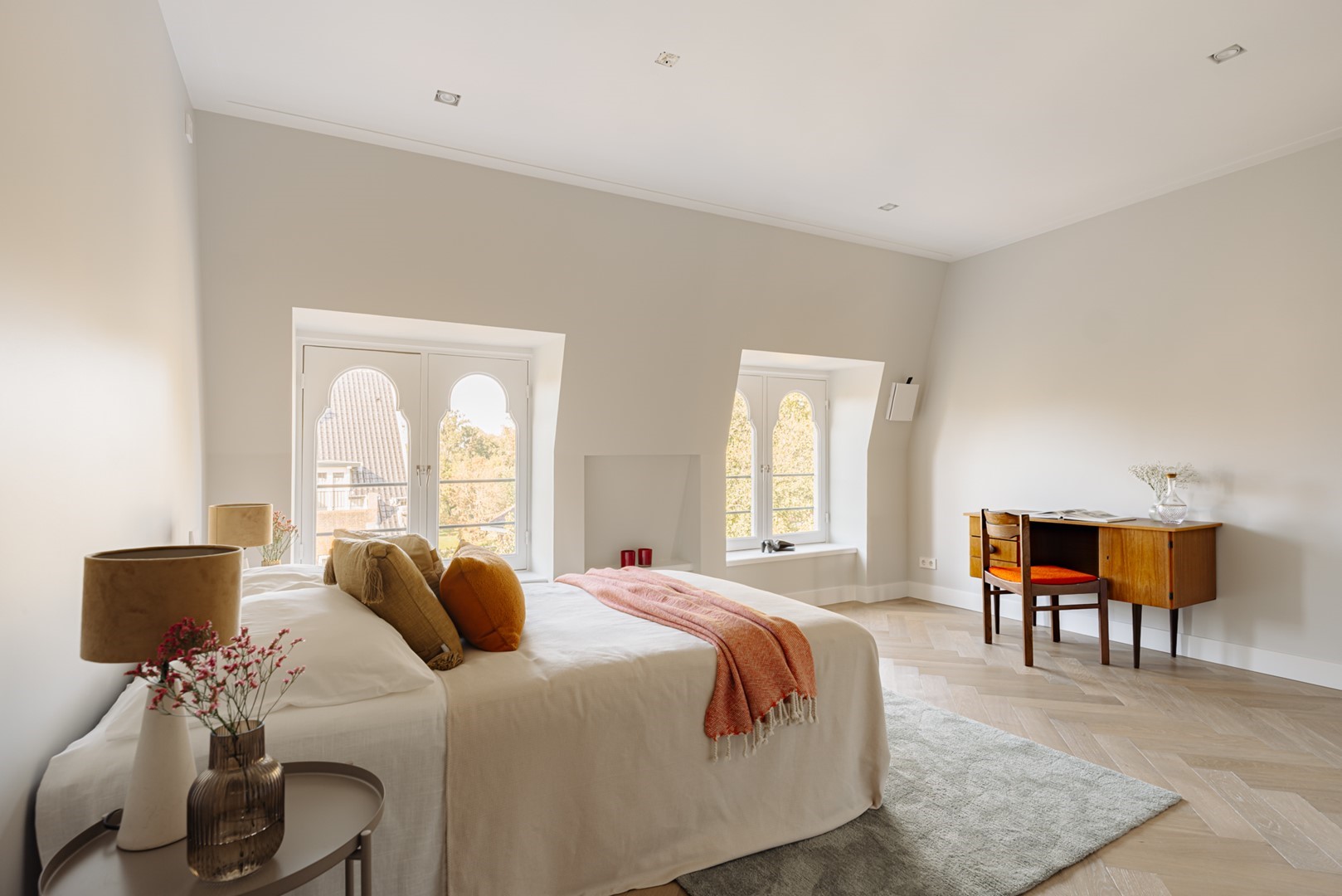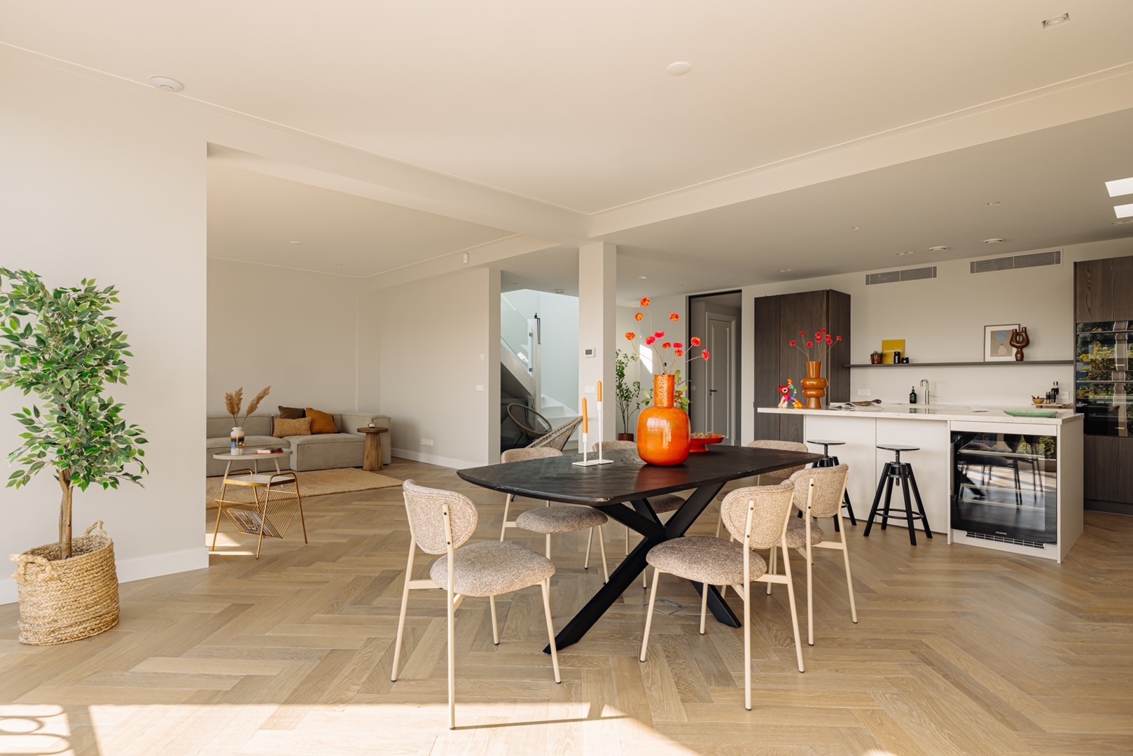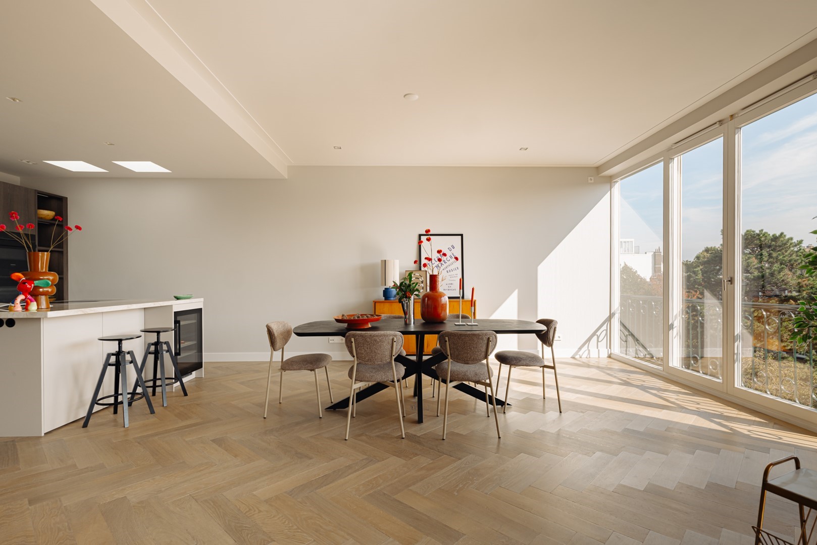 The journey begins downstairs, along the Oranje Nassaulaan. A stately staircase leads to the shared entrance, where light filters through stained glass. There is also a second entrance at ground level, granting direct access to the lift that opens straight into the apartment — a rare feature for this type of building. Once inside, the tranquillity and clarity of the space are immediately apparent. Oak herringbone floors capture the daylight streaming in from both the front and rear. The living area, positioned at the garden side, flows openly into the kitchen. Executed in warm wood veneer with a freestanding island in light natural stone, every element is tailor-made — from the cabinetry to the softly lit niches. It is a place to cook, converse, read, and unwind without the space ever imposing itself. At the street side lie two bedrooms — quiet and secluded. The primary bedroom is generous, with custom-built wardrobes spanning the full width. Adjacent lies the bathroom: serene in tone, featuring a walk-in shower, freestanding bath, and double limestone washbasin. Everything is finished to perfection, combining understated luxury with thoughtful practicality. From the hallway, a fixed staircase ascends beneath a glass skylight. Above awaits the roof terrace — spacious, sheltered, and offering a view over the leafy neighbourhood. Here, the elevation of the residence can truly be felt: the rhythm of the city at a distance. It is quiet, sunlit, and unexpectedly private — a space that feels as much outside as part of the home. Back indoors, everything feels effortless: the lift that carries one from the street directly into the home, the circulation that makes perfect sense, the materials that create calm. This is not a compromise, but a conviction — Living in Perfection, in the heart of Oud-Zuid.