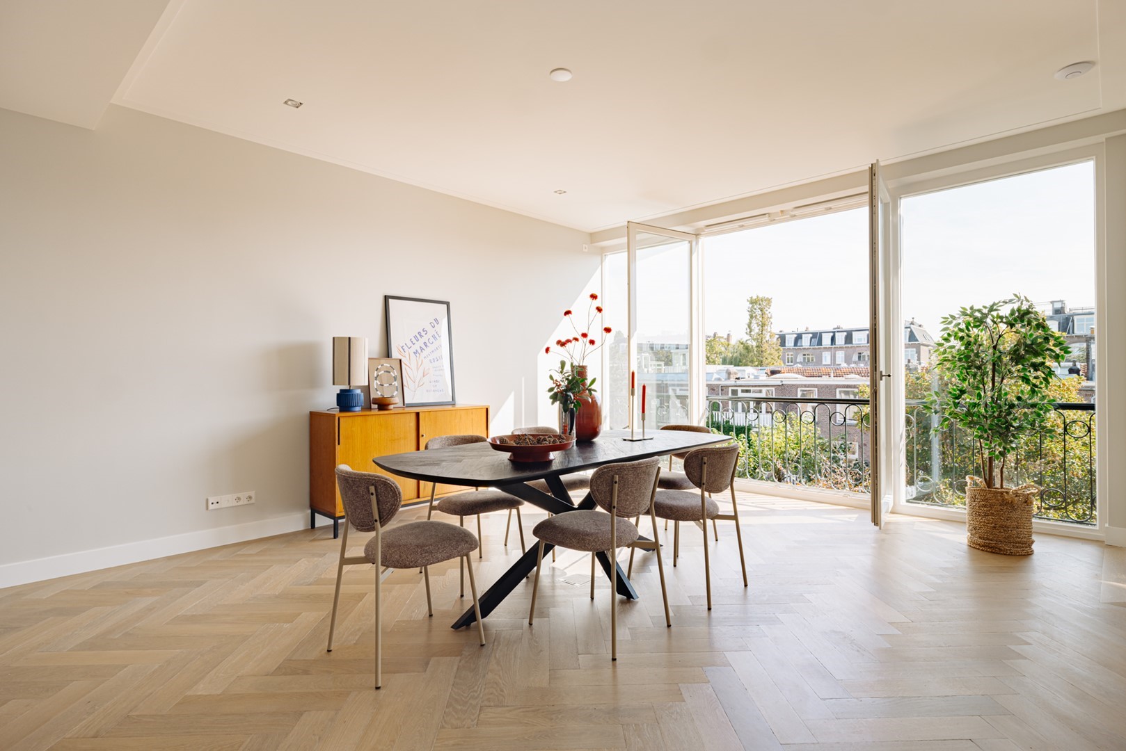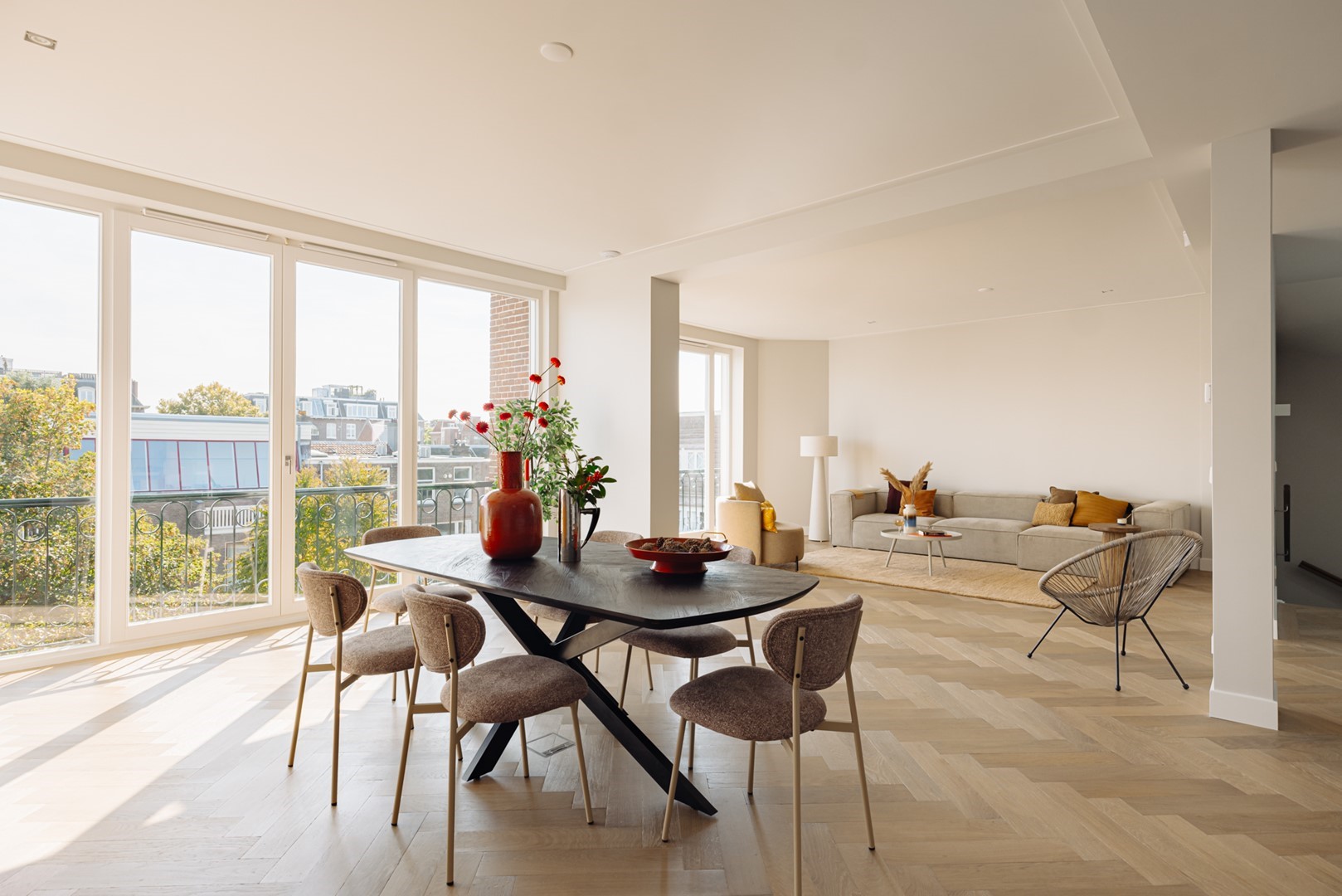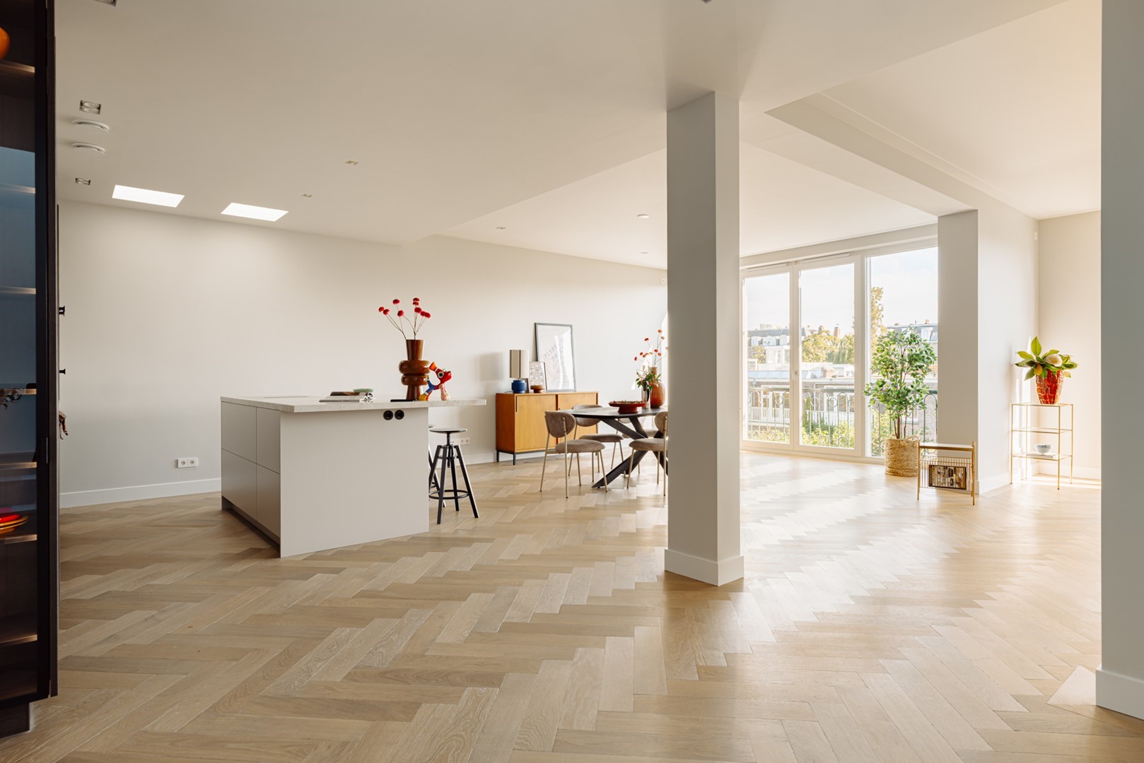 Living in Perfection | A characterful upper residence in Amsterdam-Zuid of approximately 159 m² with a rooftop terrace. Completely redeveloped with a refined vision of comfort, aesthetics, and craftsmanship. The recent renovation features bespoke solutions, high-quality installations, and a subdued palette of natural materials. Modern expression and timeless architecture converge in details such as oak herringbone floors, sophisticated lighting, and a carefully designed living kitchen, two bedrooms, and two bathrooms. With a private entrance, lift access, sunny roof terrace, and a location near Vondelpark, this residence forms a balanced whole in which everything harmoniously comes together.