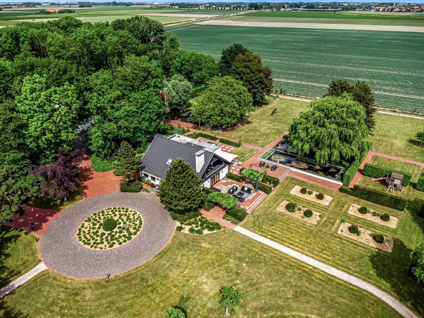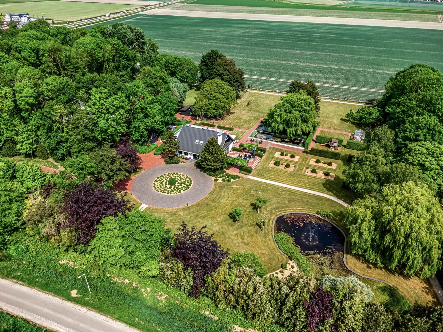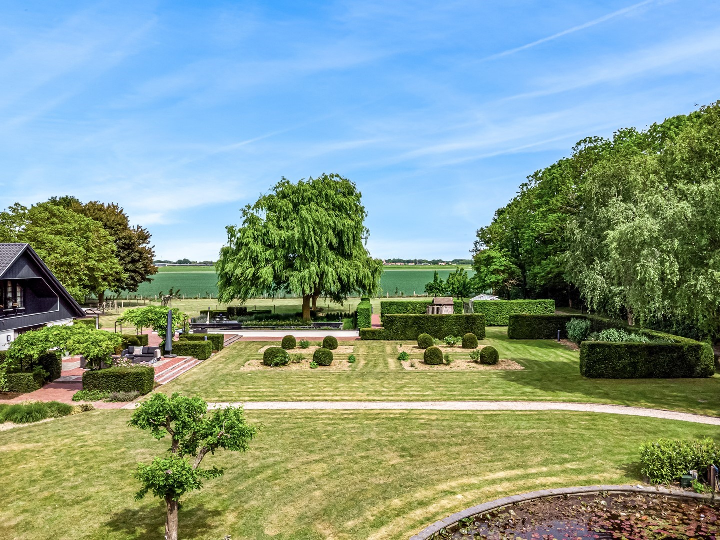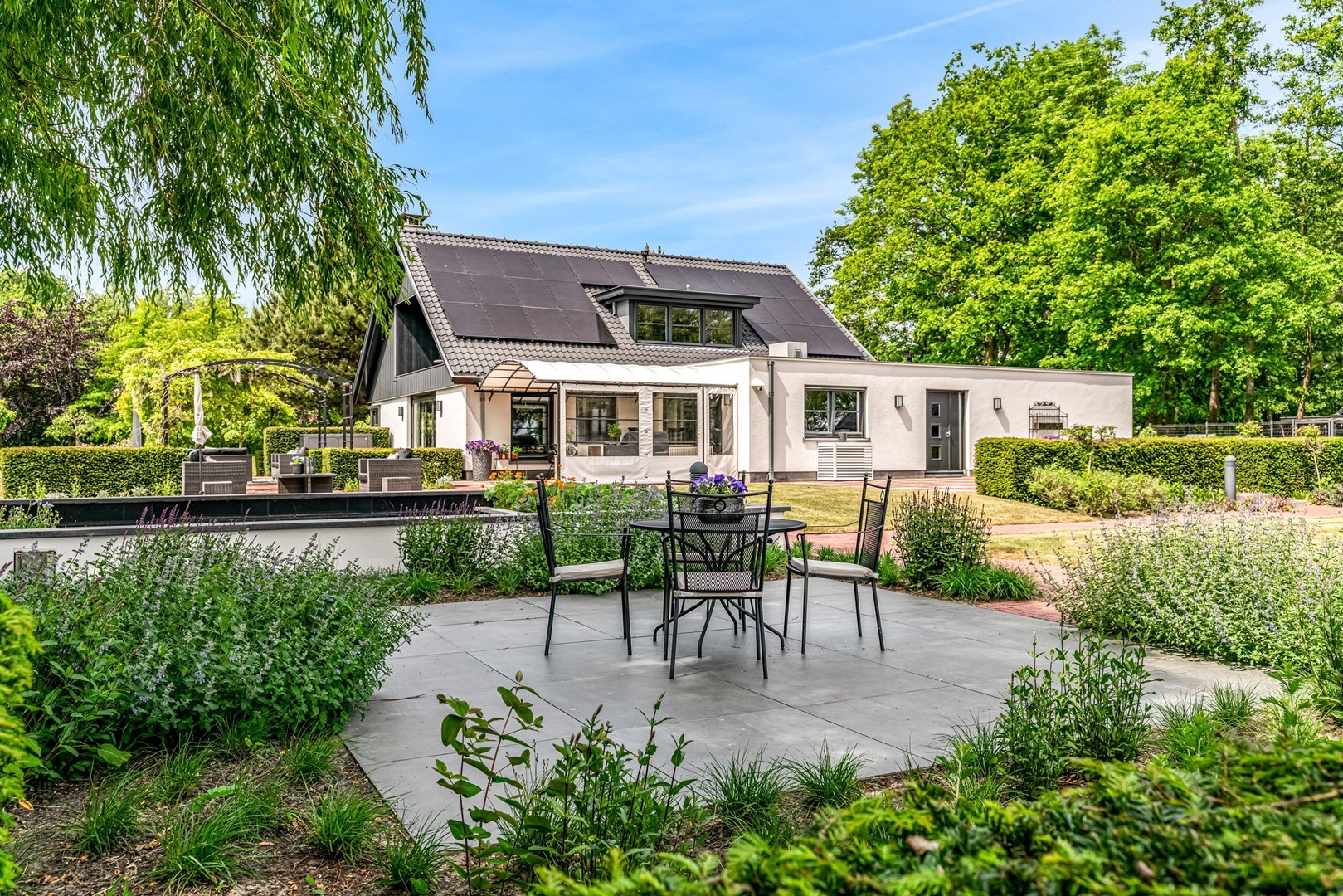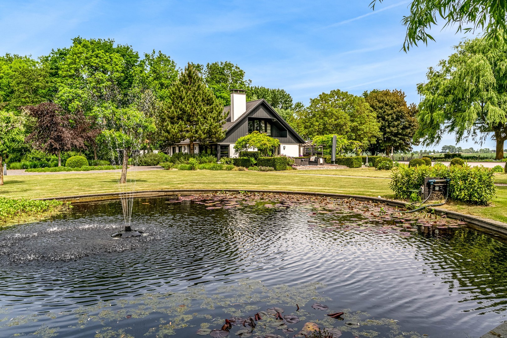 Achter de elektrische poort en via de statige oprijlaan ontvouwt zich een zorgvuldig gecomponeerd landschap, ontworpen door tuinarchitect Arend Jan van der Horst. Sierlijke paden, waterpartijen en doordachte zichtlijnen zorgen voor een rustig en samenhangend geheel. Dit is geen tuin, maar een leefomgeving van uitzonderlijk niveau.