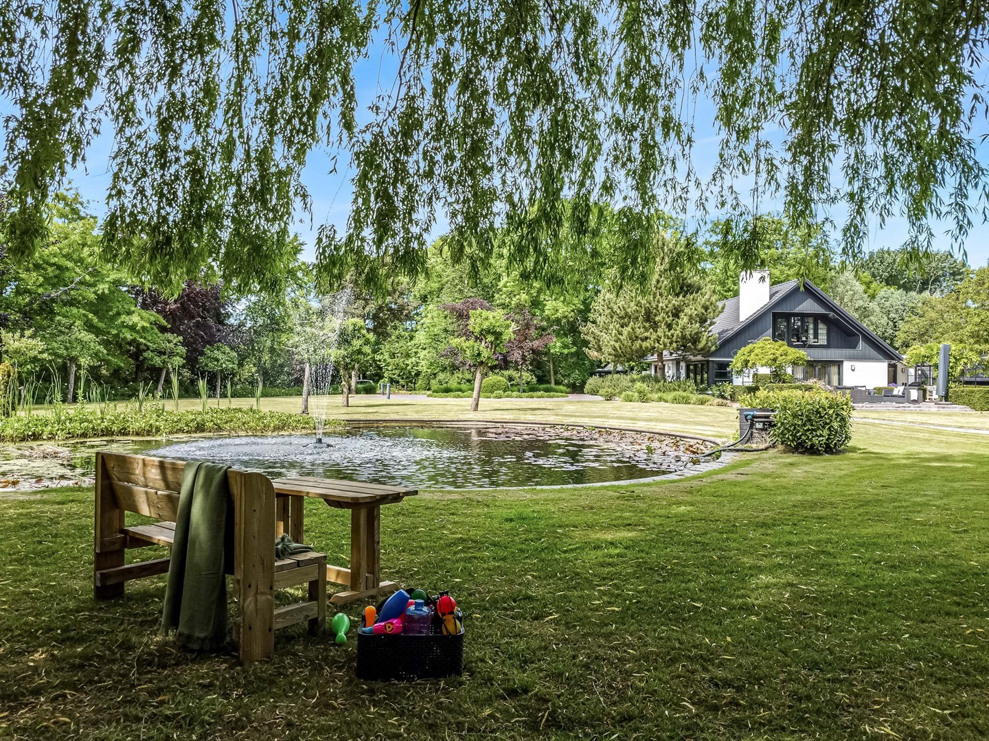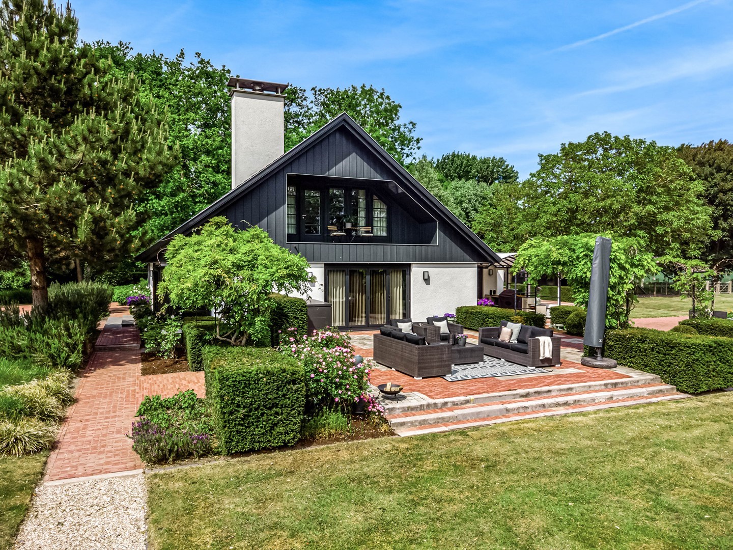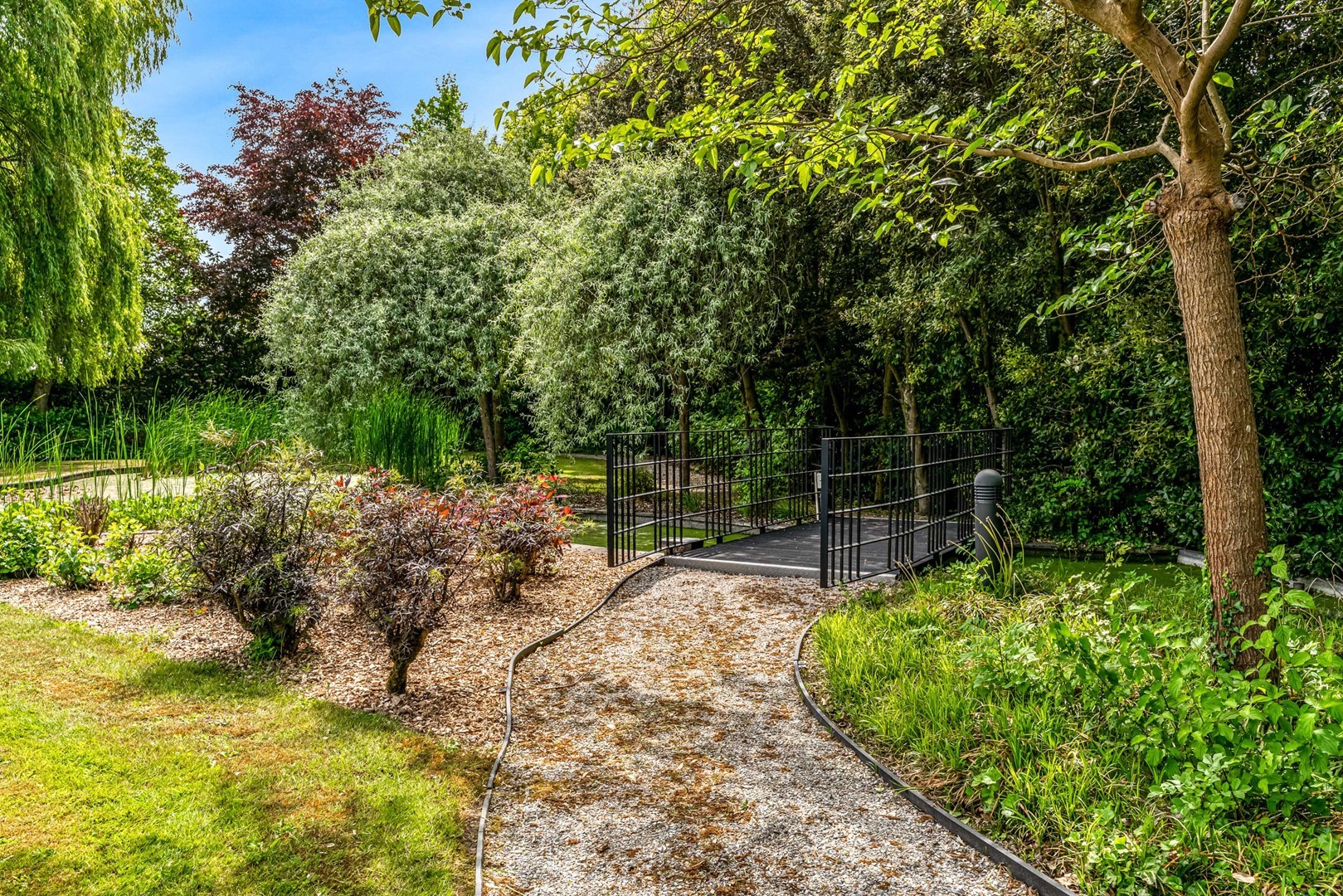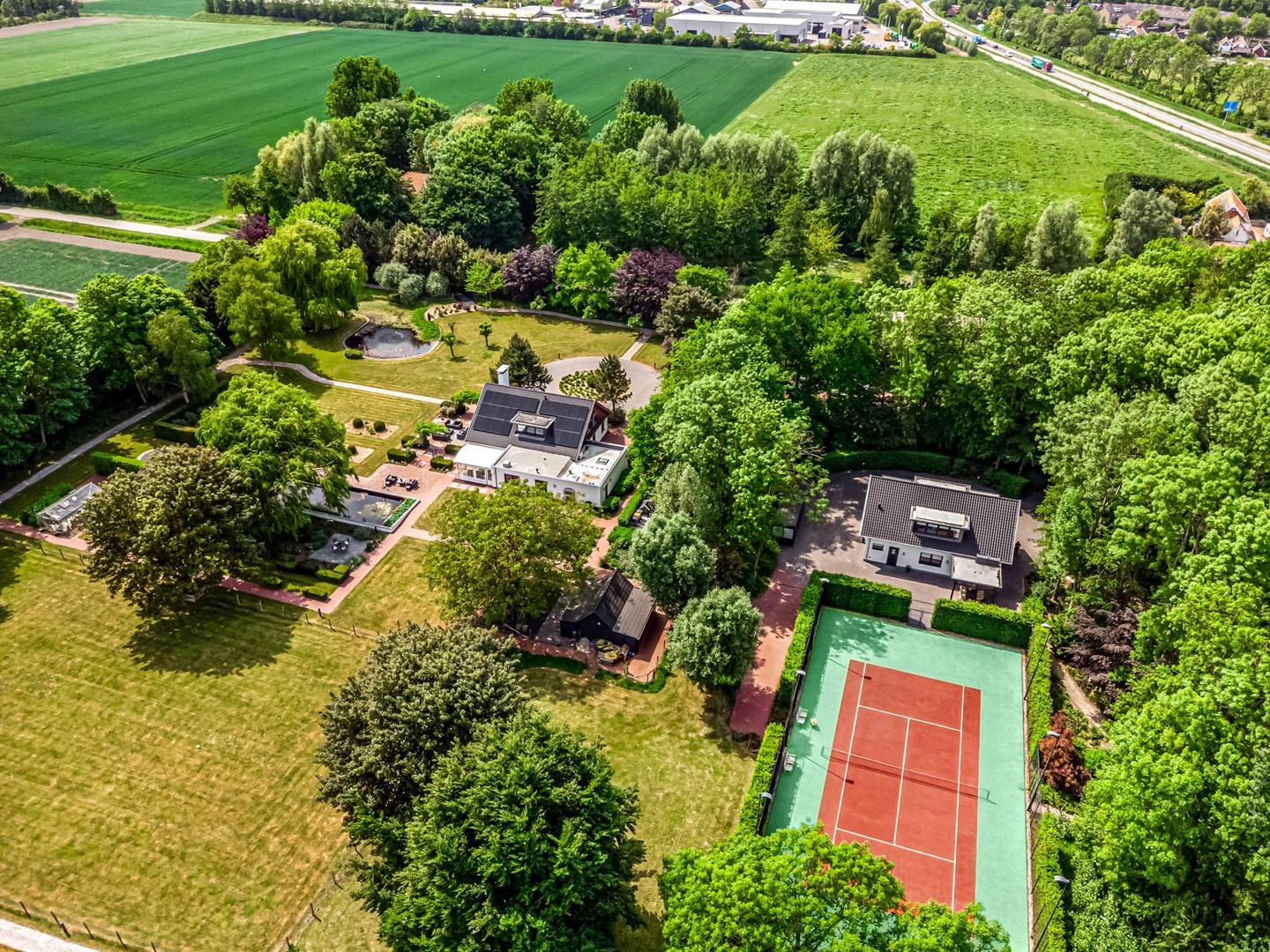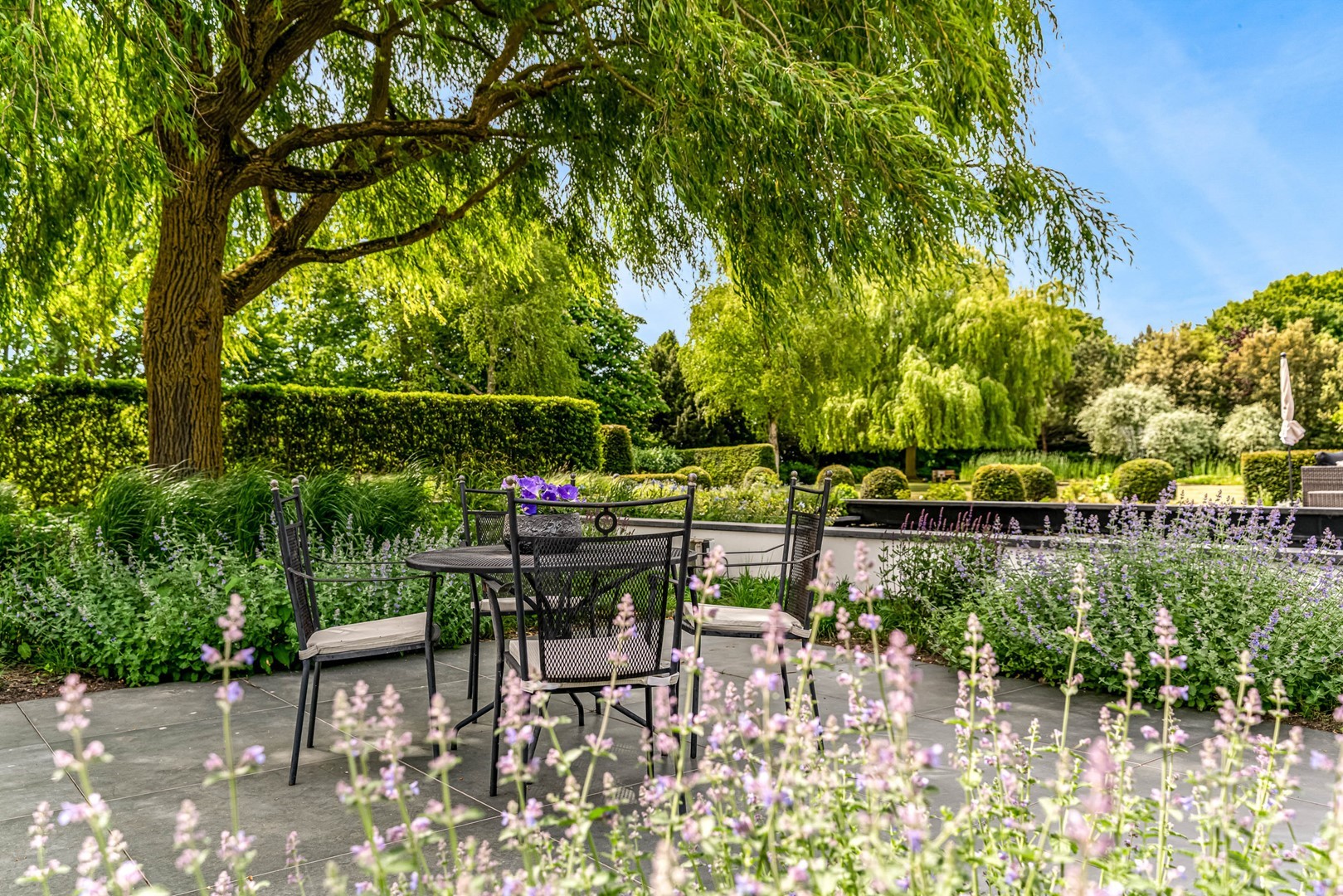 Achter de elektrische poort en via de statige oprijlaan ontvouwt zich een zorgvuldig gecomponeerd landschap, ontworpen door tuinarchitect Arend Jan van der Horst. Sierlijke paden, waterpartijen en doordachte zichtlijnen zorgen voor een rustig en samenhangend geheel. Dit is geen tuin, maar een leefomgeving van uitzonderlijk niveau.
