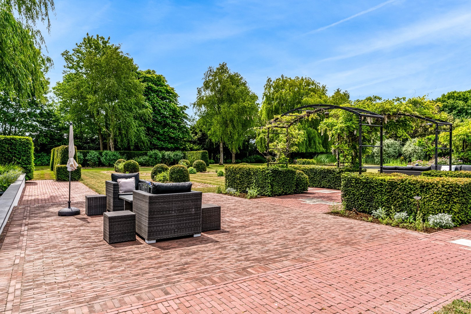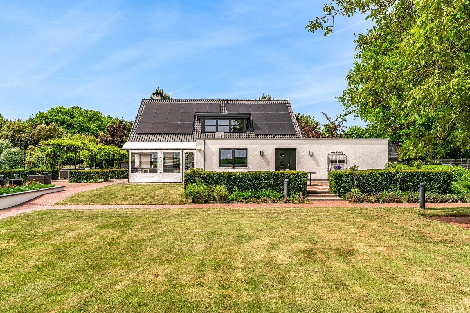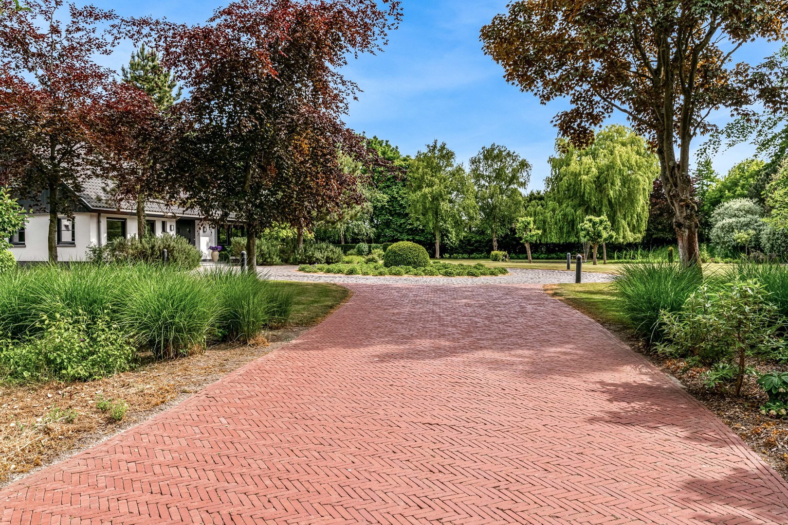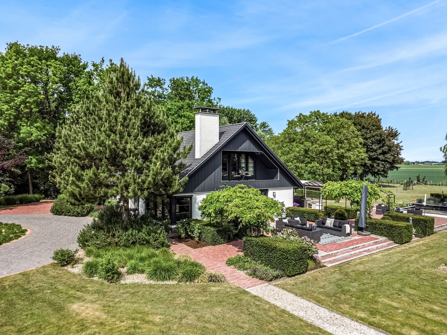 Achter de elektrische poort en via de statige oprijlaan ontvouwt zich een zorgvuldig gecomponeerd landschap, ontworpen door tuinarchitect Arend Jan van der Horst. Sierlijke paden, waterpartijen en doordachte zichtlijnen zorgen voor een rustig en samenhangend geheel. Dit is geen tuin, maar een leefomgeving van uitzonderlijk niveau.