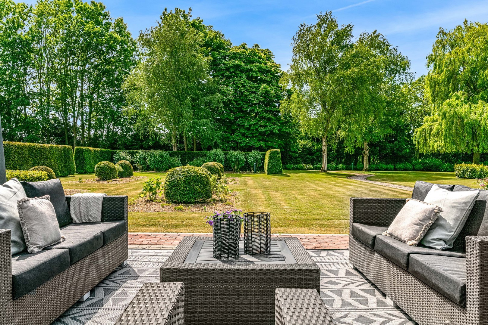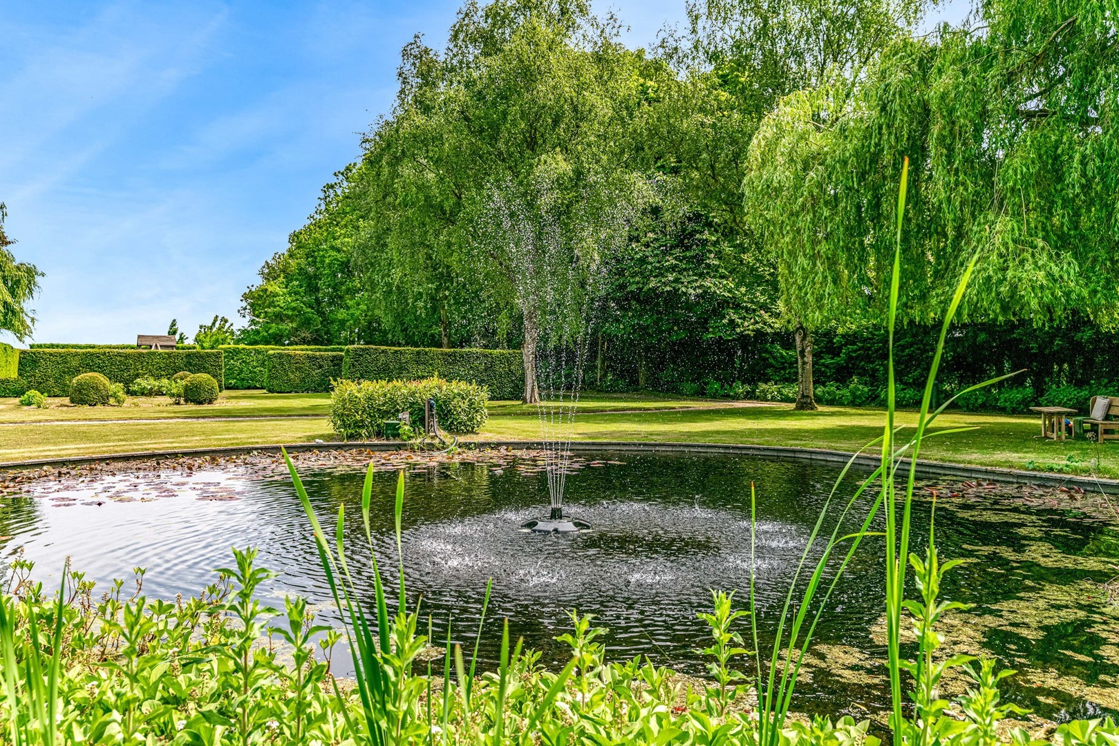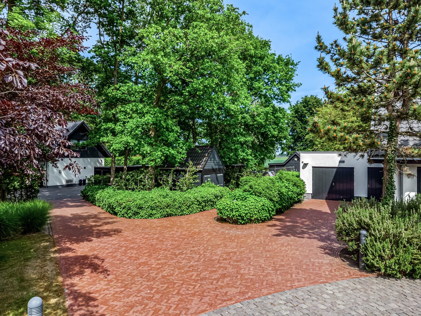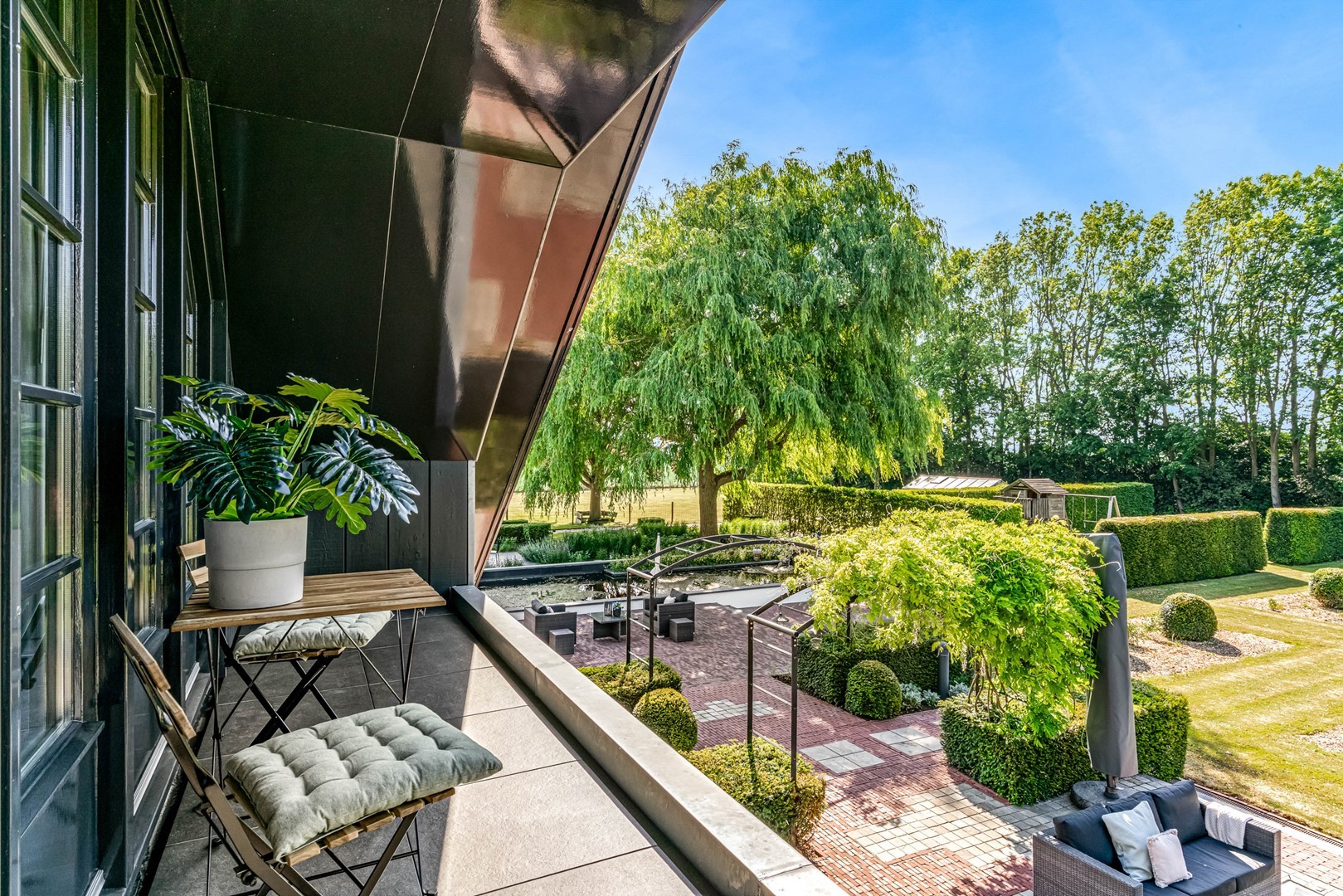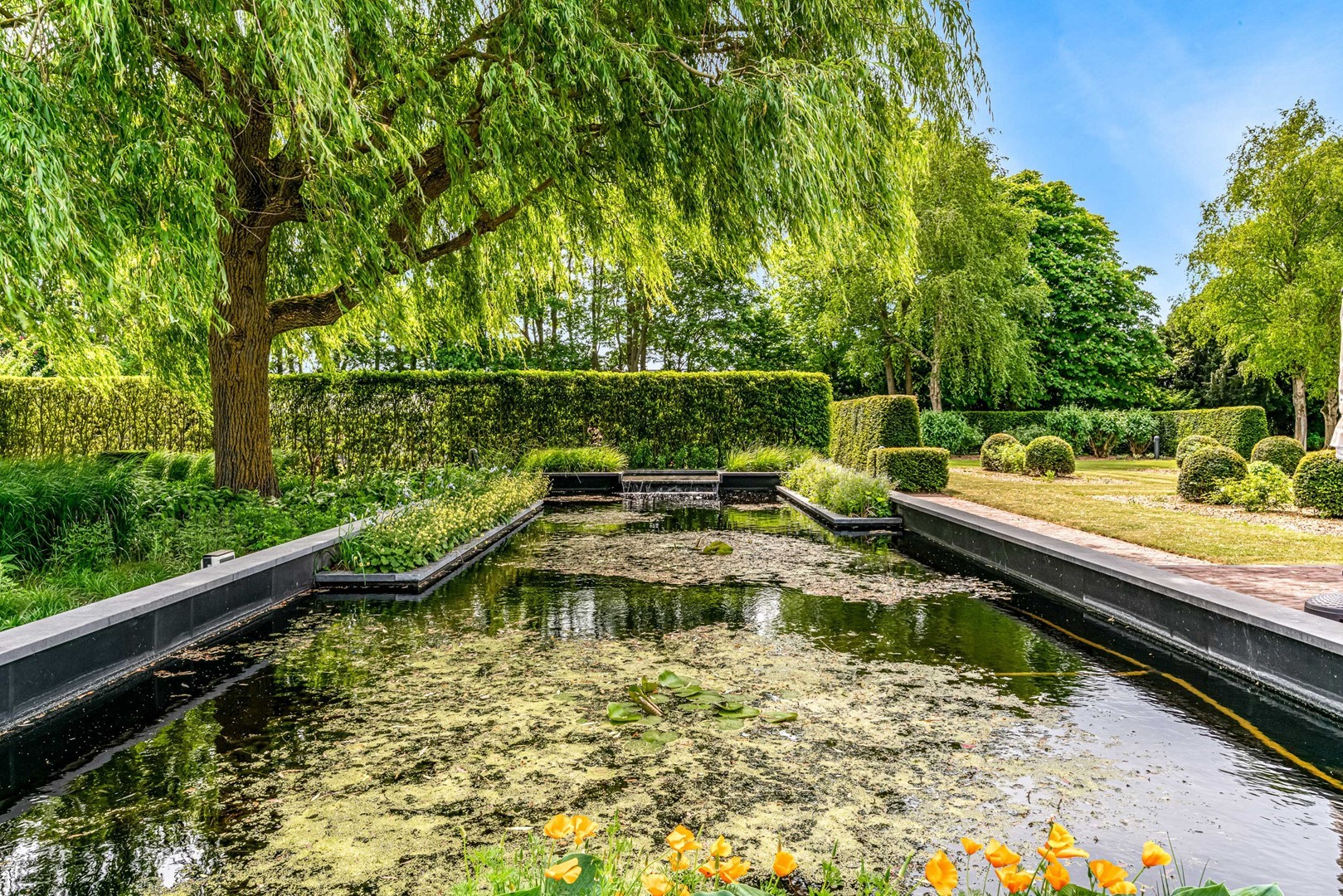 Achter de elektrische poort en via de statige oprijlaan ontvouwt zich een zorgvuldig gecomponeerd landschap, ontworpen door tuinarchitect Arend Jan van der Horst. Sierlijke paden, waterpartijen en doordachte zichtlijnen zorgen voor een rustig en samenhangend geheel. Dit is geen tuin, maar een leefomgeving van uitzonderlijk niveau.