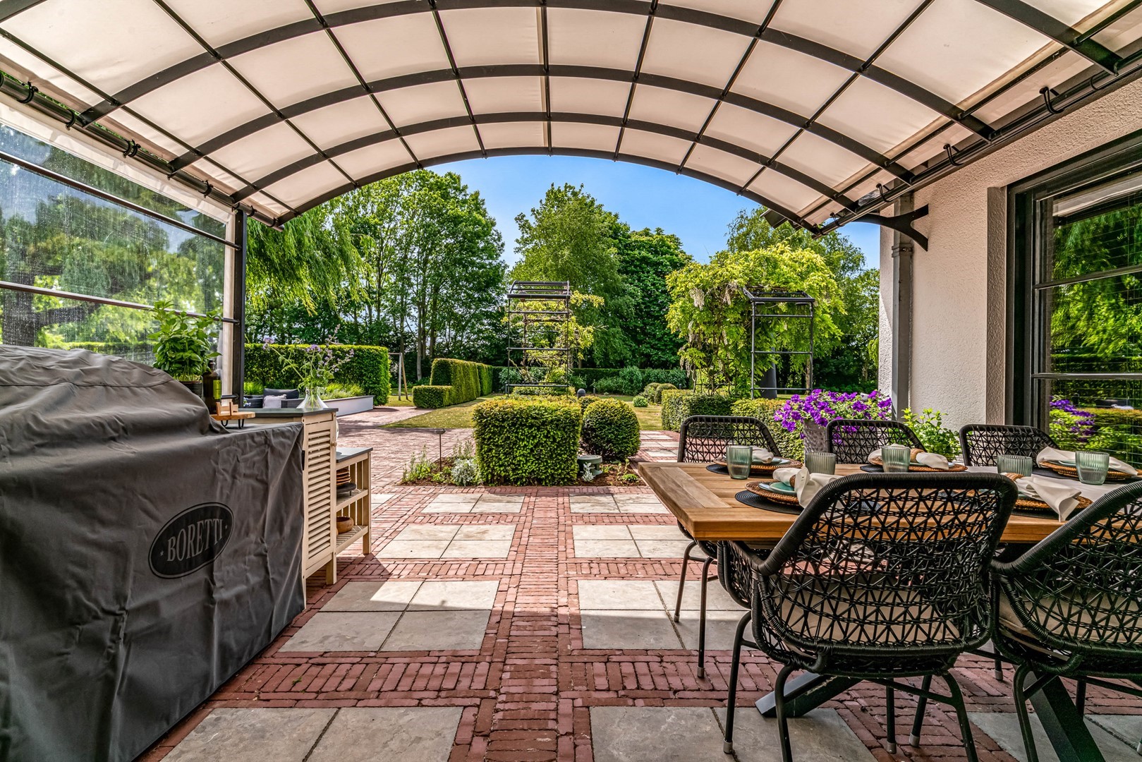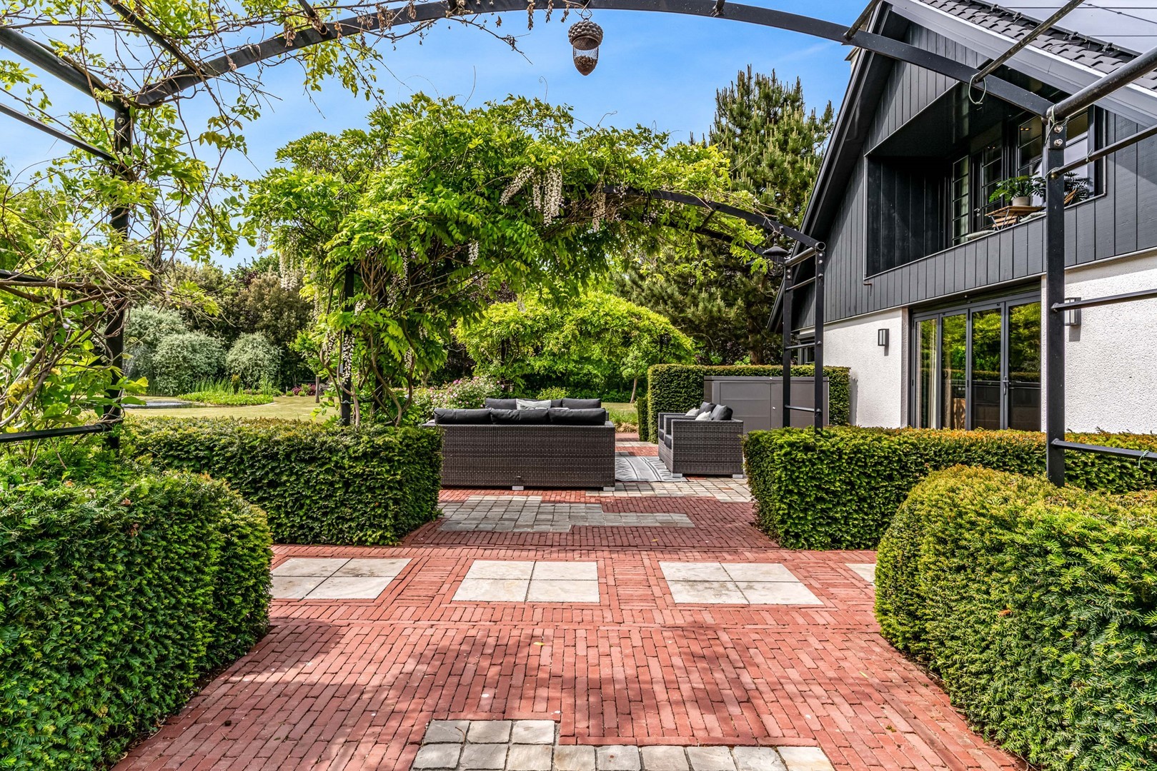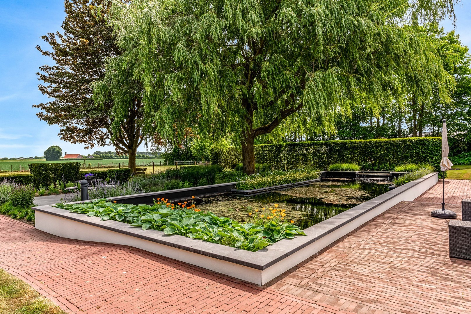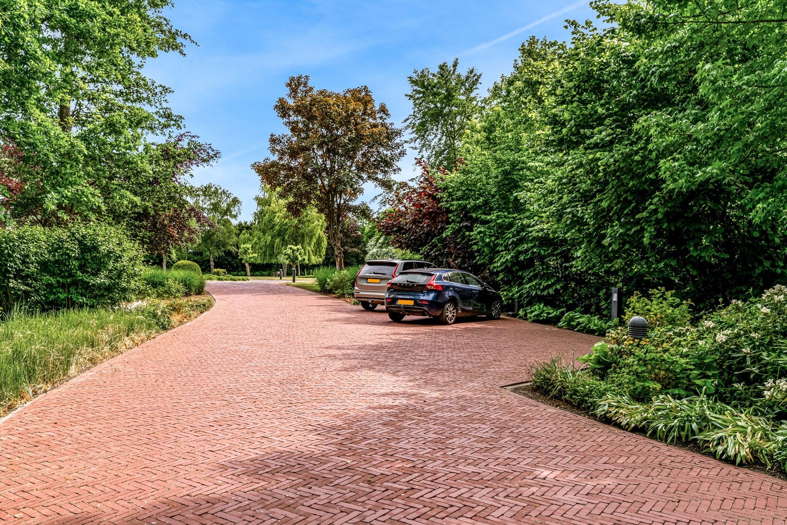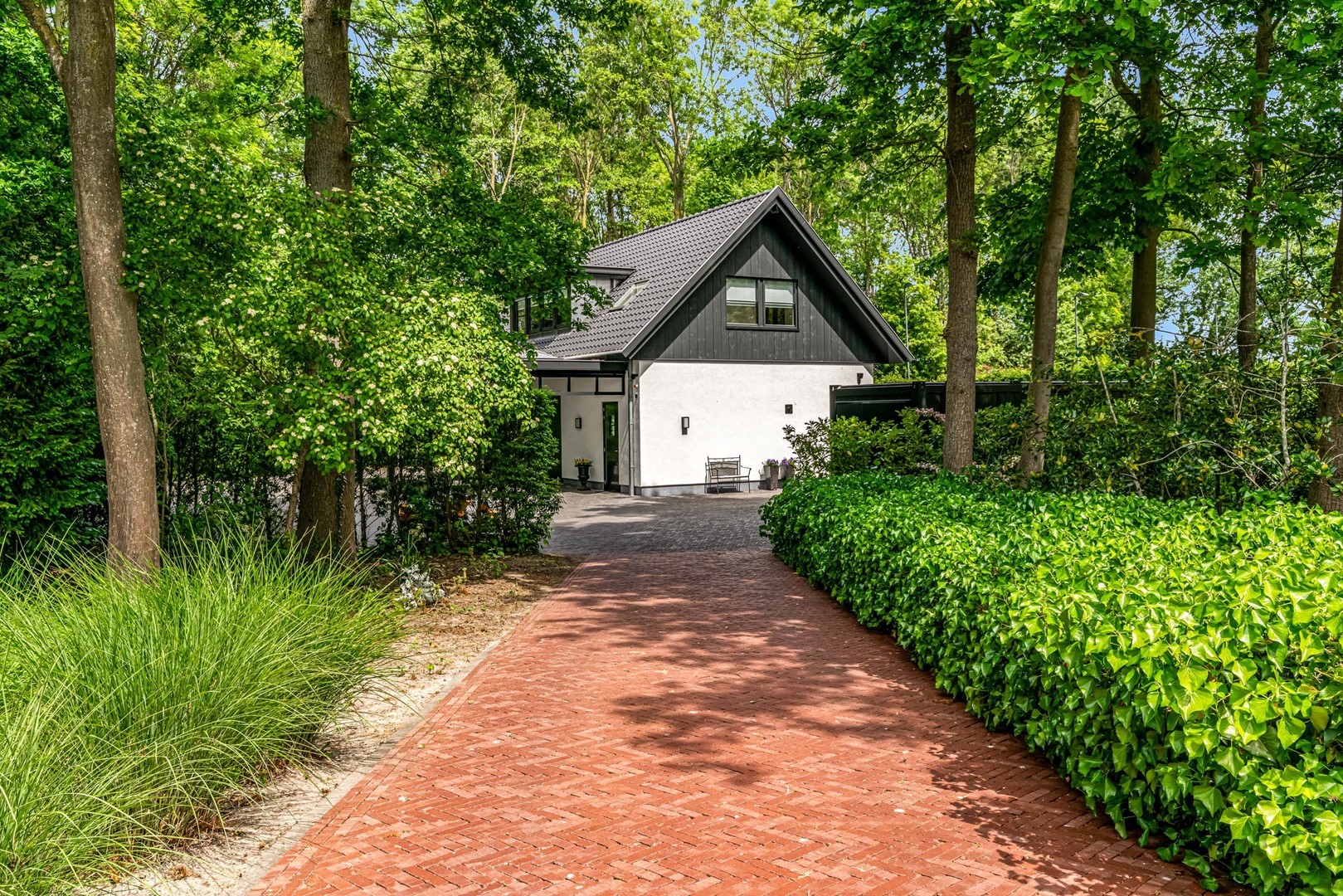 Achter de elektrische poort en via de statige oprijlaan ontvouwt zich een zorgvuldig gecomponeerd landschap, ontworpen door tuinarchitect Arend Jan van der Horst. Sierlijke paden, waterpartijen en doordachte zichtlijnen zorgen voor een rustig en samenhangend geheel. Dit is geen tuin, maar een leefomgeving van uitzonderlijk niveau.