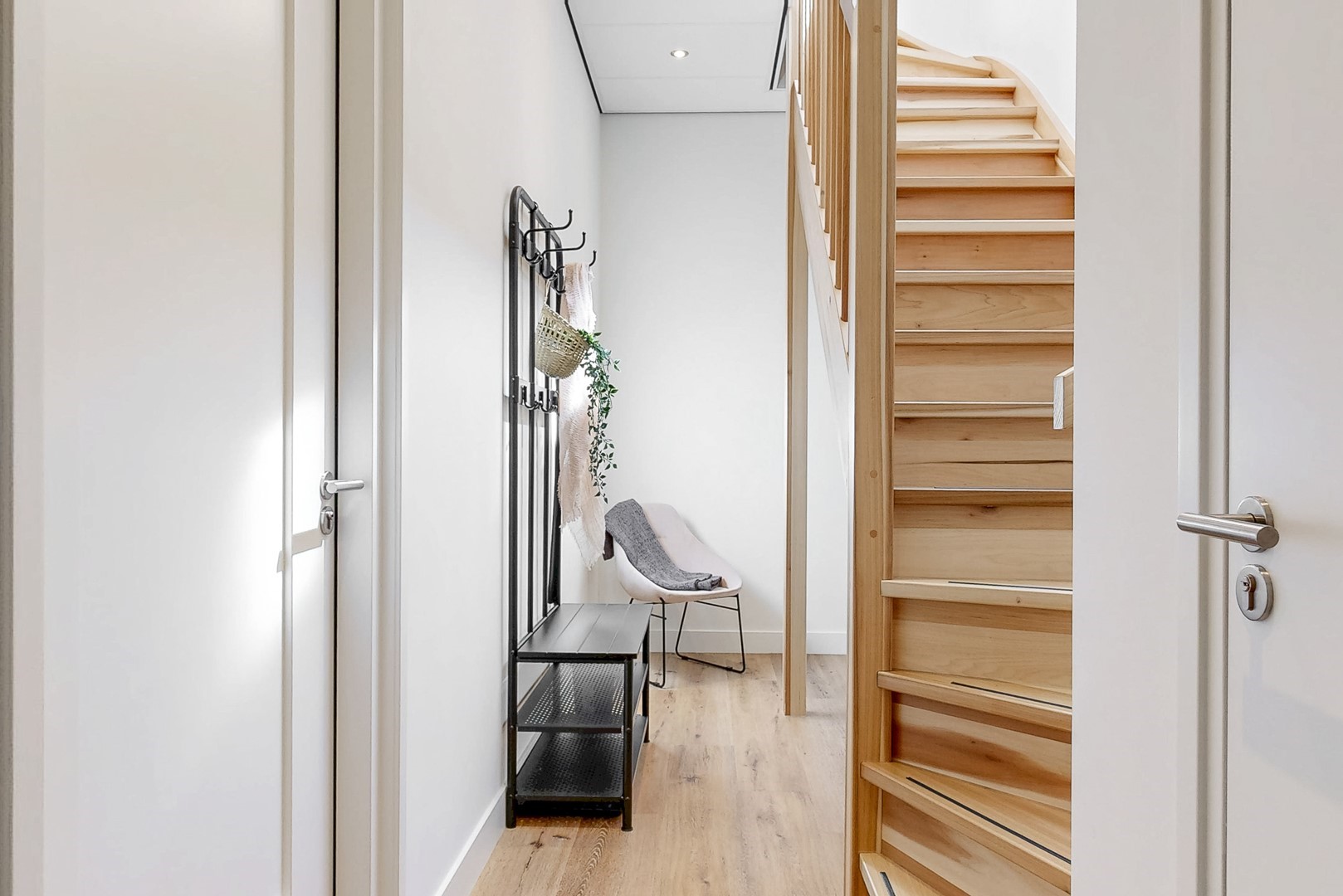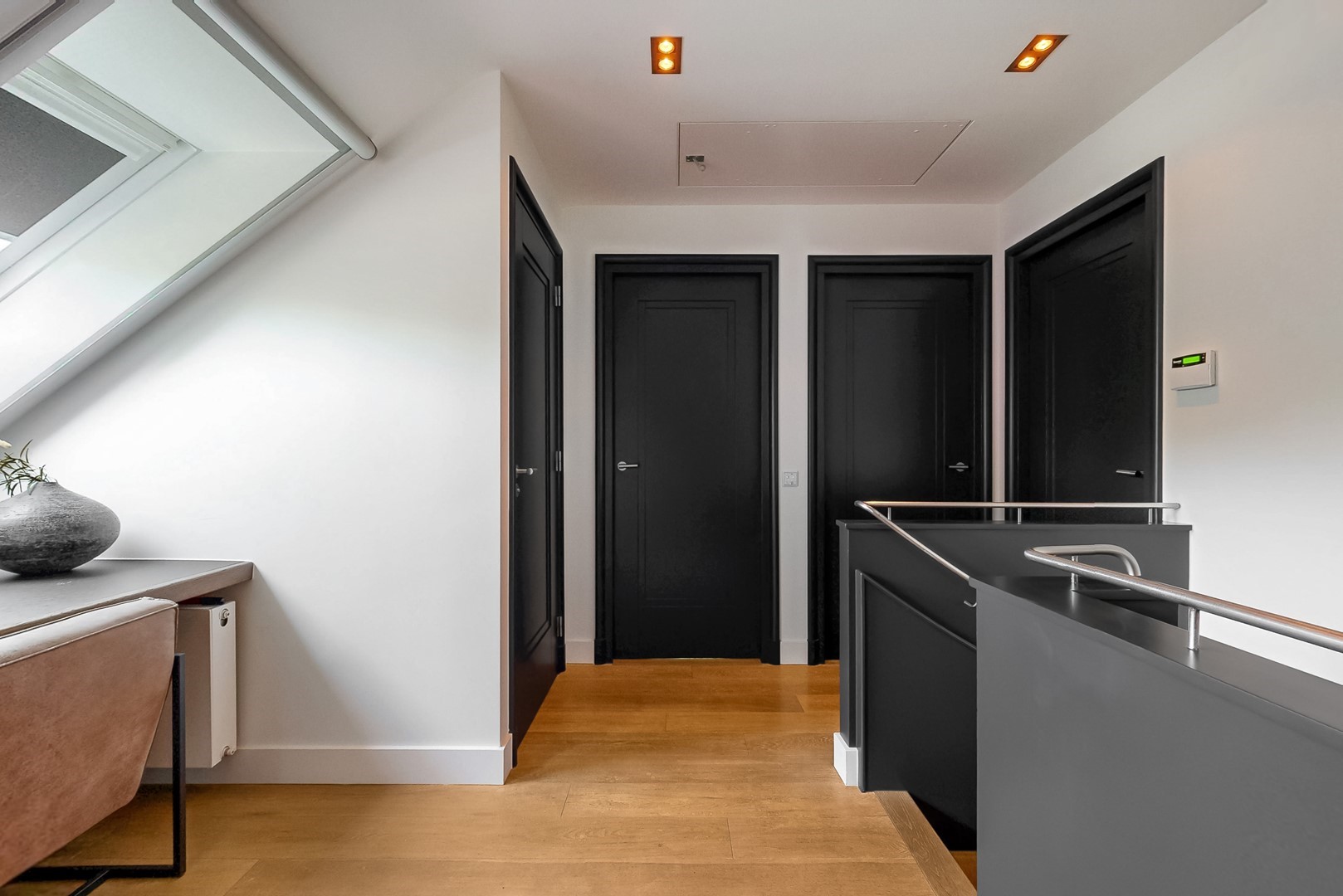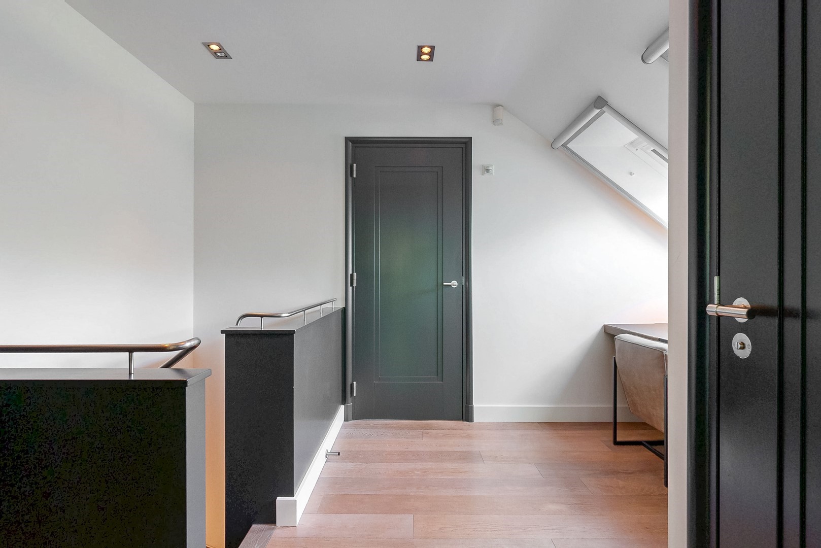 Op de verdieping bevinden zich drie ruime slaapkamers, waaronder een comfortabele master suite met inloopkasten en een balkon op het zuiden. De badkamer is stijlvol en hoogwaardig uitgevoerd en biedt een serene, wellnessachtige beleving.
