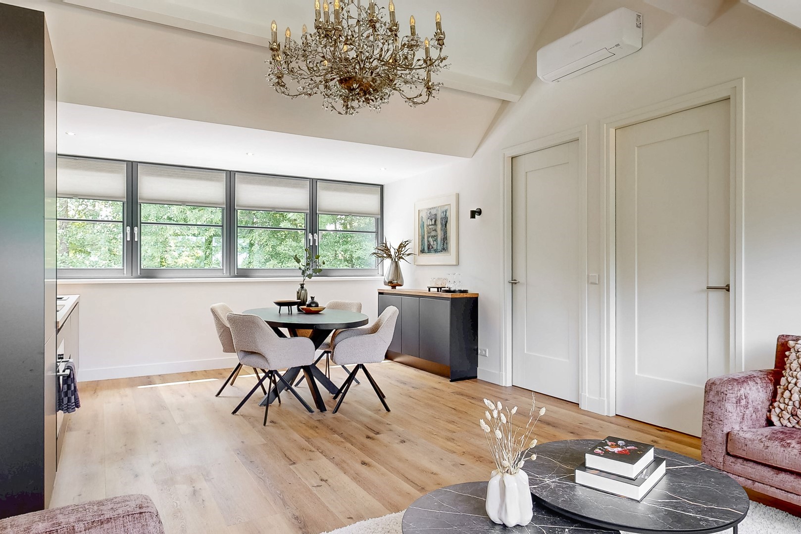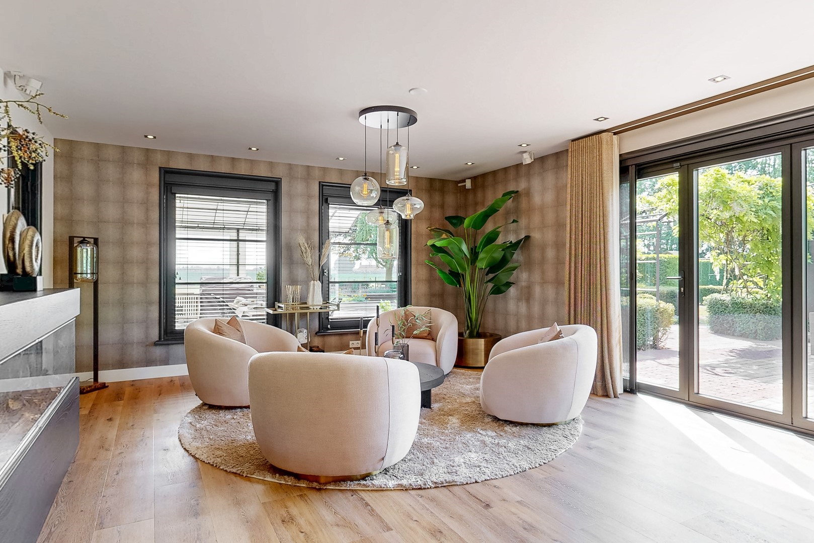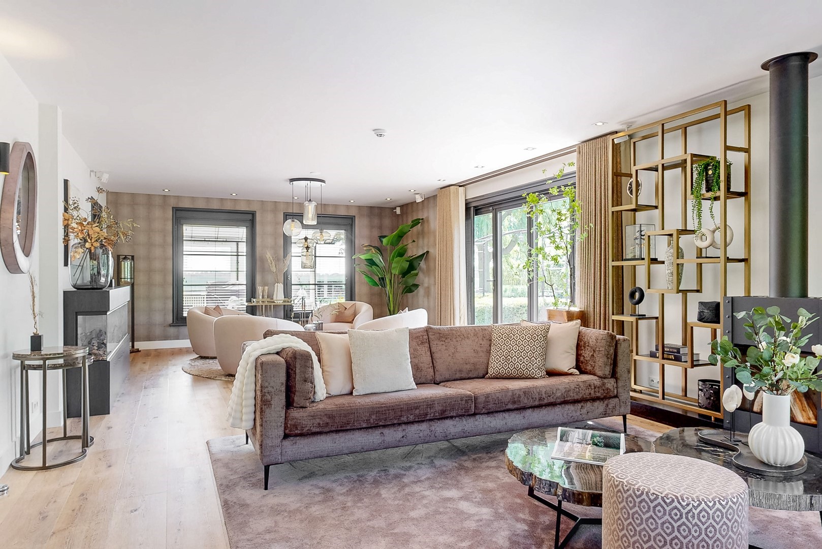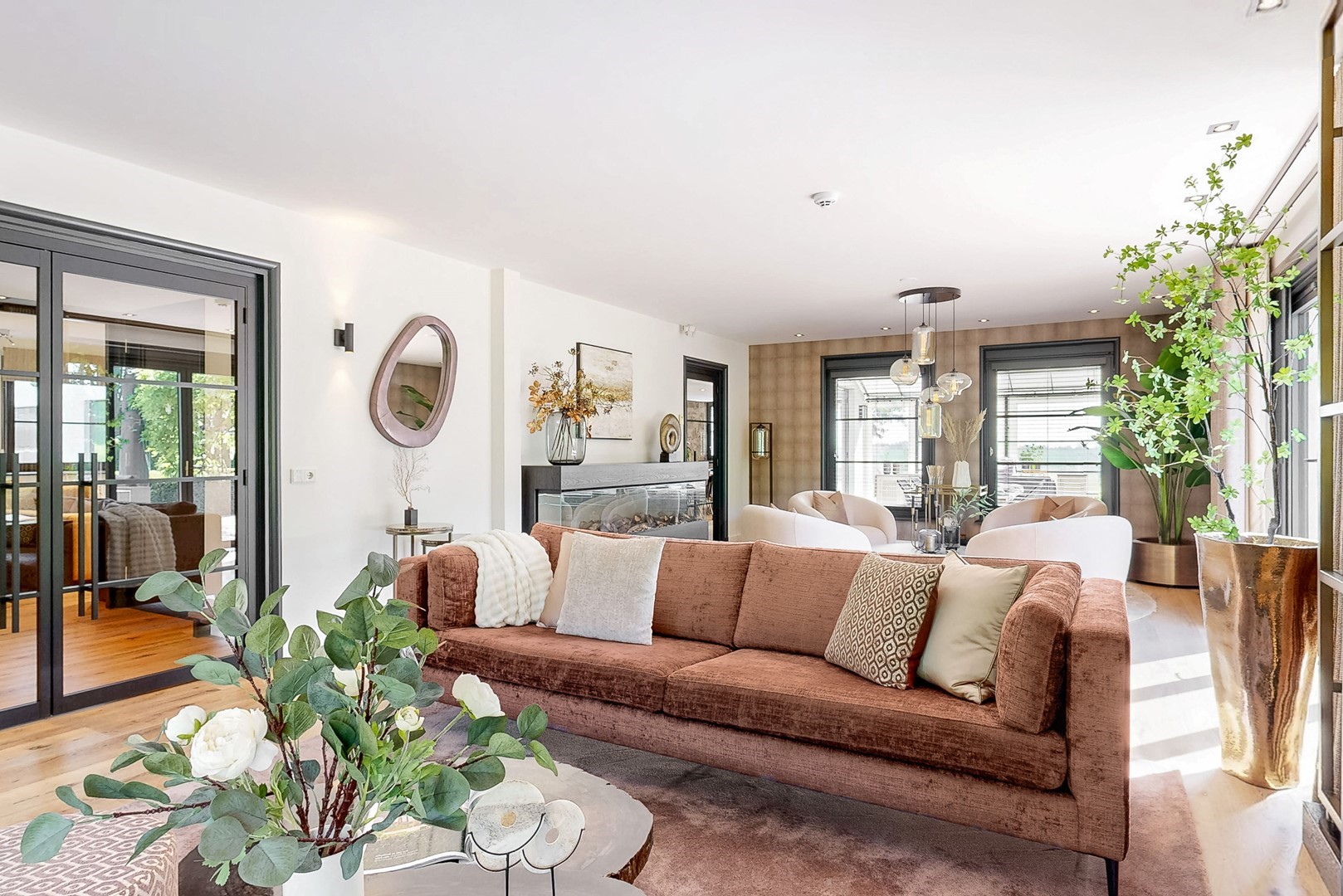 Ook binnen zet die kwaliteit zich moeiteloos voort. De villa kenmerkt zich door een uitgebalanceerde indeling, royale leefruimtes en een warme, elegante sfeer. De woonkamer met haard en panoramisch tuinzicht, de luxe woonkeuken met kookeiland en harmonicadeuren naar het overdekte terras, en de diverse verblijfsruimtes maken dit een huis dat uitnodigt tot zowel ontspannen als ontvangen.
