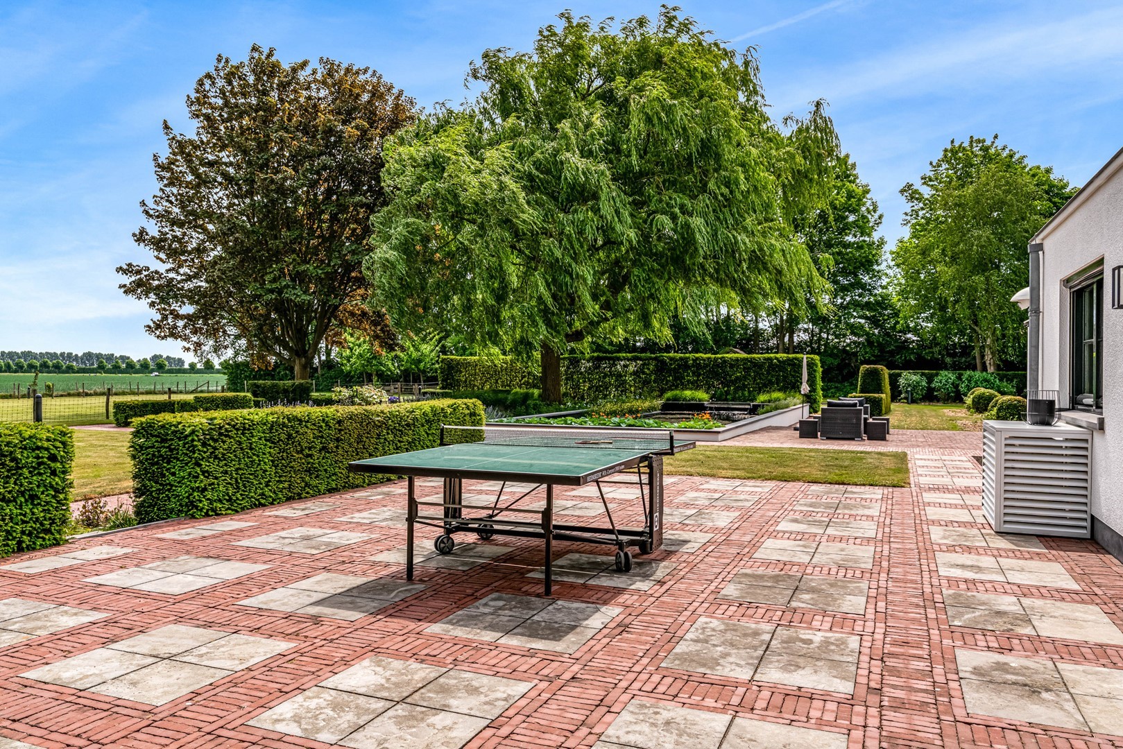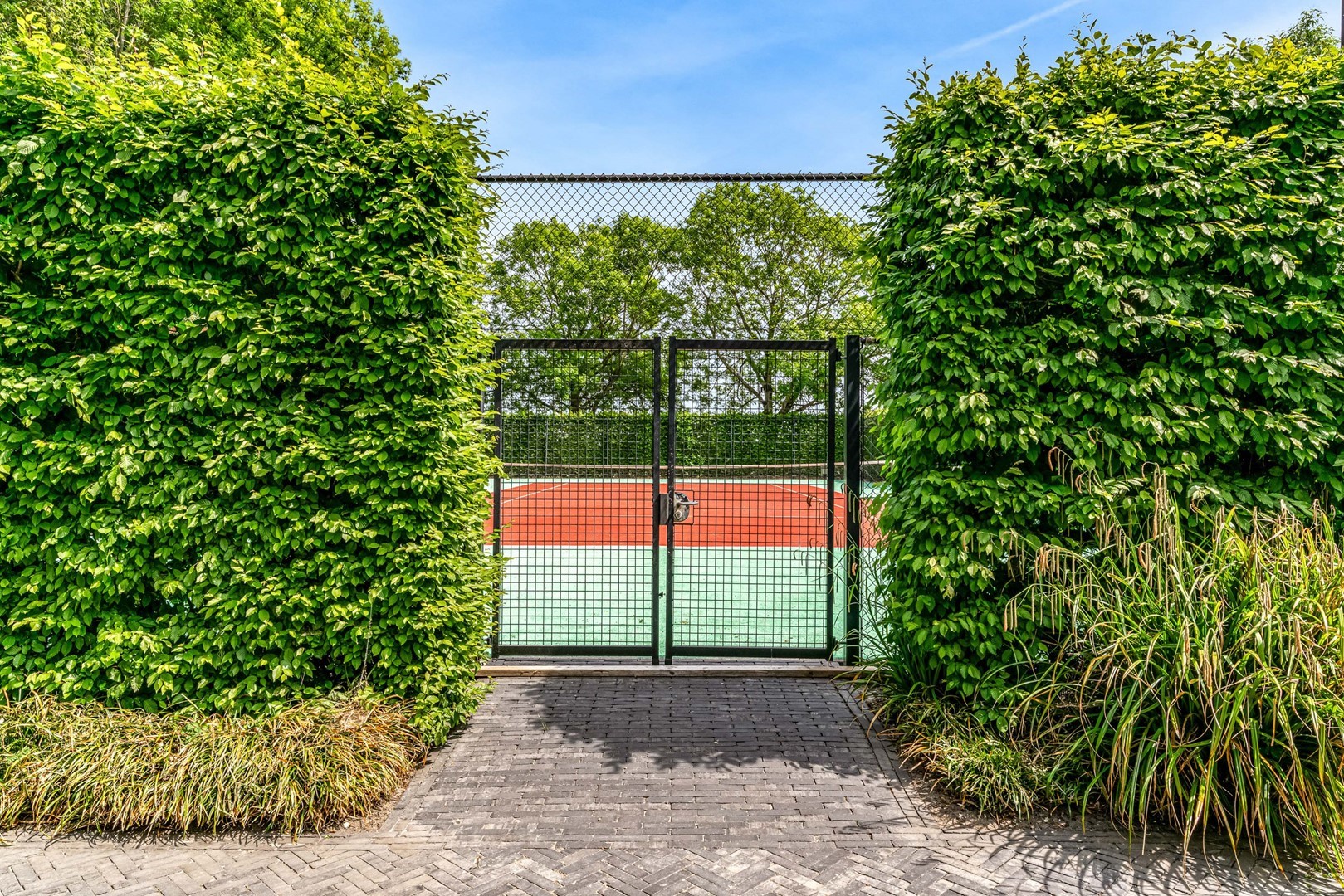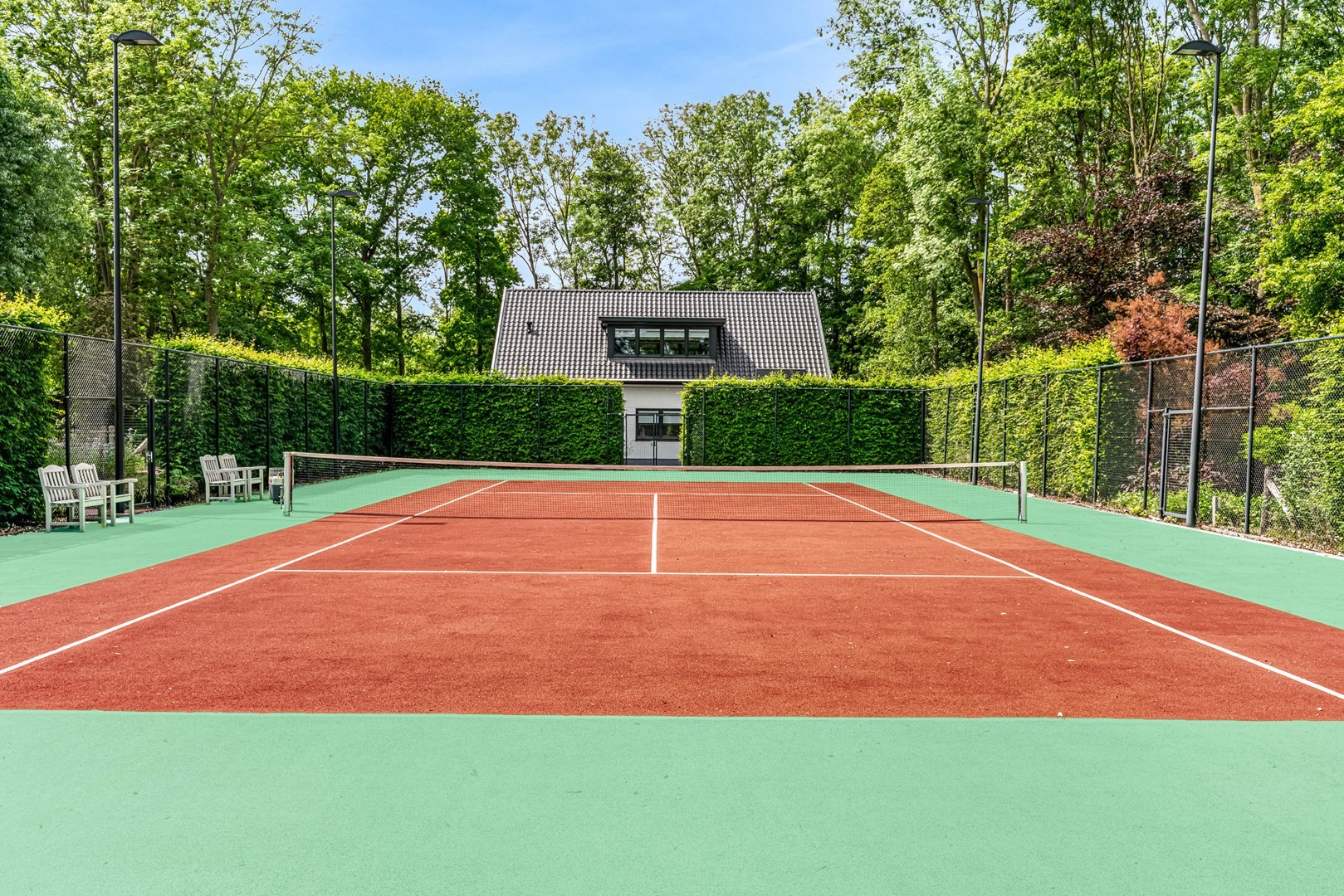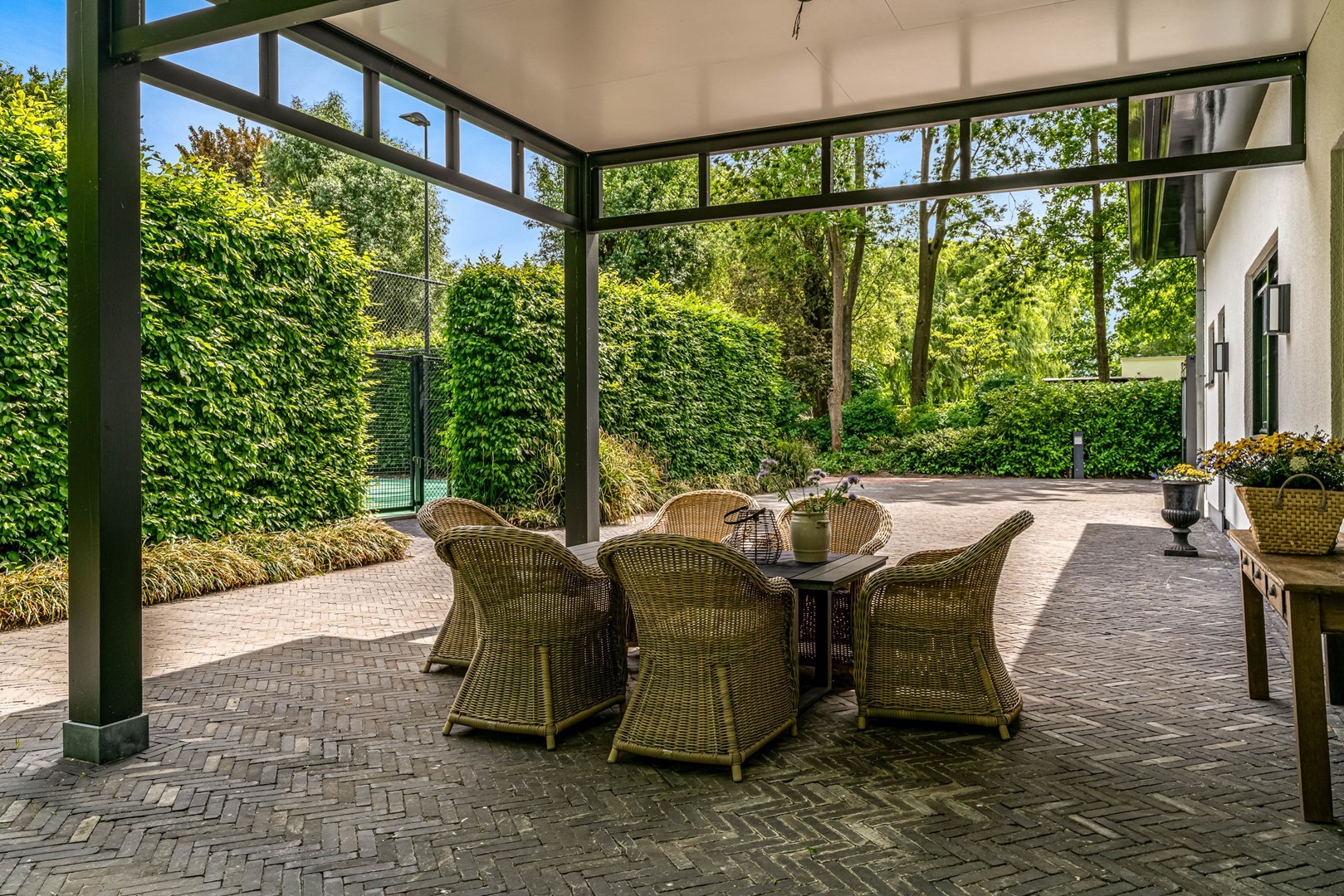 - overdekt terras bij bijgebouw met uitzicht op privétennisbaan (met verlichting);