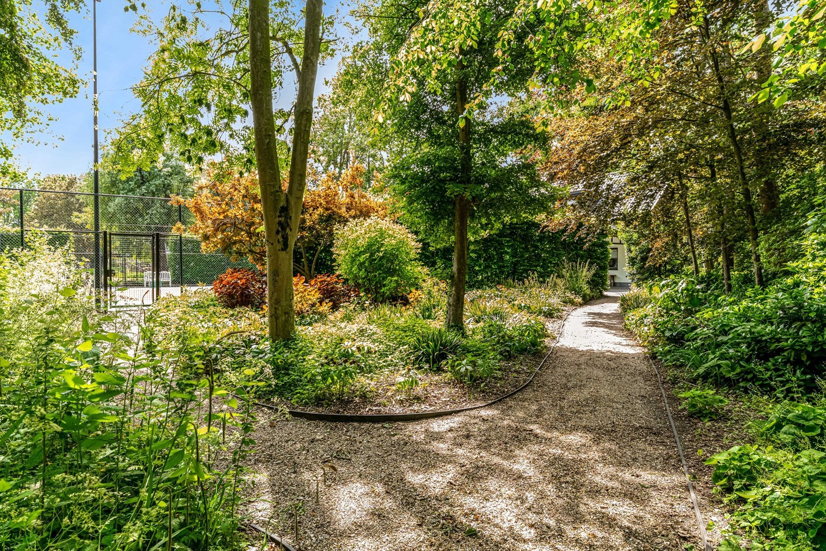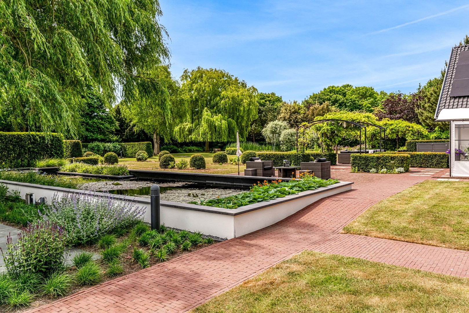 - onder architectuur aangelegde parkachtige tuin - voorzien van tuinberegeningssysteem - met vijver, speeltuin, wandelpaden en bruggetjes;
