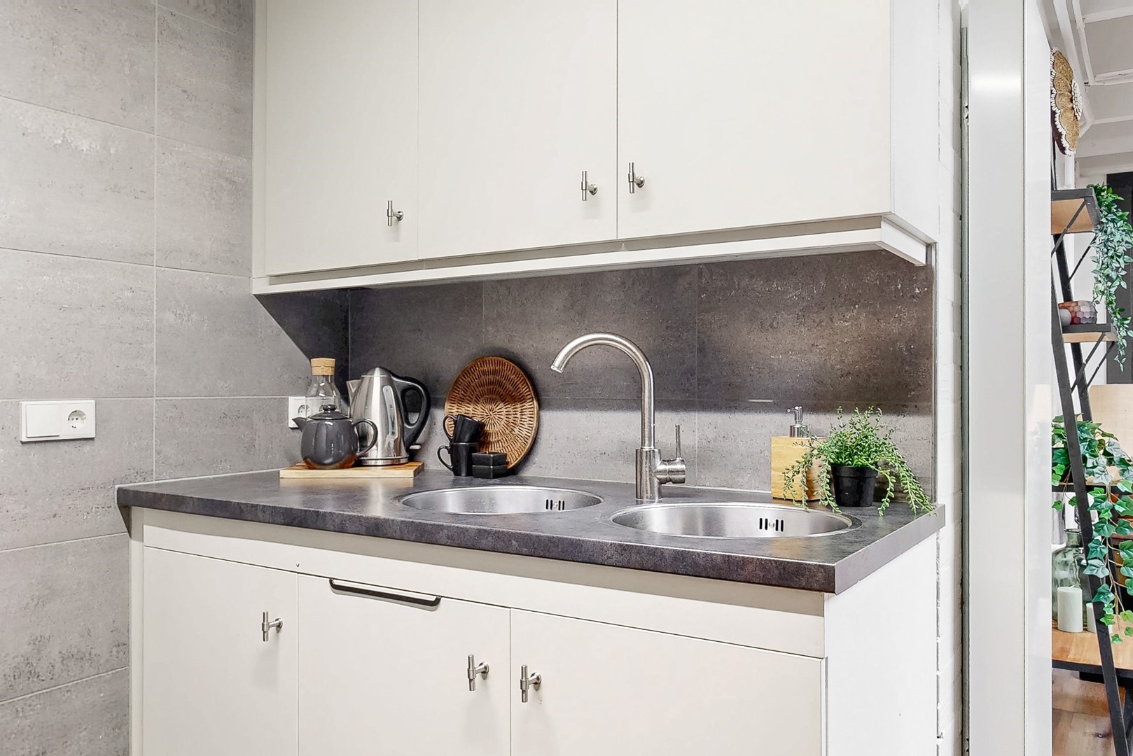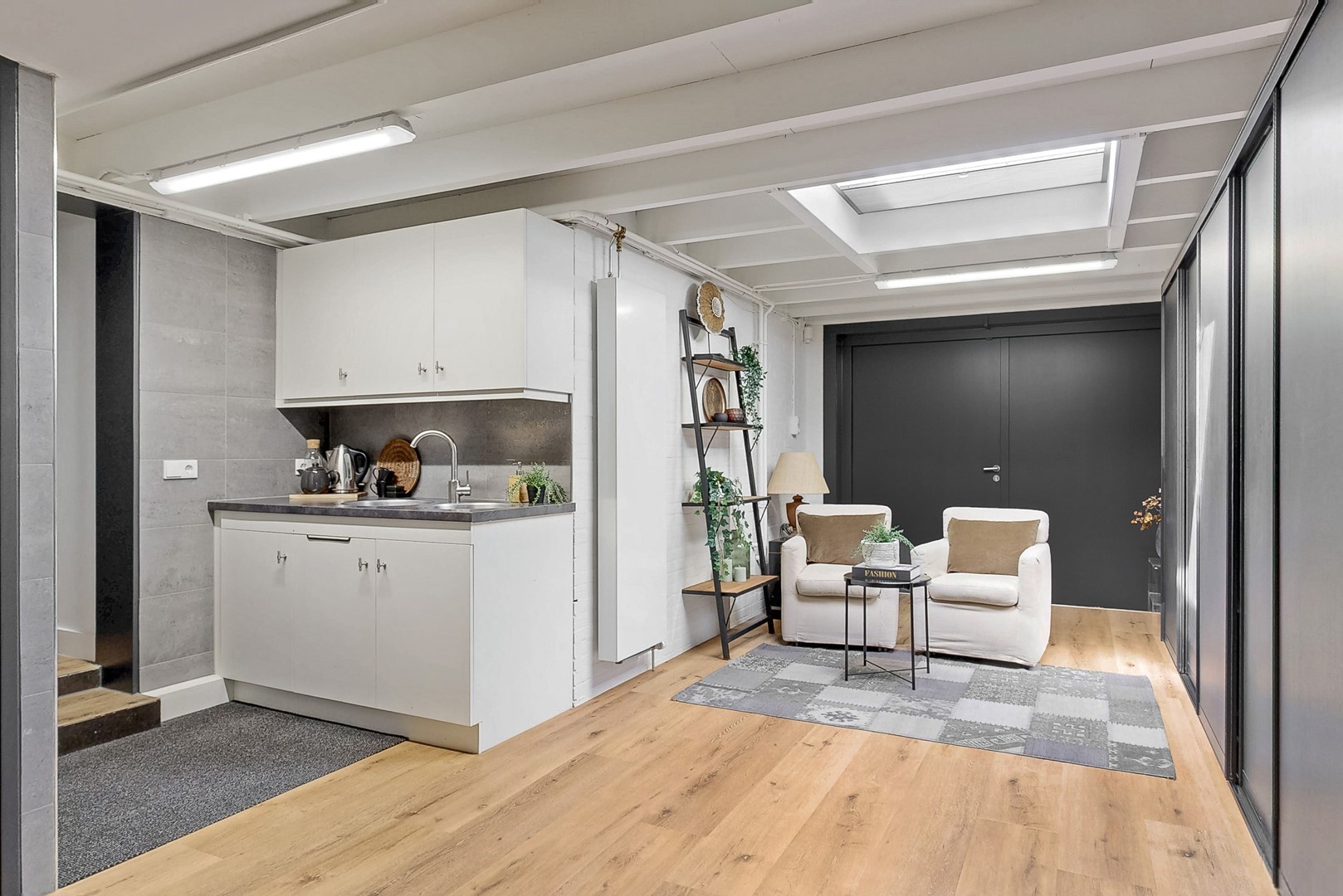 - zit-/werkkamer, bijkeuken en extra leefruimte met keukenblok en badkamer;