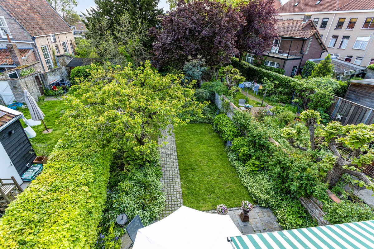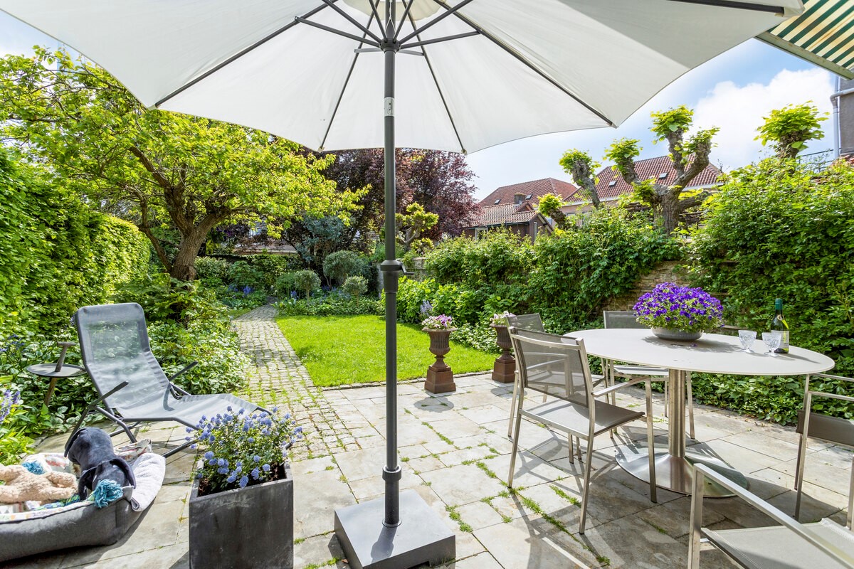 De openslaande deuren geven toegang tot de diepe, verrassend brede tuin op het zuiden. Hier vind je romantische paadjes, idyllische muurtjes, veel groen, een houten schuurtje en als eyecatcher: een ruim 400 jaar oude moerbeiboom. Wat een plek!