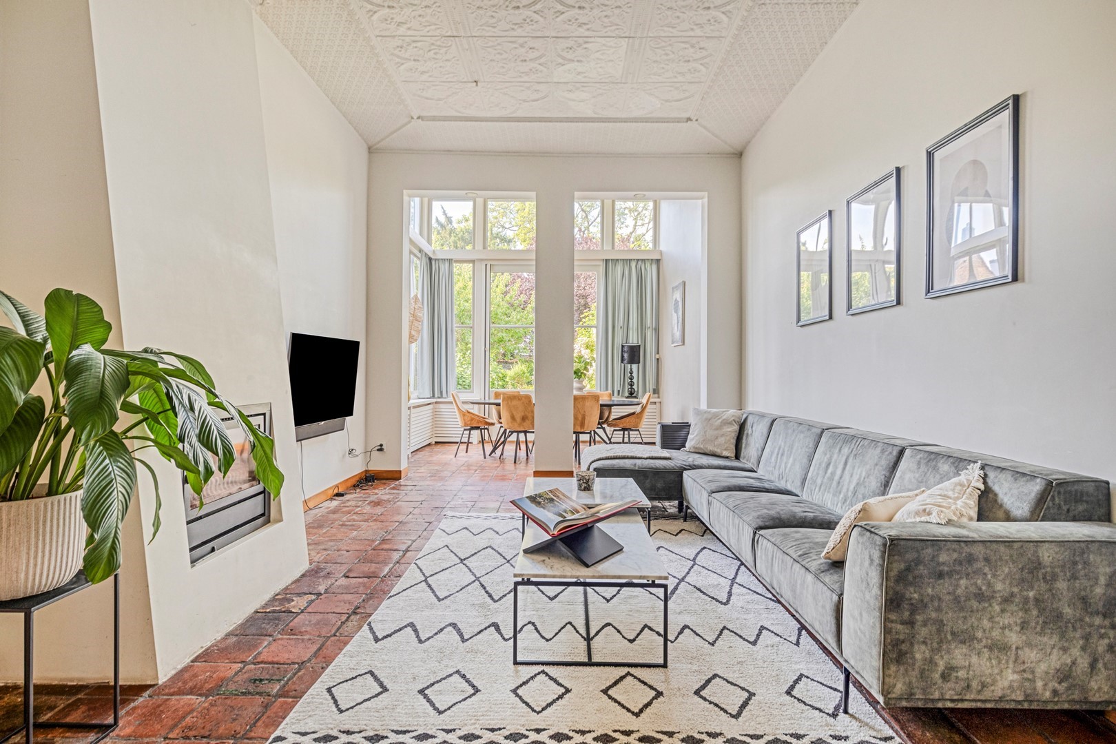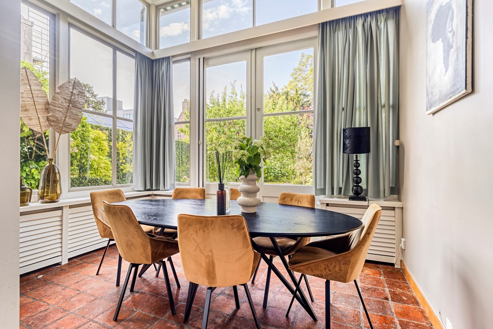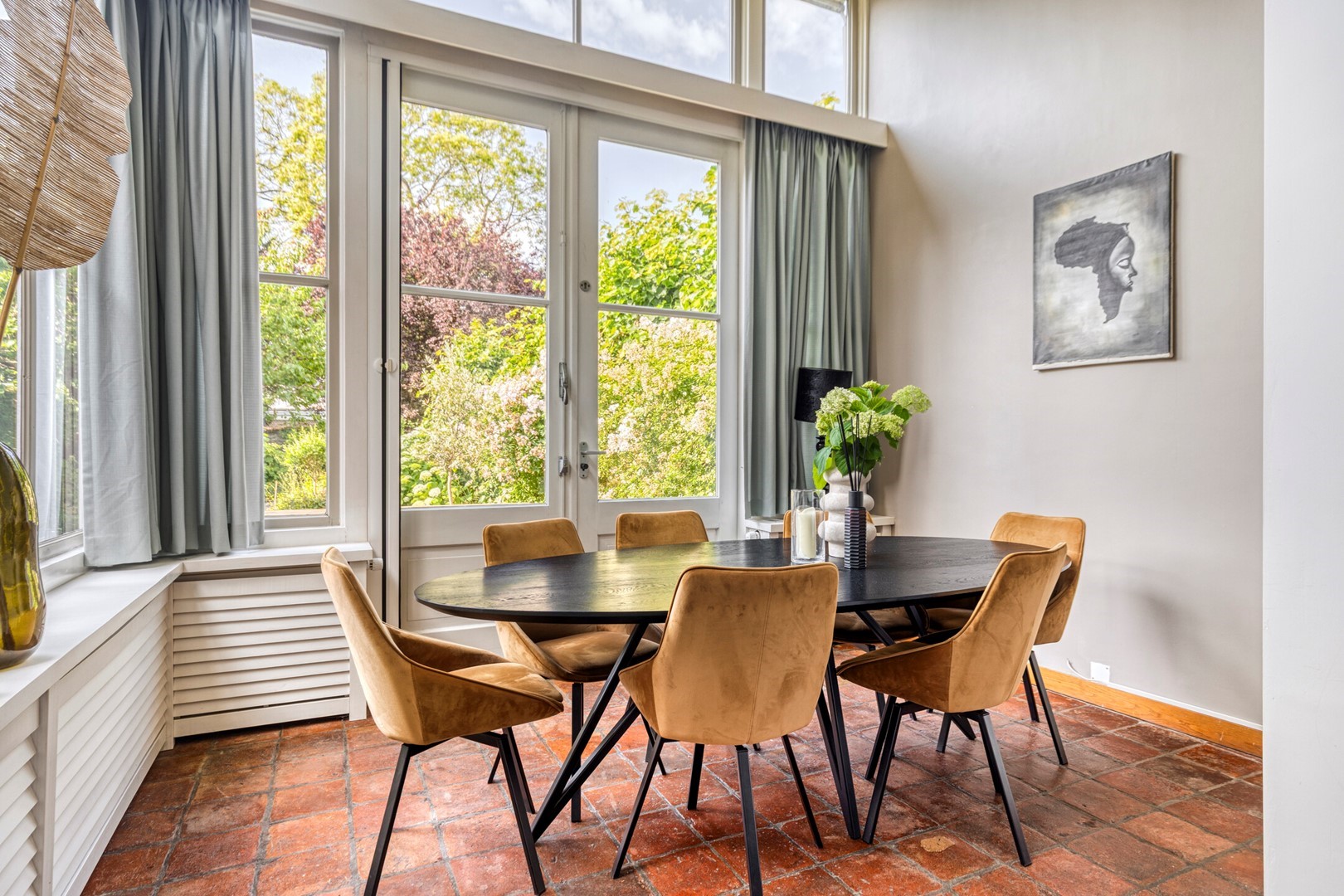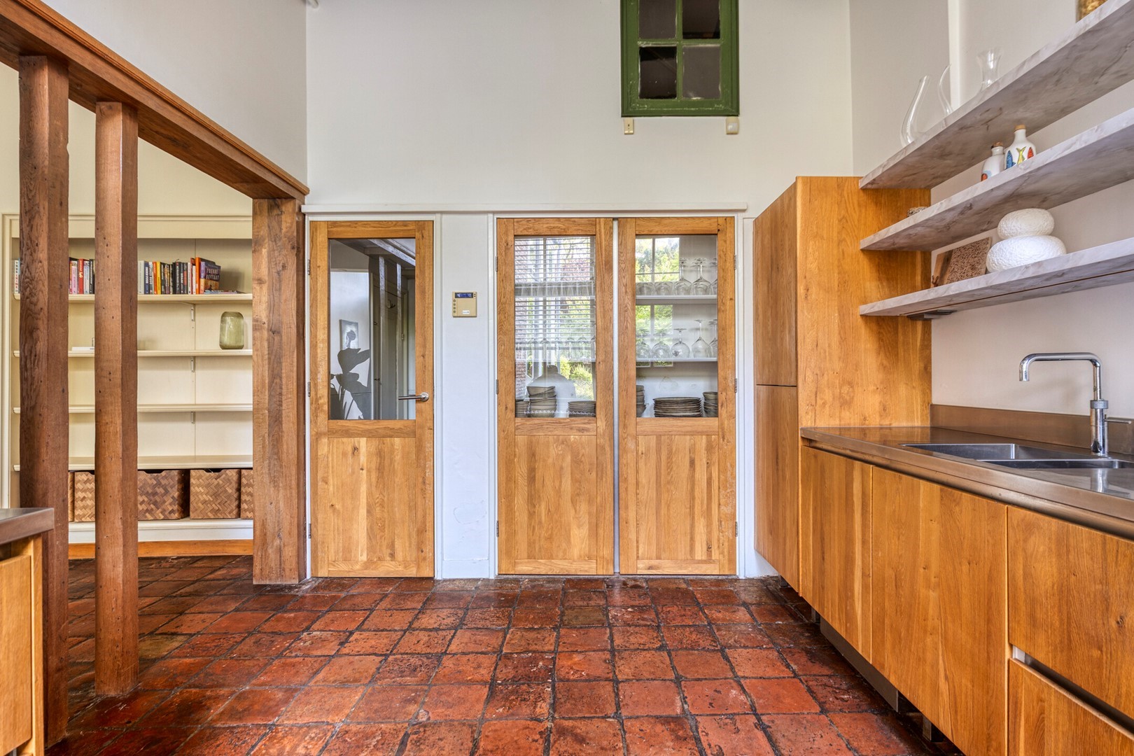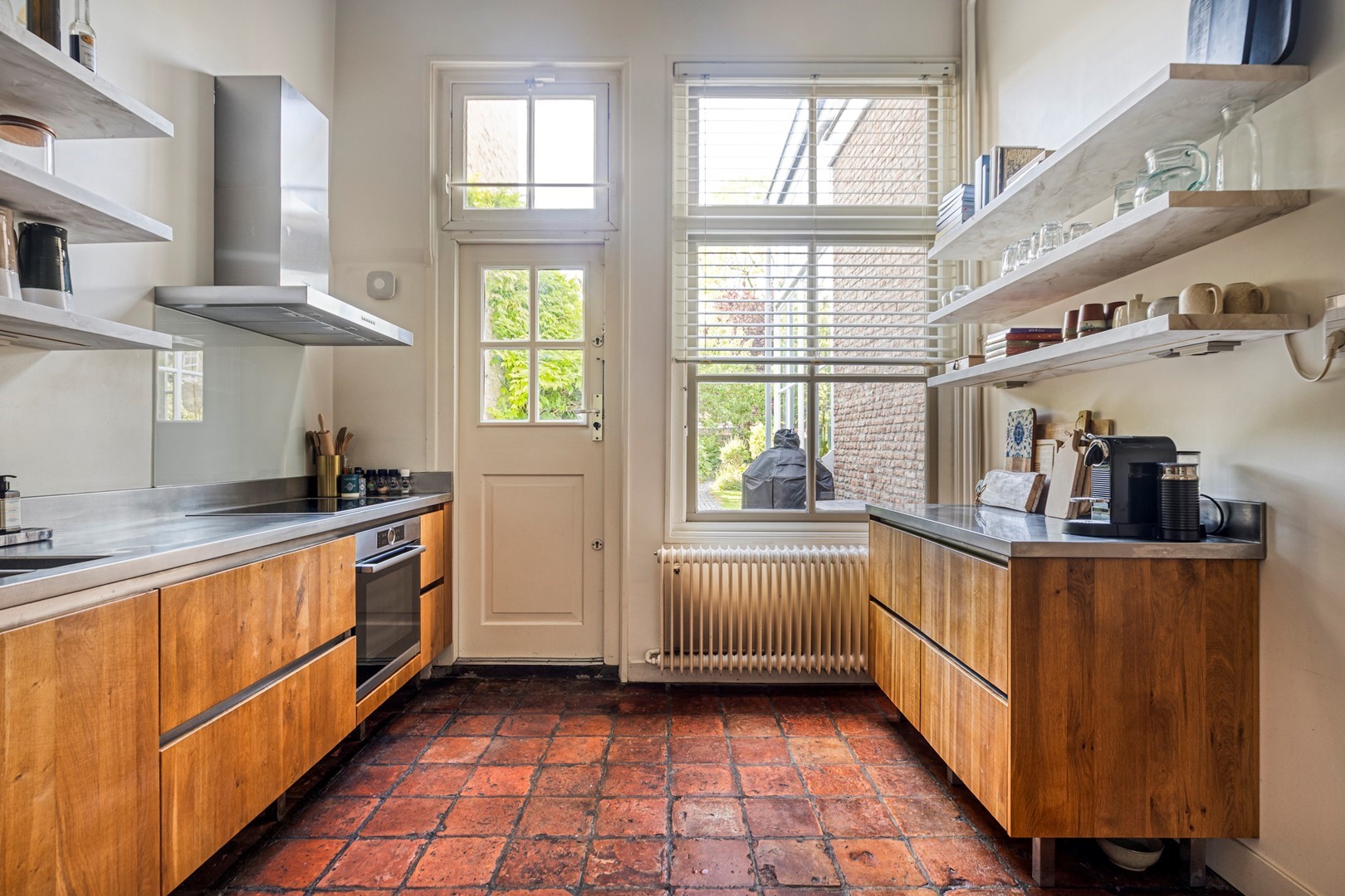 Aan de tuinzijde ligt de royale living met tuinkamer/serre en deels open keuken. De hoogte (tot wel 4,20 meter!), het tinnen plafond, de moderne open haard en de plavuizen vloer zorgen voor een warme, elegante uitstraling. De keuken is voorzien van een strak RVS werkblad en beschikt over alle gewenste inbouwapparatuur. Aangrenzend bevindt zich de ruime bijkeuken/wasruimte.