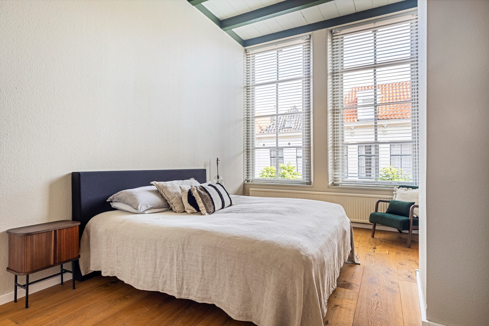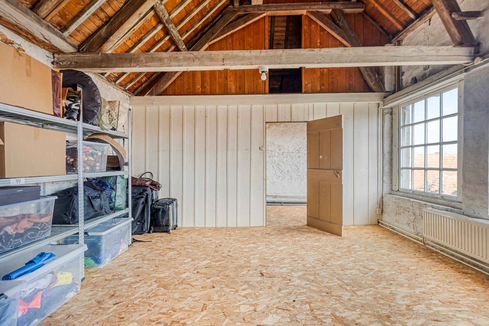 De tweede verdieping beschikt over een vierde slaapkamer met veel bergruimte. Daarnaast bevinden zich hier nog twee extra kamers, ideaal als atelier, logeer- of werkkamers. Dankzij de hoge balkenconstructie en dakkapel ontstaat een sfeervolle, multifunctionele verdieping, eenvoudig om te bouwen tot twee volwaardige slaapkamers en een derde badkamer.