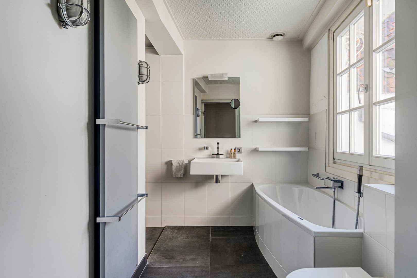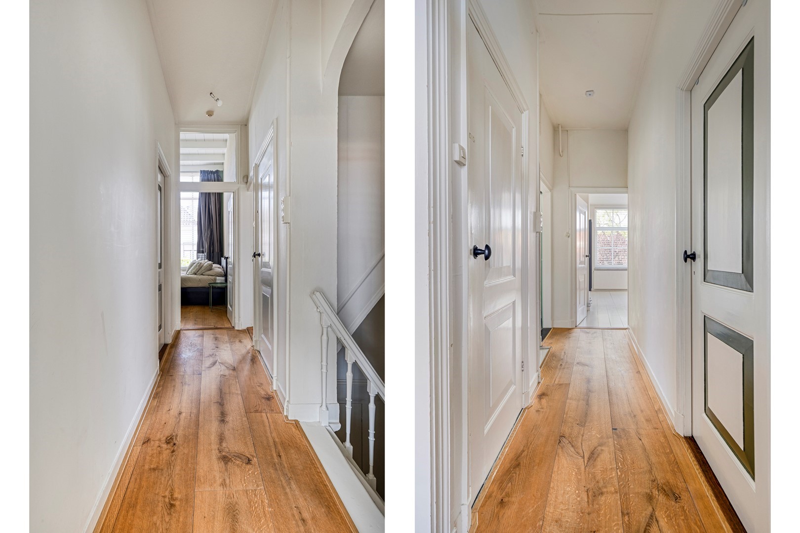 Via een stijlvolle trap met tussenbordes en kastruimte kom je op de eerste verdieping. Aan de straatzijde bevinden zich twee royale slaapkamers (ca. 19 en 17 m²) met uitzicht op de rustige Poststraat. Aan de tuinzijde ligt een derde slaapkamer (ca. 18 m²) met eigen badkamer en inloopkast. De grote tweede badkamer is voorzien van een ligbad, aparte douche, tweede toilet en wastafel, met uitzicht op het groen.
