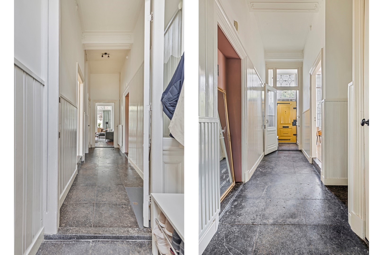 Via een indrukwekkende houten voordeur betreed je de hal, met direct zicht op de fraaie hardstenen vloer. Vanuit de hal bereik je de toiletruimte en de spectaculaire ‘gelagkamer’: Een riante ruimte met ca. 3,70 meter hoge plafonds, drie grote raampartijen, marmeren schouw, rijk geornamenteerd plafond en houten lambriseringen. Deze kamer ademt sfeer en historie.