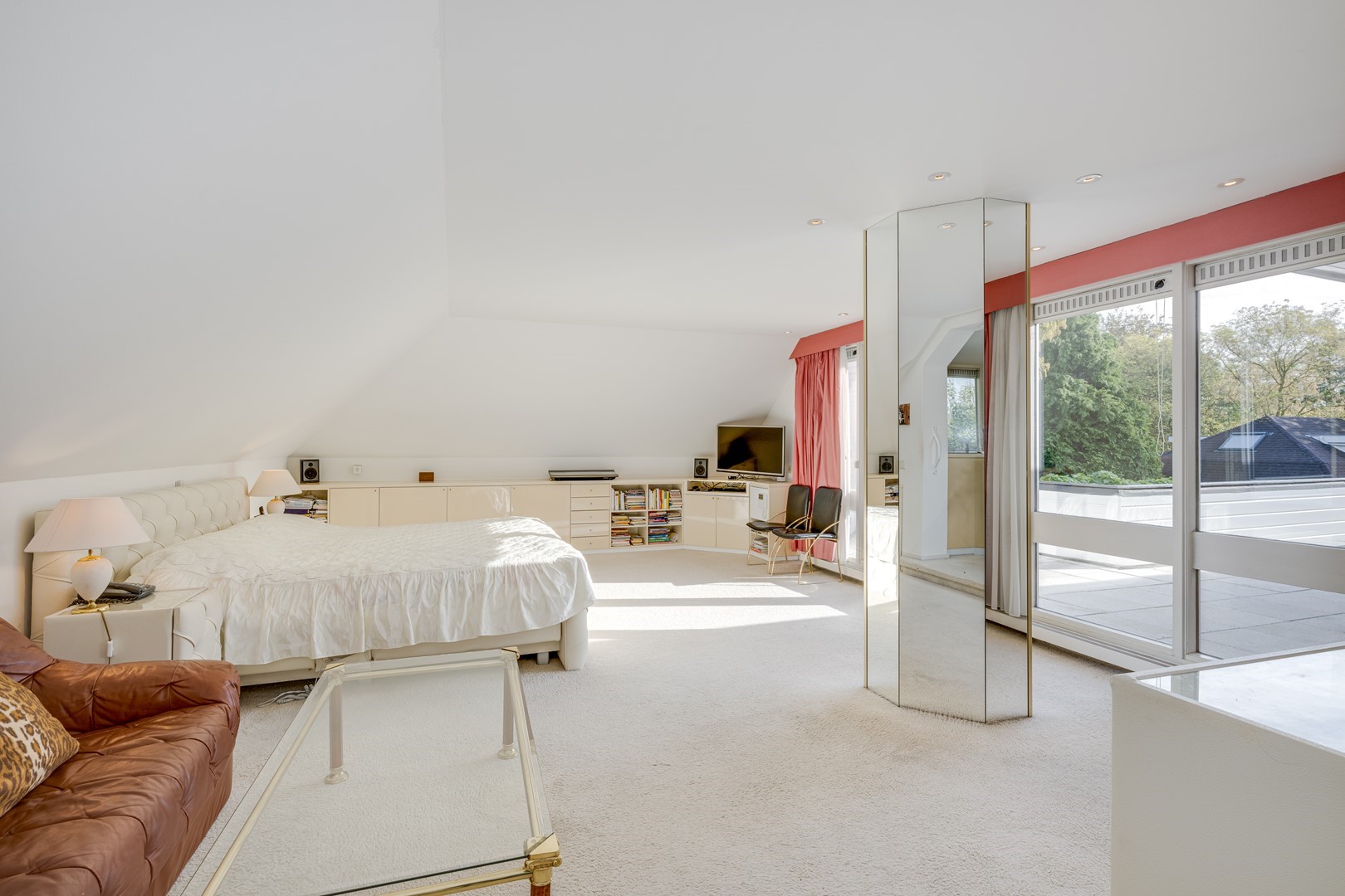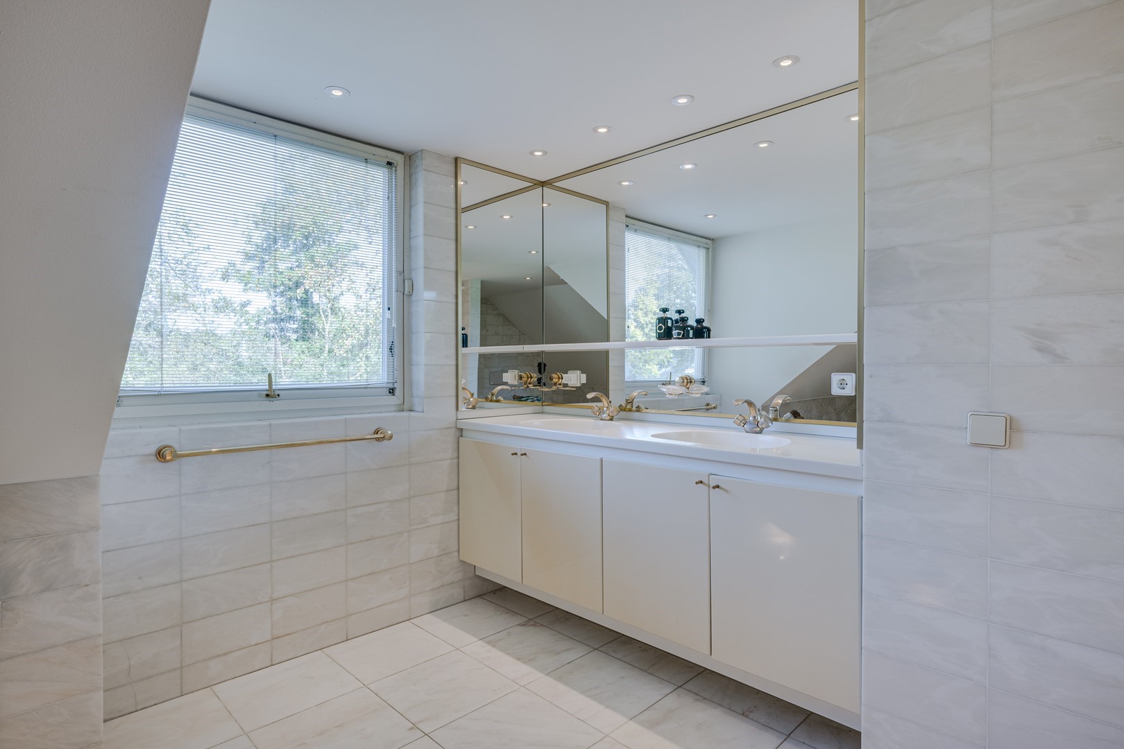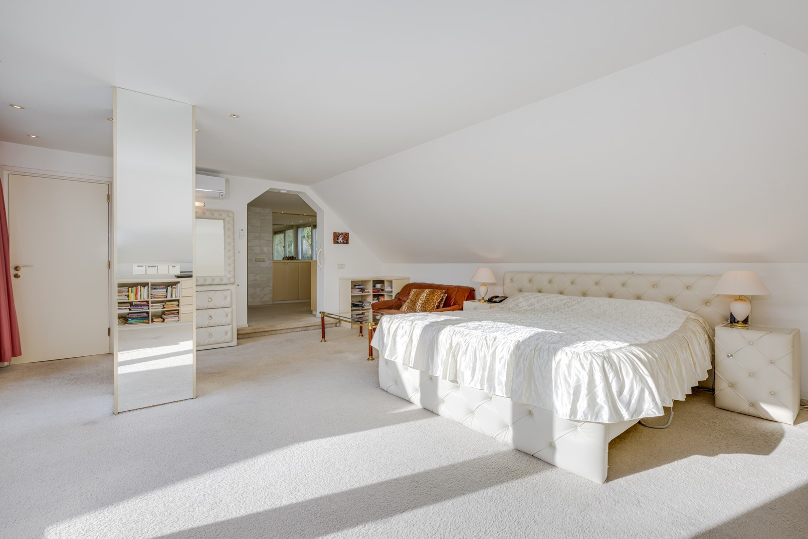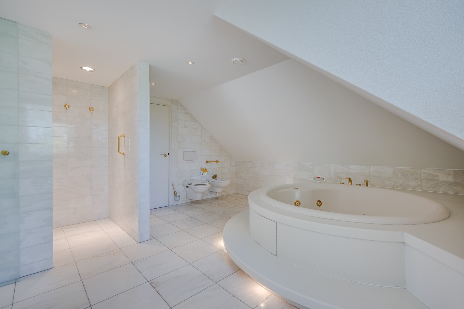 Eerste verdieping: de overloop geeft toegang tot 2 slaapkamers met een gedeelde badkamer, ieder met toegang tot het dakterras. Aan de andere zijde van de overloop bevindt zich de zeer ruime ouderslaapkamer voorzien van vaste kasten en een riante badkamer en-suite. Het eerste deel betreft een walk-in kleedruimte; in het tweede deel treft u het bad/jacuzzi, een dubbele wastafel, toilet en bidet alsmede toegang tot een tweede kleedruimte/solarium. Ook de master-bedroom heeft toegang tot het grote dakterras.