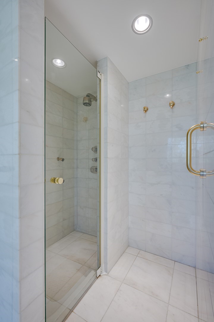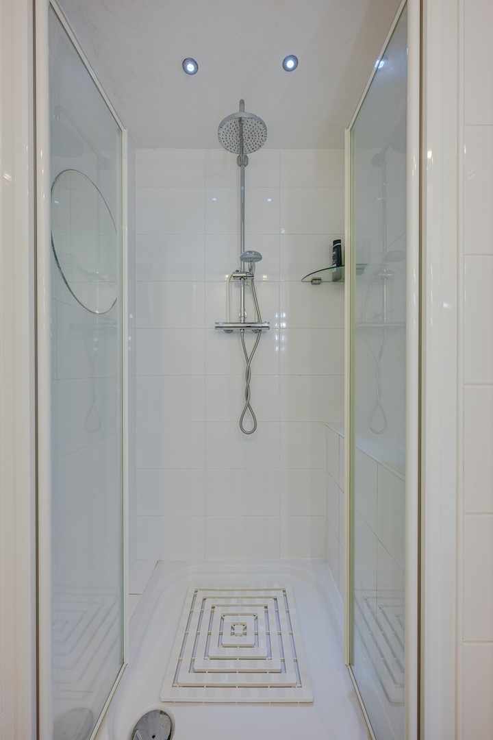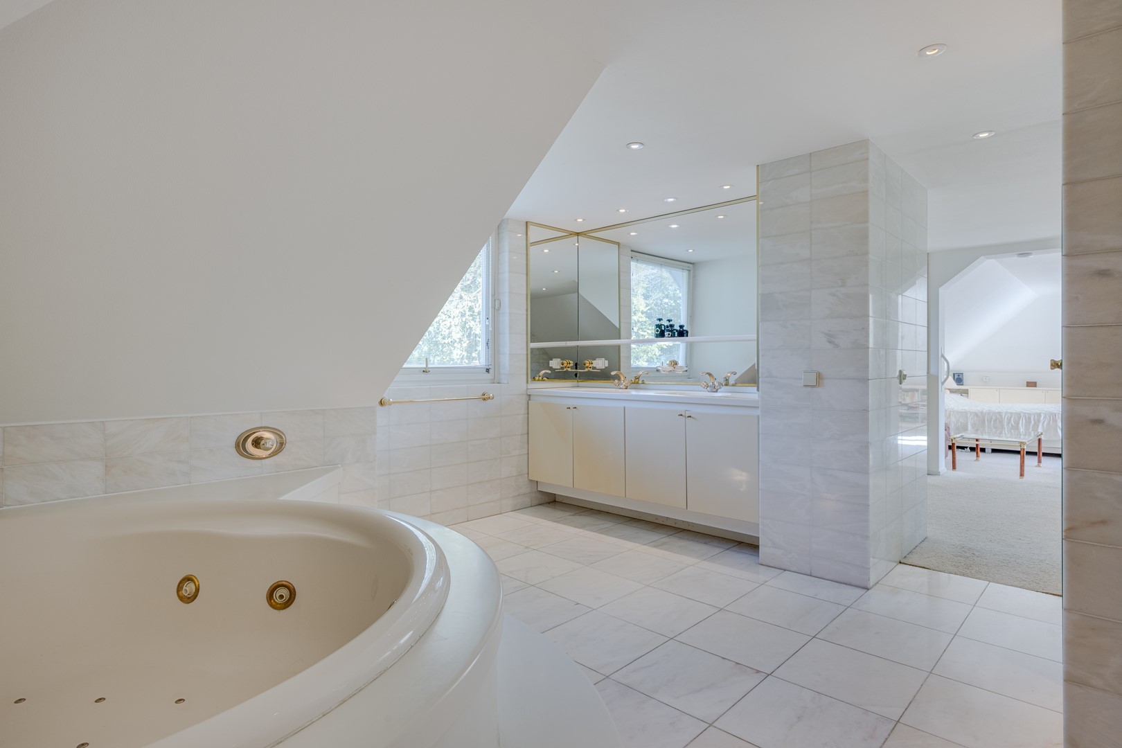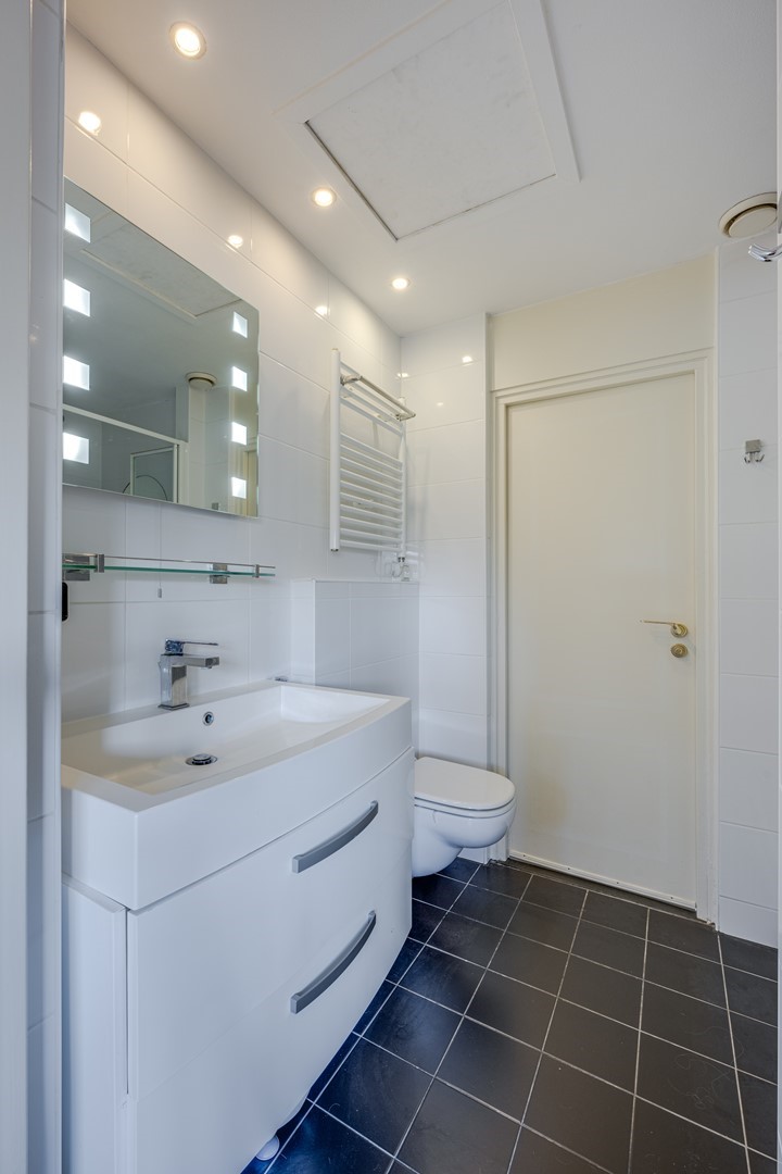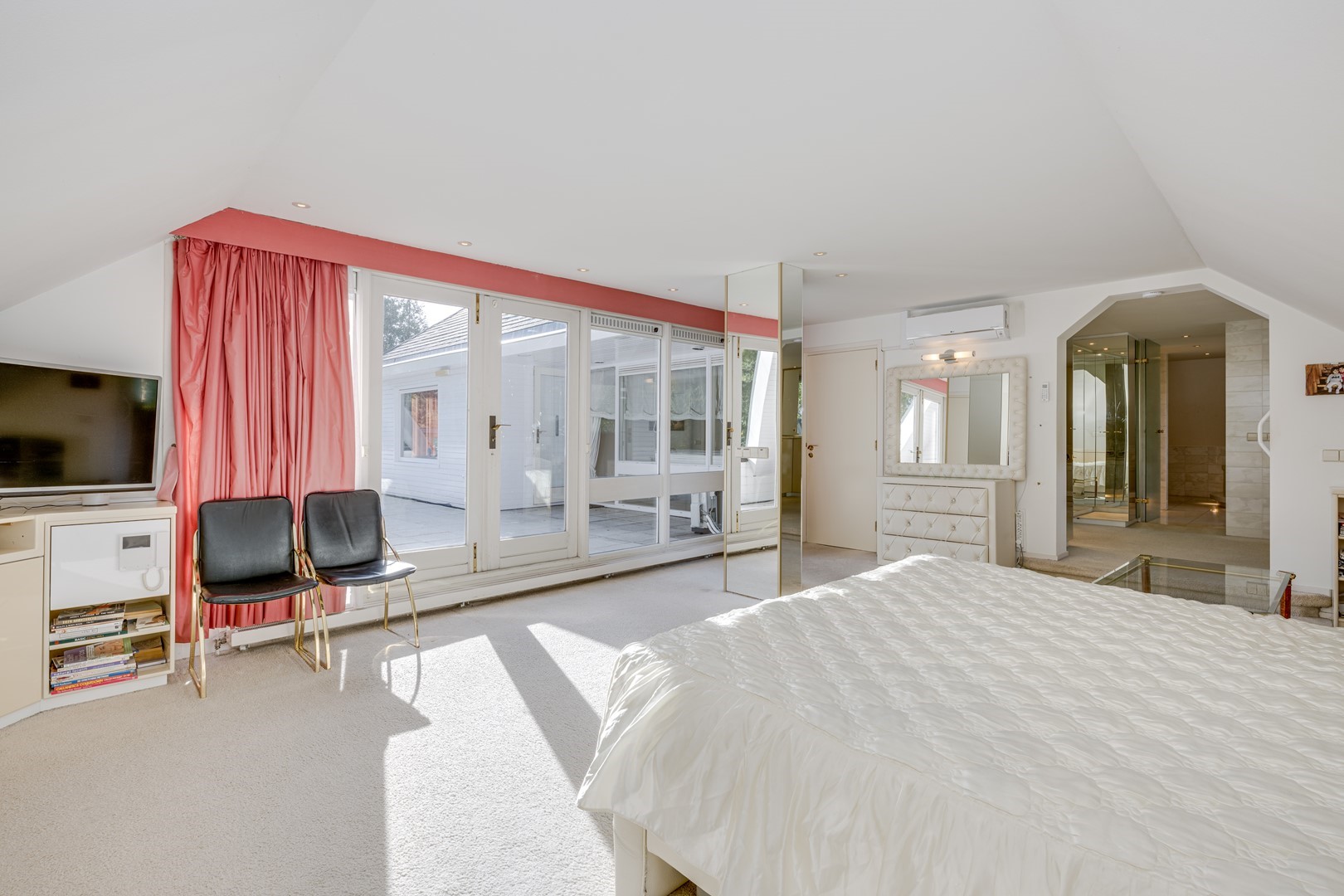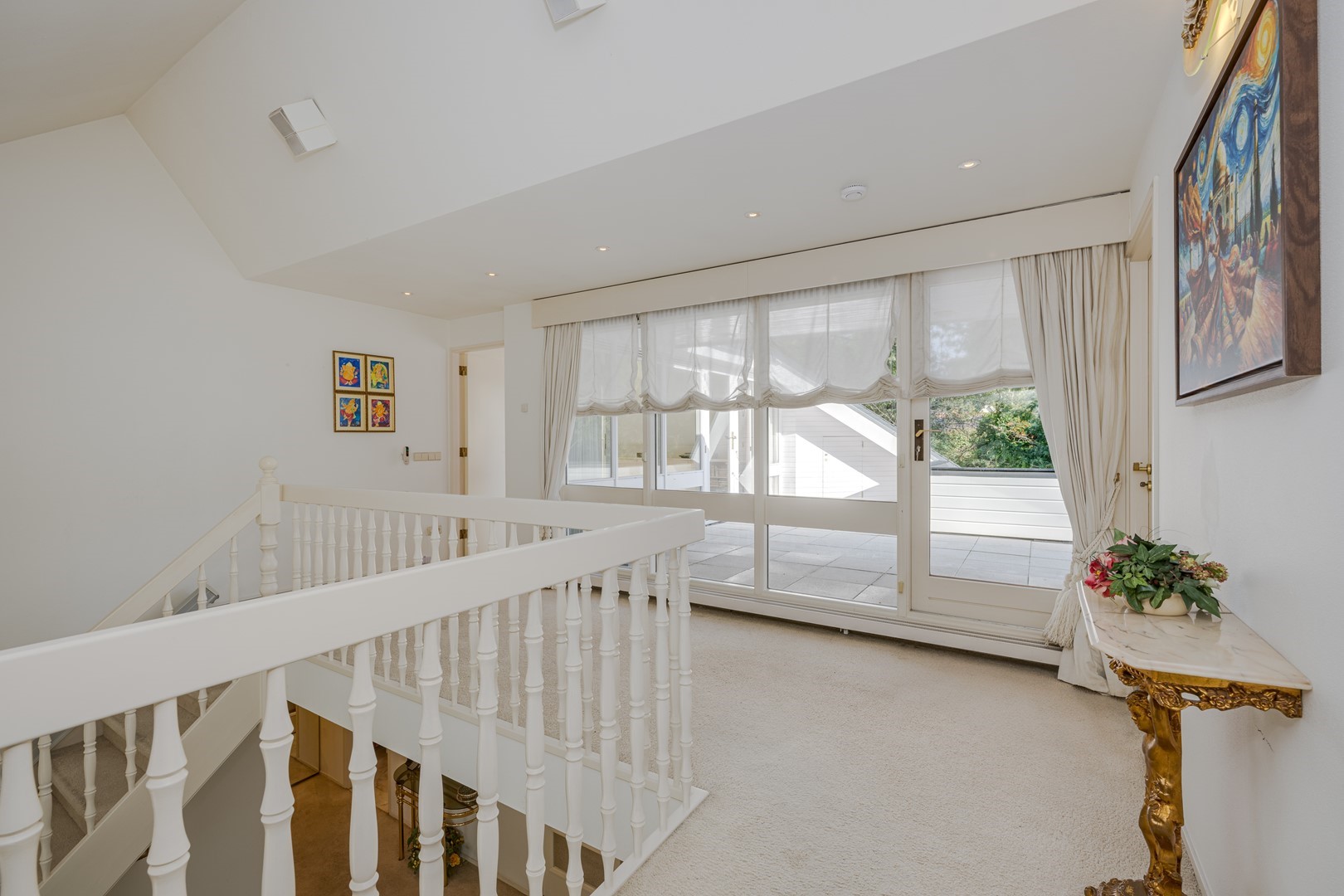 Eerste verdieping: de overloop geeft toegang tot 2 slaapkamers met een gedeelde badkamer, ieder met toegang tot het dakterras. Aan de andere zijde van de overloop bevindt zich de zeer ruime ouderslaapkamer voorzien van vaste kasten en een riante badkamer en-suite. Het eerste deel betreft een walk-in kleedruimte; in het tweede deel treft u het bad/jacuzzi, een dubbele wastafel, toilet en bidet alsmede toegang tot een tweede kleedruimte/solarium. Ook de master-bedroom heeft toegang tot het grote dakterras.