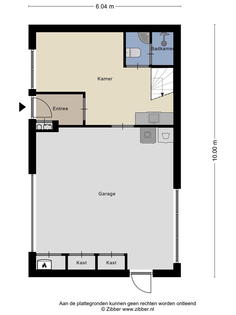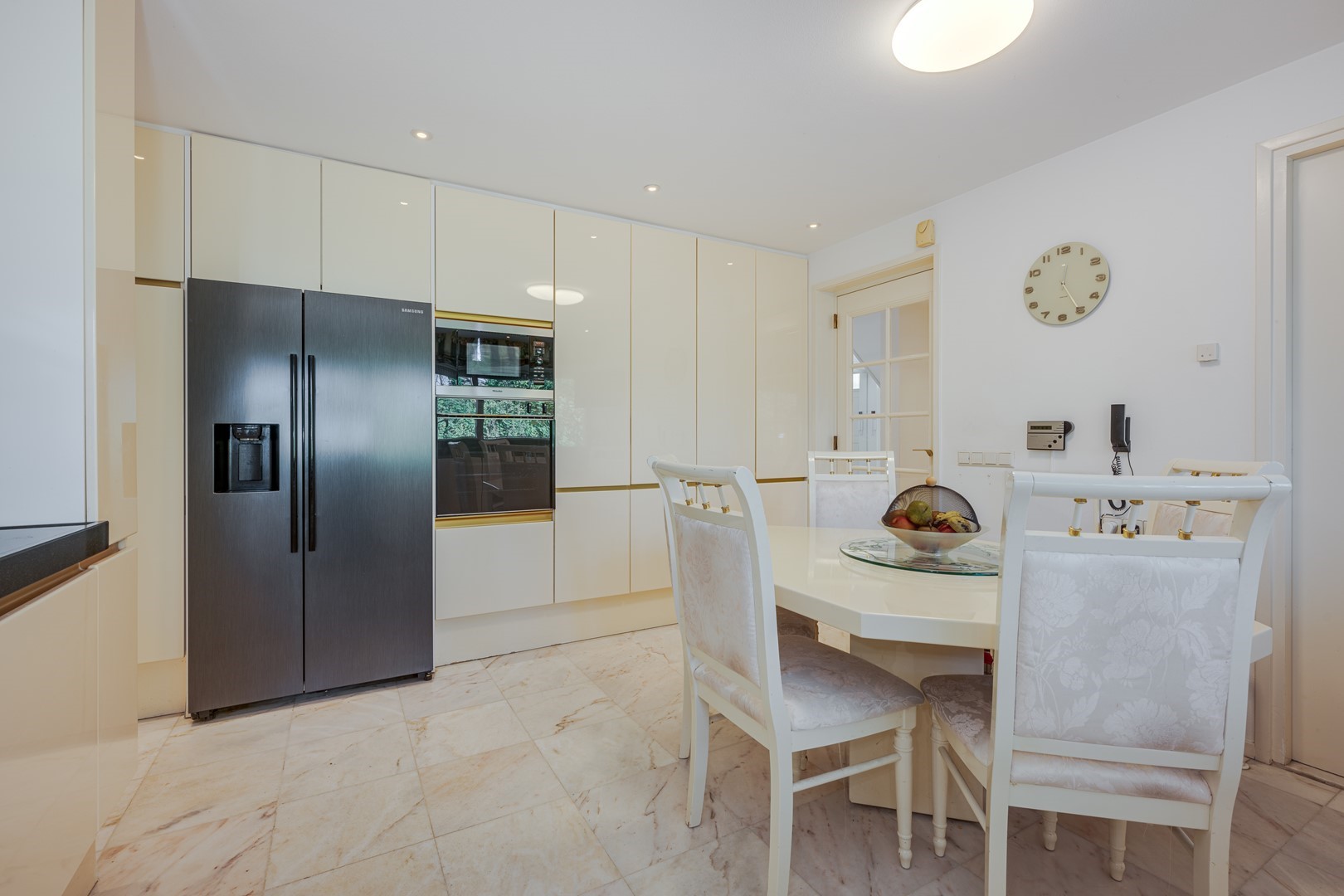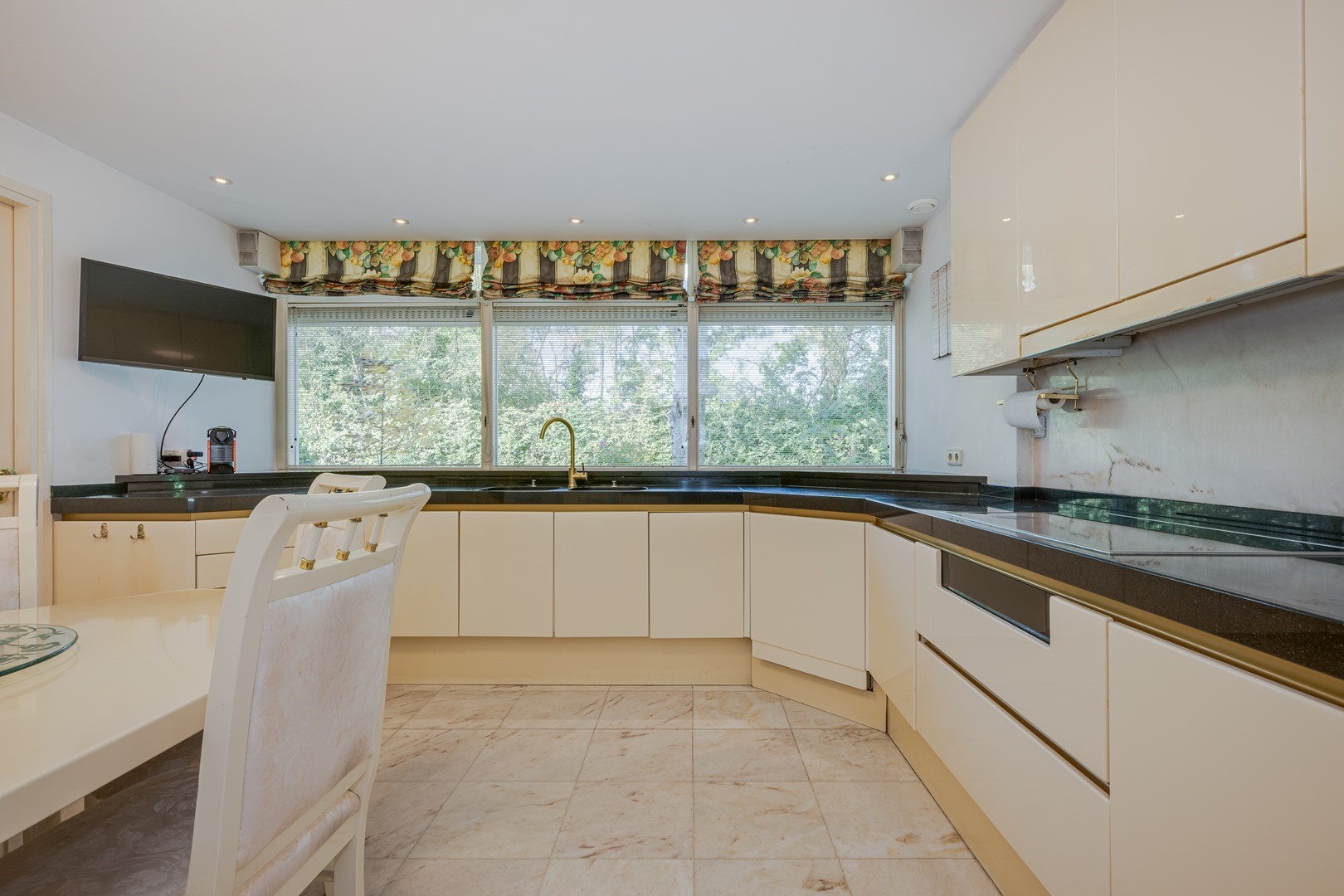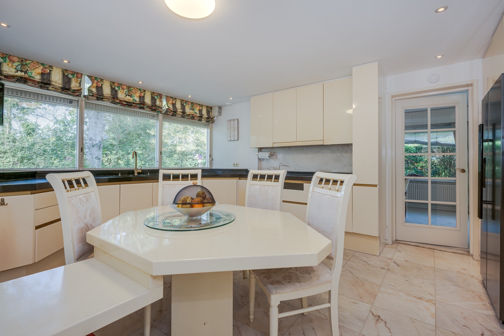 De eetkamer staat in verbinding met de ruime keuken, die is voorzien van Miele-apparatuur. Naast de keuken bevindt zich de bijkeuken, die tevens dienst doet als ‘achterom’-entree. Naast de entree bevindt zich een gang met het gastentoilet en een inpandige berging met o.a. de CV-opstelling. Tenslotte bevindt zich op de begane grond een ruime slaapkamer met vaste kastenwand en eigen badkamer en-suite met bad en wastafel.