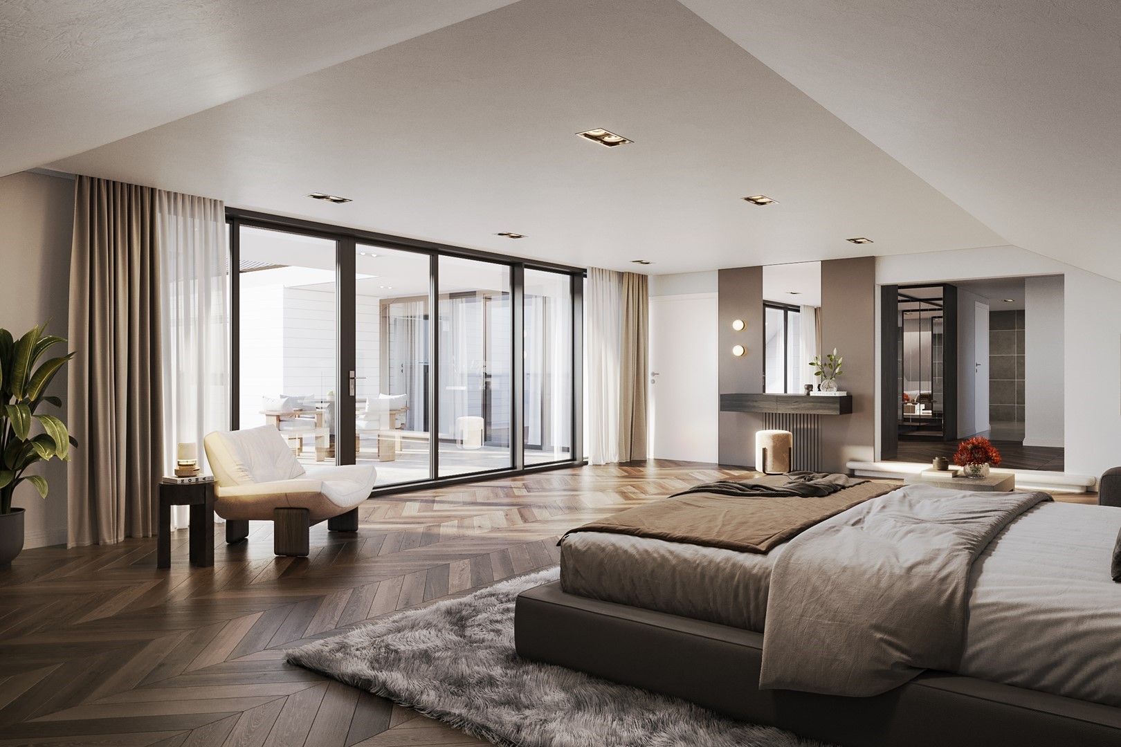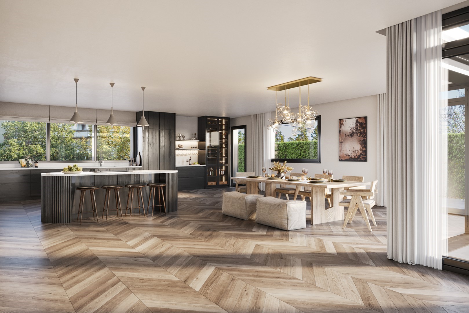 Vanuit ieder vertrek geven schuifpuien toegang tot de terrassen rondom de woning.