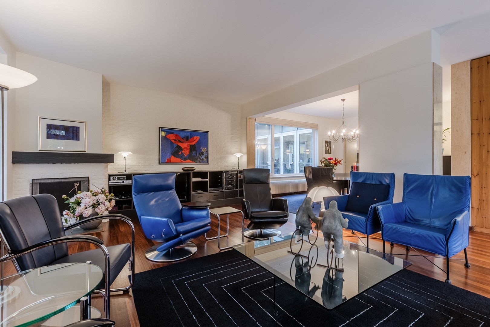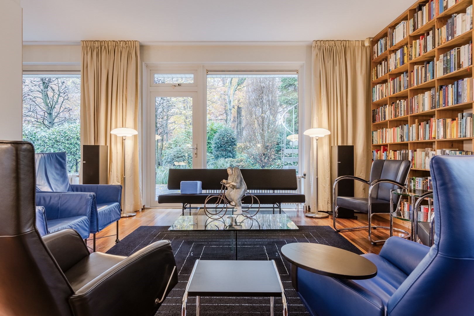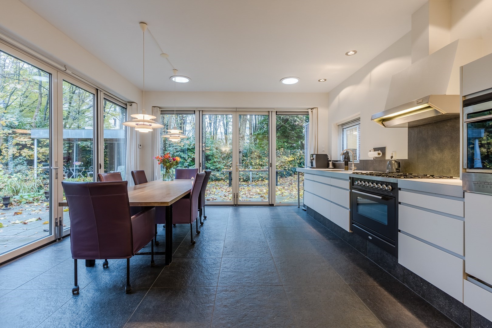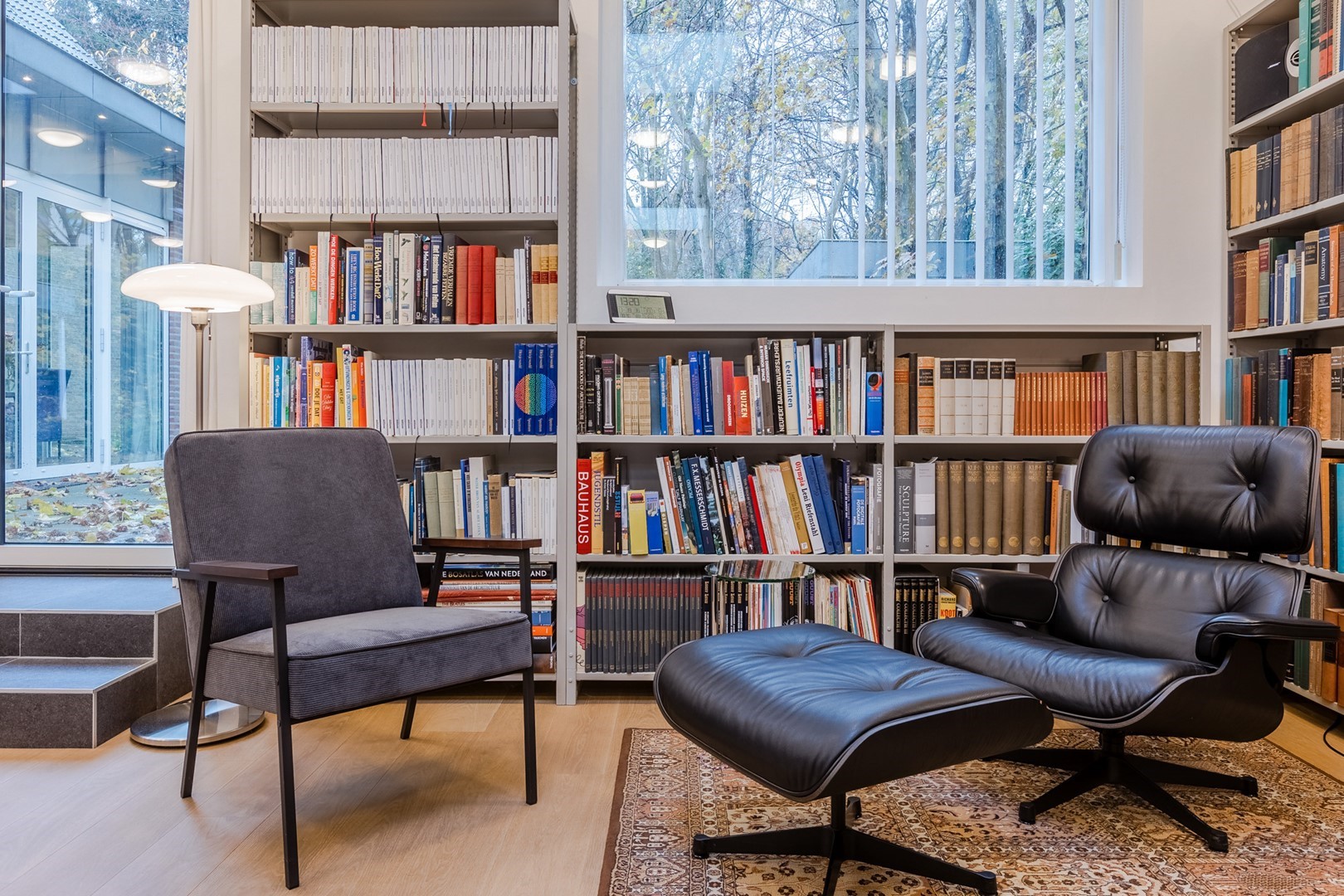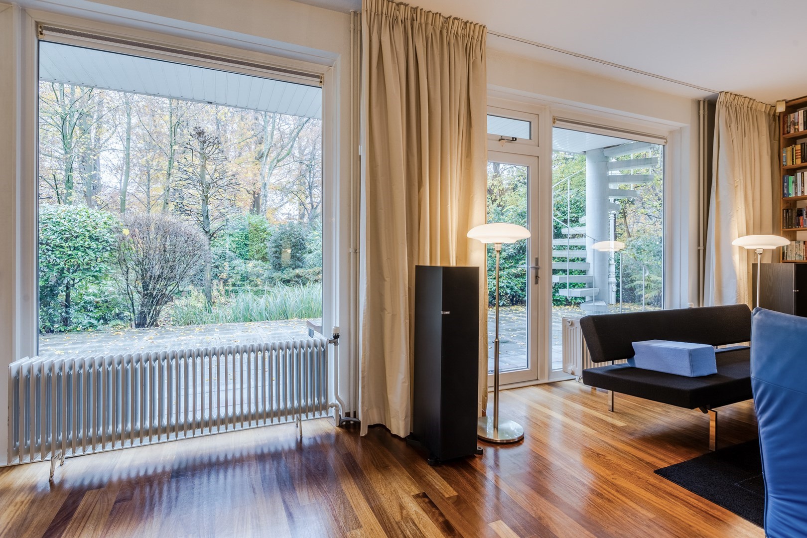 Het royale woonhuis heeft twee aparte ingangen. De entree van de woonruimte biedt toegang tot de trapopgang naar de eerste verdieping, de trap naar de kelder, de woonkamer en de keuken. De ruime woonkamer is van de hal gescheiden door een originele bij de bouw al aangebrachte stalen deur. De massief hardhouten parketvloer, strakke wanden, hoge plafonds, en de ramen rondom laten een prettig licht binnenstromen. De sfeervolle open haard en de openslaande deuren naar de voortuin maken elk seizoen er prettig toeven. De ruime uitgebouwde woonkeuken heeft een donkere tegelvloer met vloerverwarming en grote raampartijen met openslaande deuren. Het ruime aanrecht met alle apparatuur voorhanden en de grote bergkasten maken het hier in gezelschap samenzijn, koken en eten tot een aangename bezigheid.