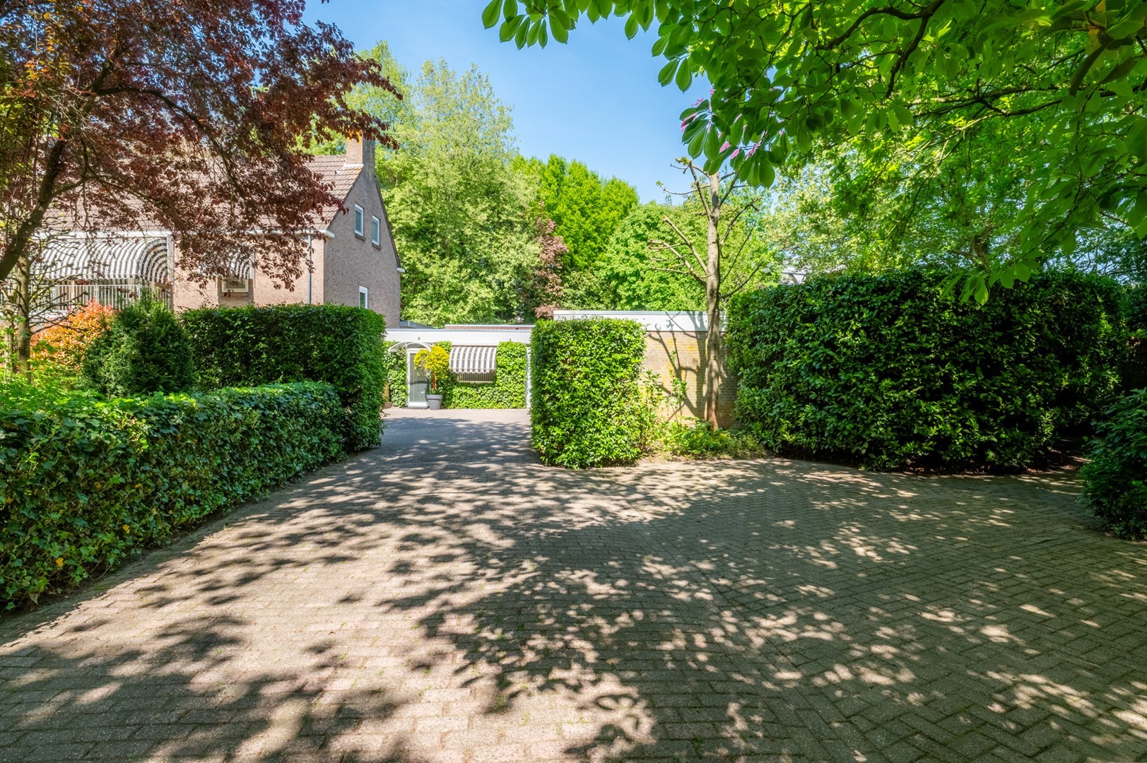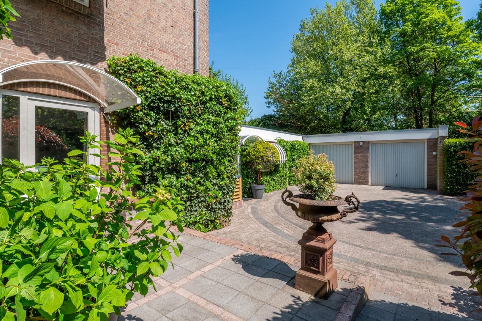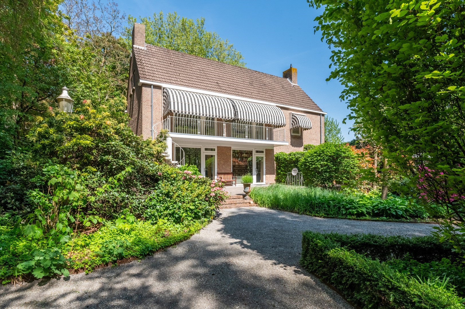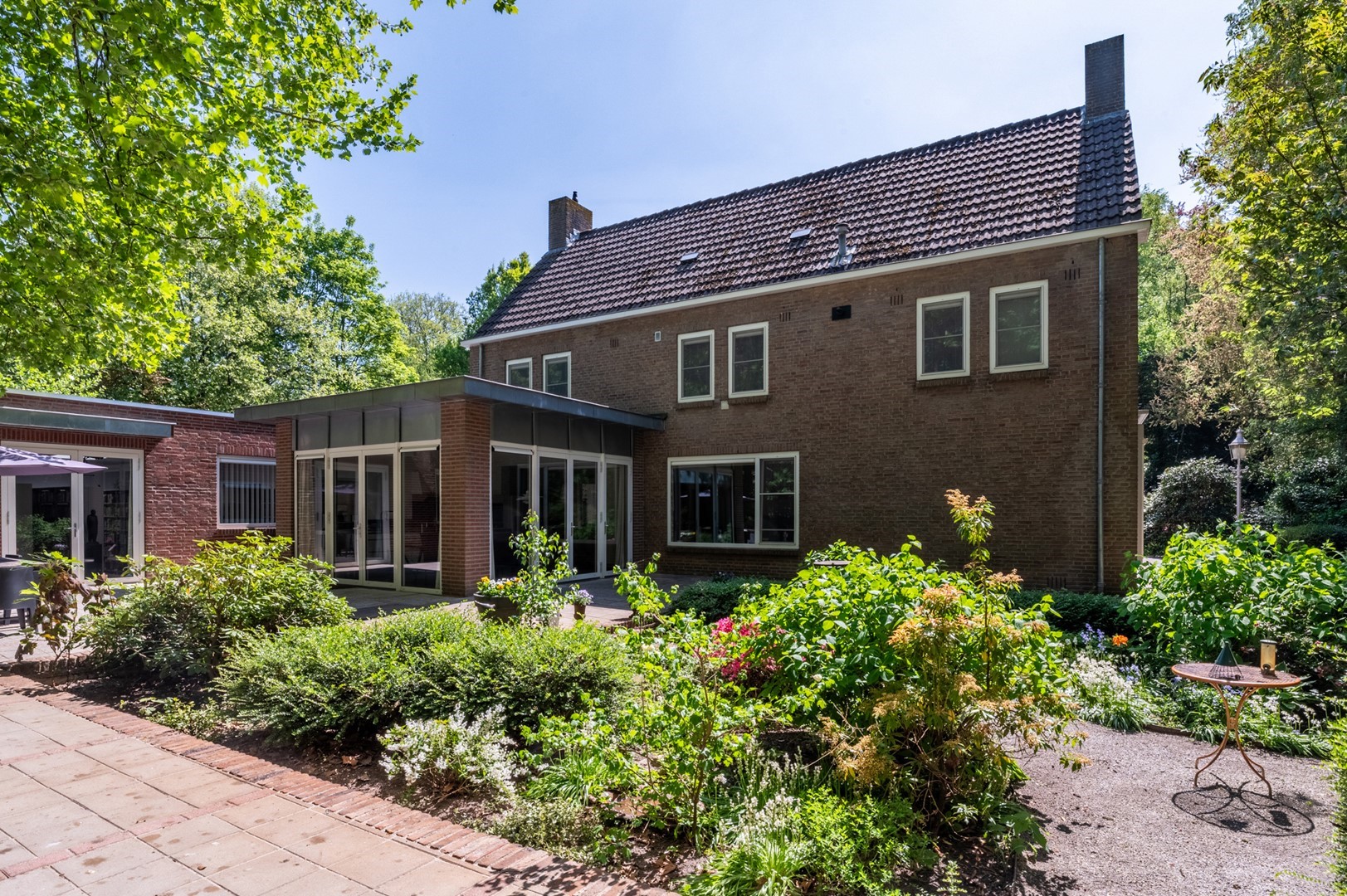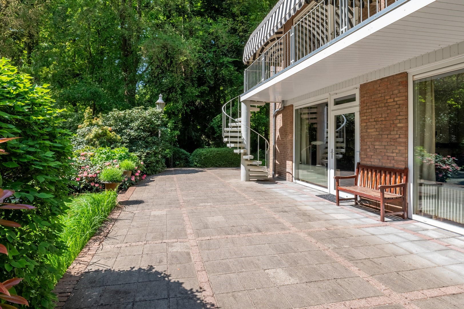De grote tuin rondom de woning heeft meerdere terrassen. De begroeiing biedt in de zomer zoveel privacy dat op meerdere plekken onbespied kan worden genoten van het buitenzijn. Het prieel, het overdekte terras van 3 bij 6 meter, biedt al vroeg in het voorjaar een heerlijke plek om te vertoeven. Het hele jaar door is er als de zon schijnt op meerdere plekken zowel zon als weldadige schaduw te vinden. De tuin is geheel met omheining afgesloten van het park, maar door de begroeiing vormt het met dat park een schitterende eenheid.