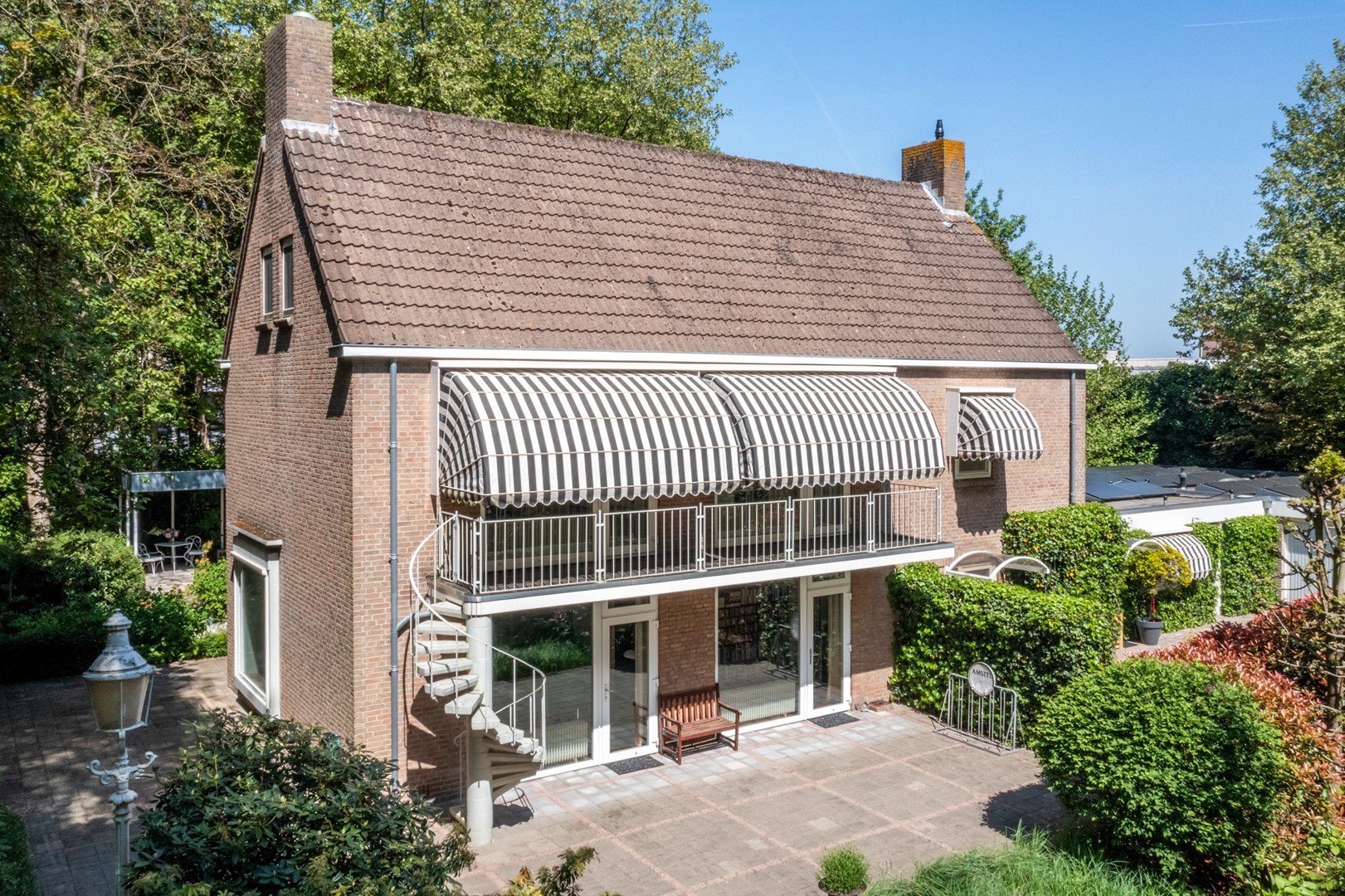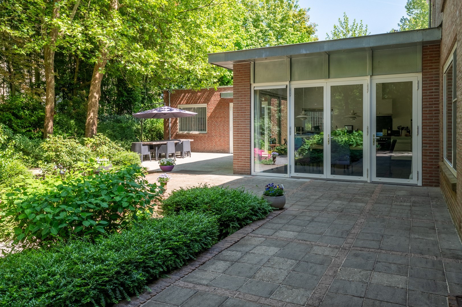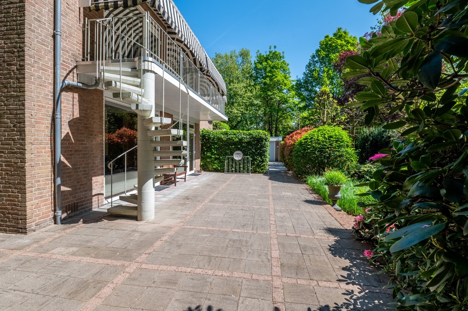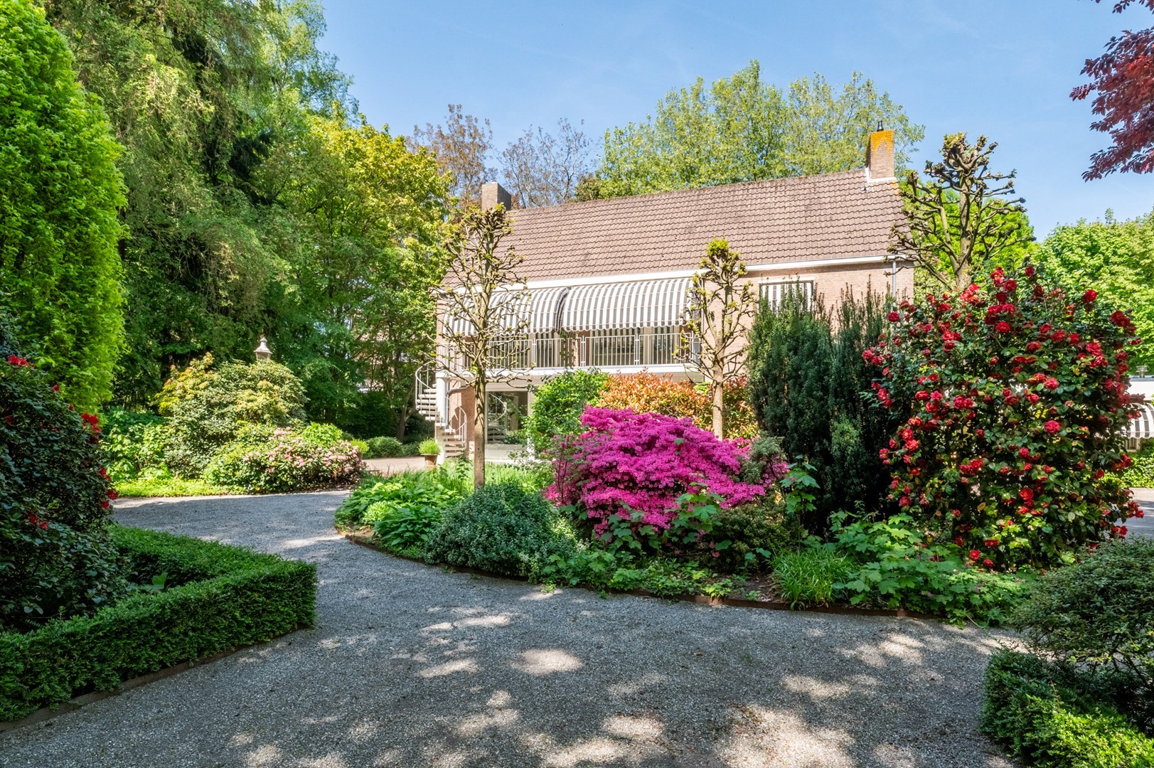 De grote tuin rondom de woning heeft meerdere terrassen. De begroeiing biedt in de zomer zoveel privacy dat op meerdere plekken onbespied kan worden genoten van het buitenzijn. Het prieel, het overdekte terras van 3 bij 6 meter, biedt al vroeg in het voorjaar een heerlijke plek om te vertoeven. Het hele jaar door is er als de zon schijnt op meerdere plekken zowel zon als weldadige schaduw te vinden. De tuin is geheel met omheining afgesloten van het park, maar door de begroeiing vormt het met dat park een schitterende eenheid.